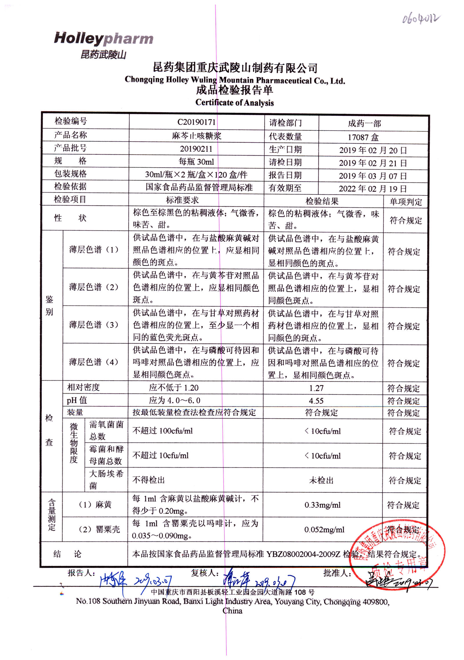 麻芩止咳糖浆 | 30ml | 20190211 | 查看详情 |