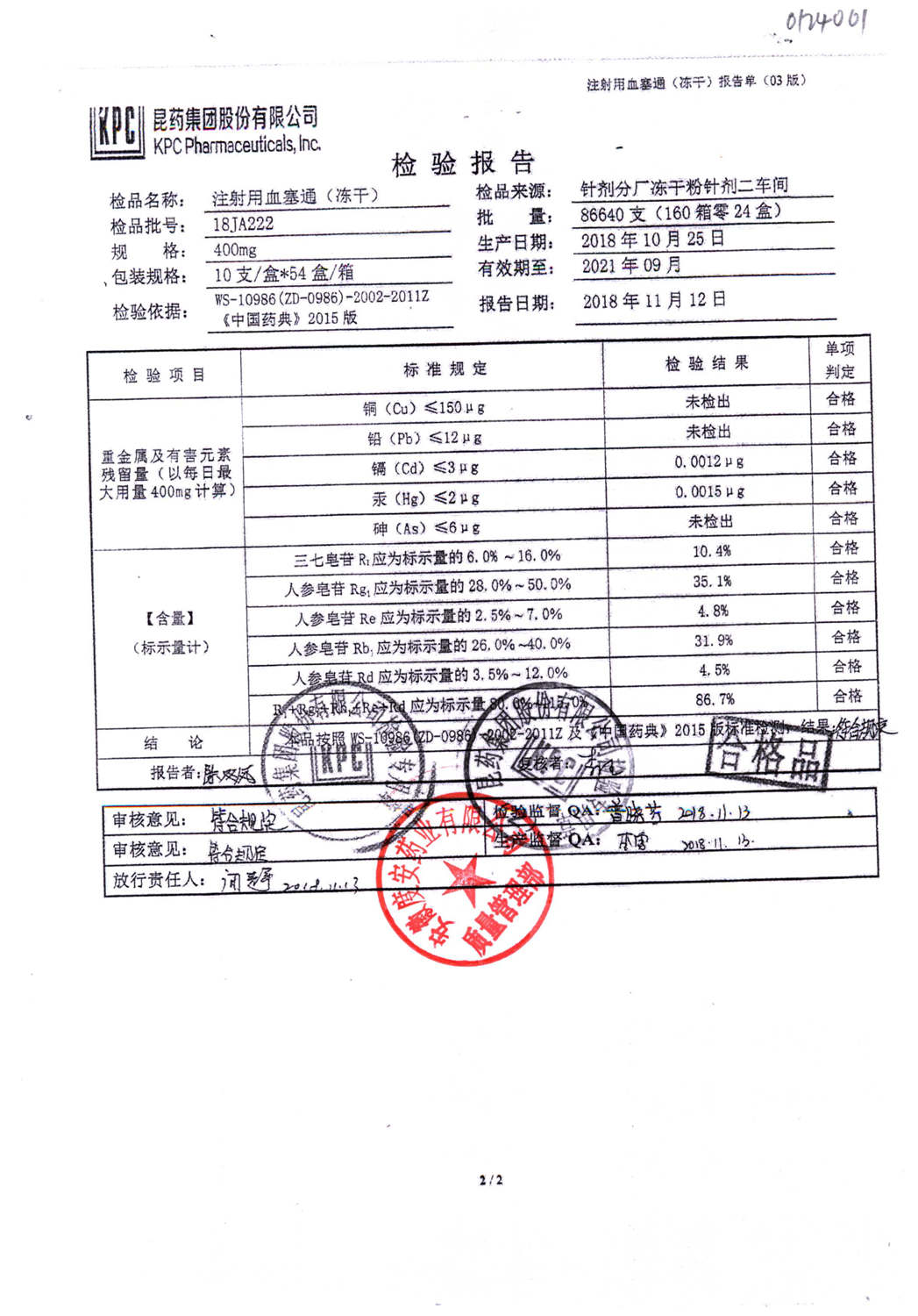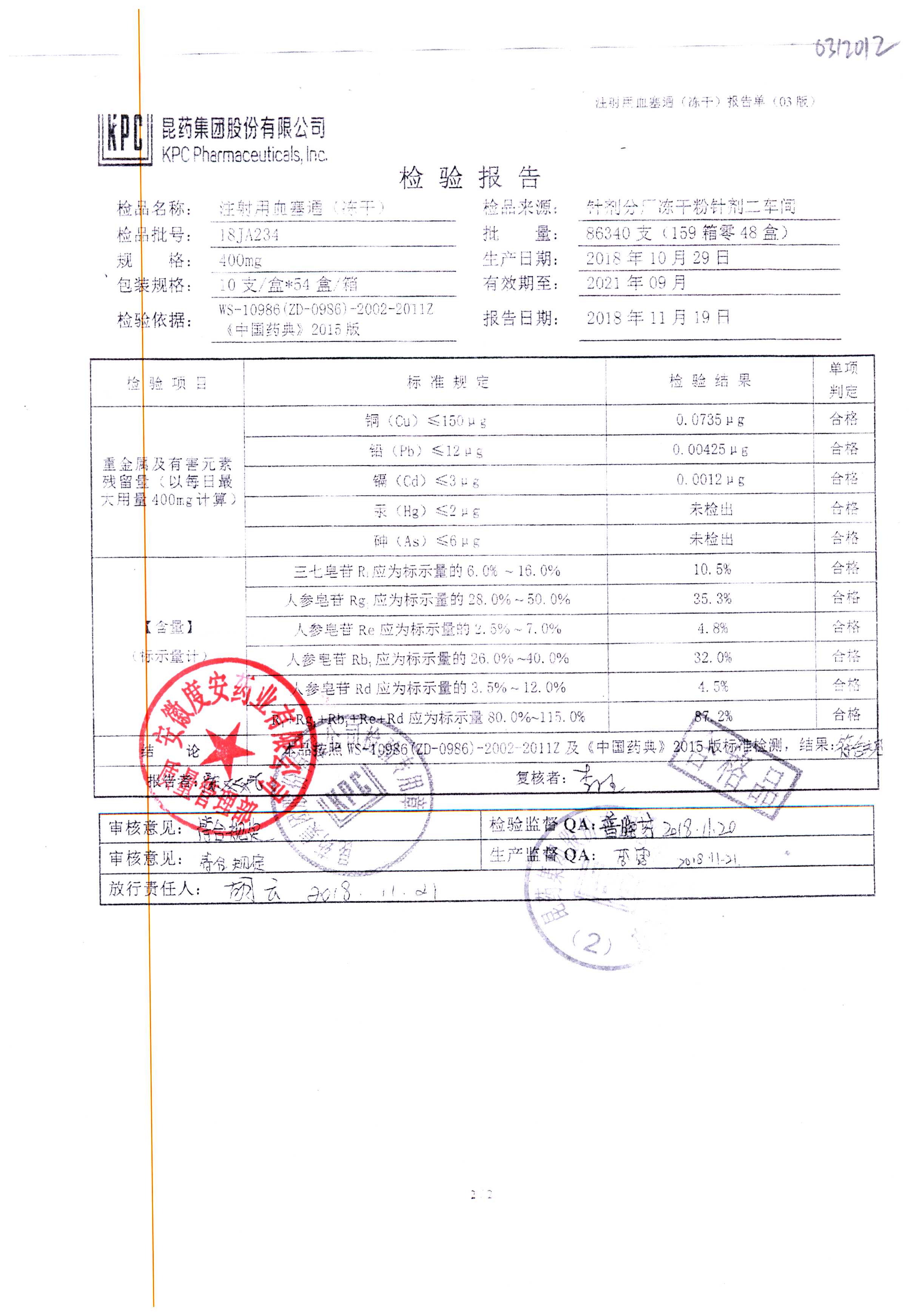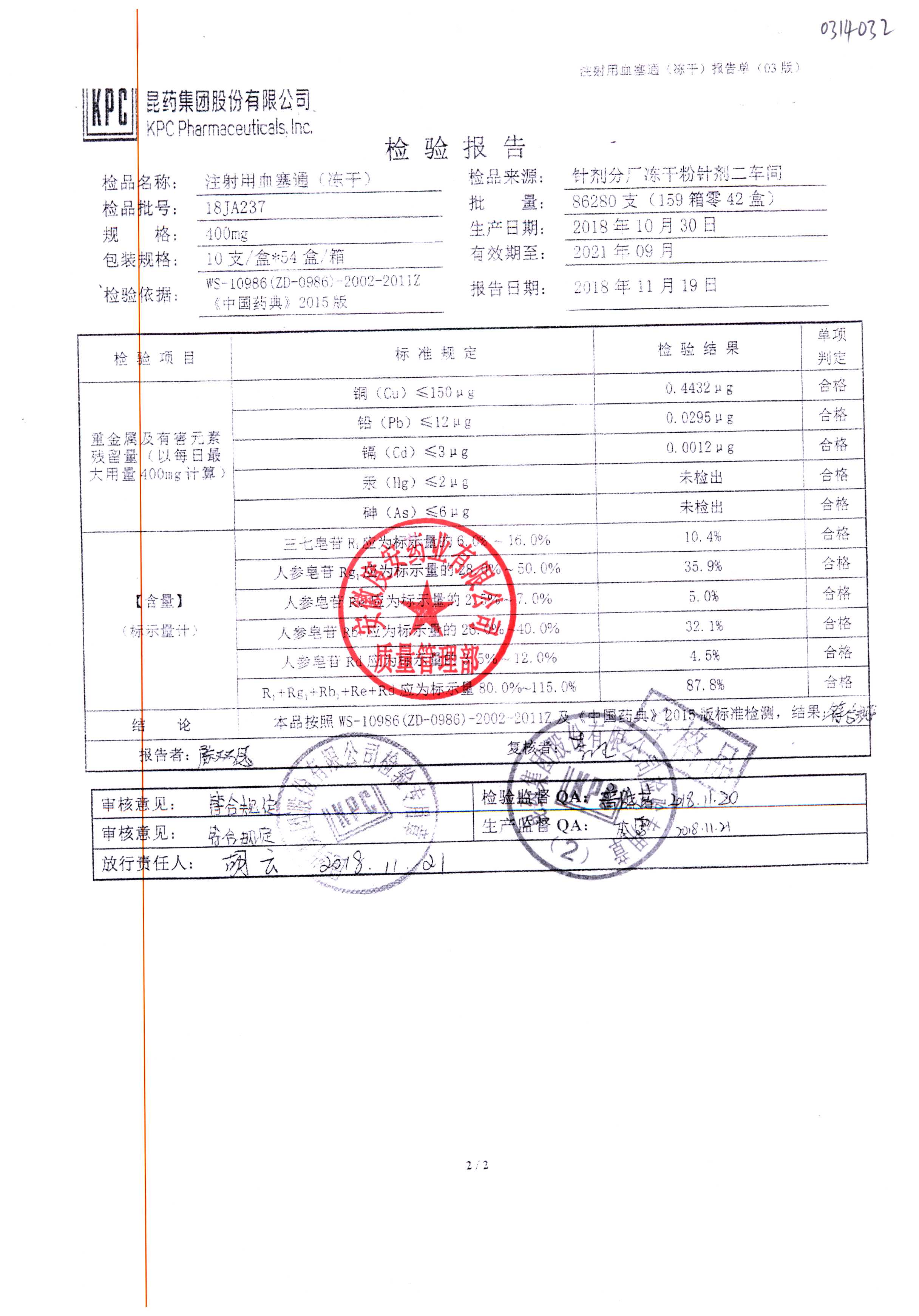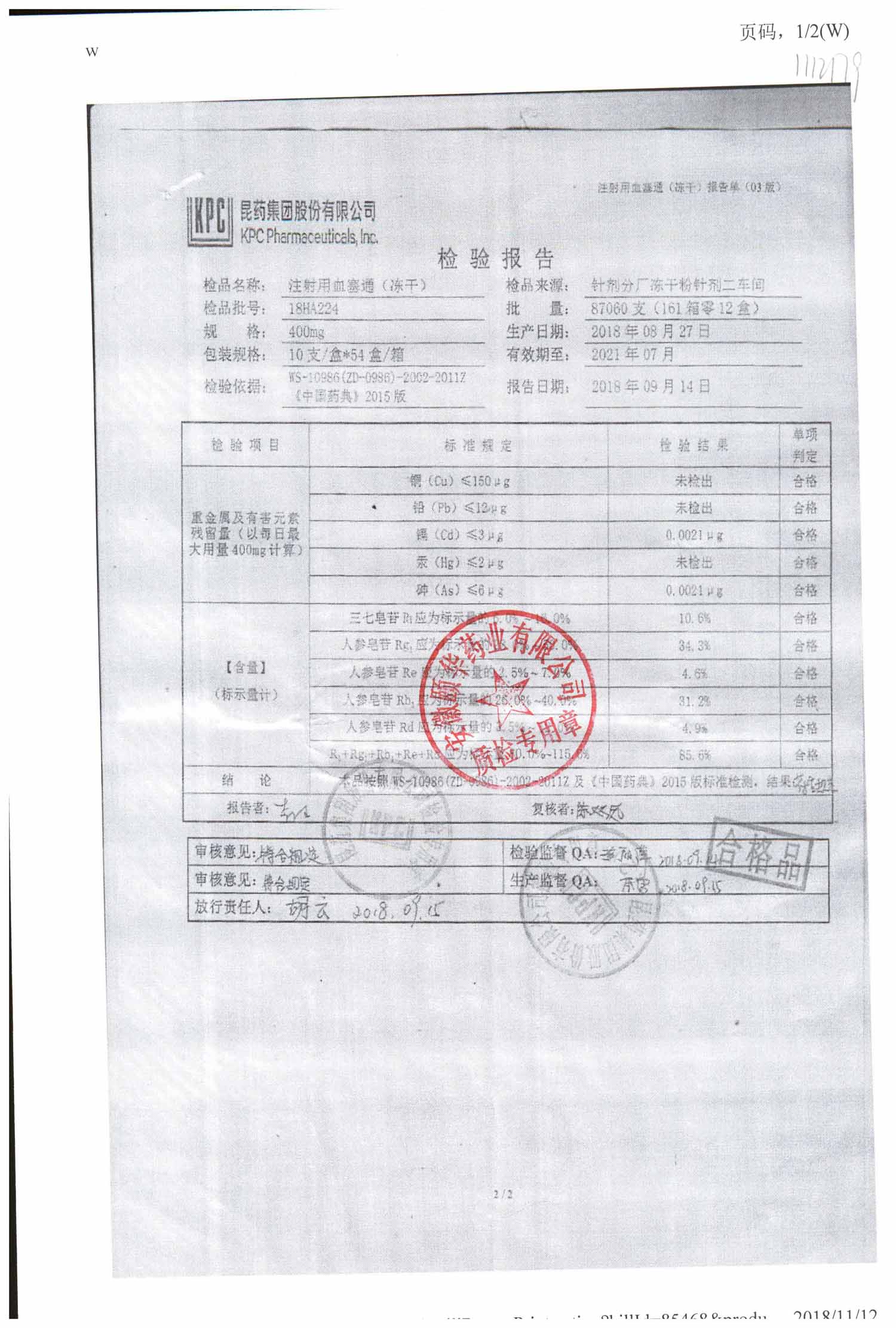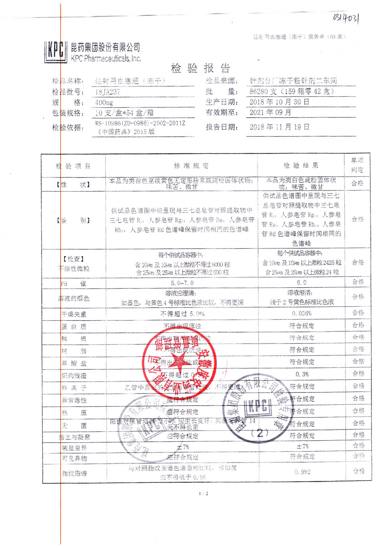注射用血塞通(冻干) | 400mg | 18JA234(2/2) | 查看详情 |