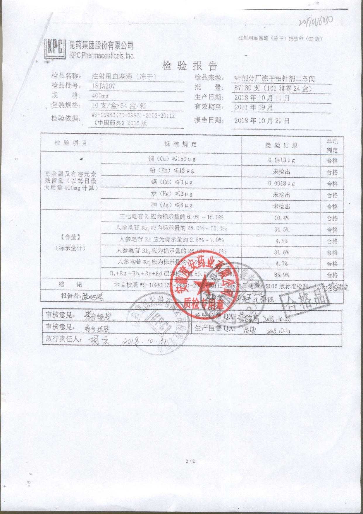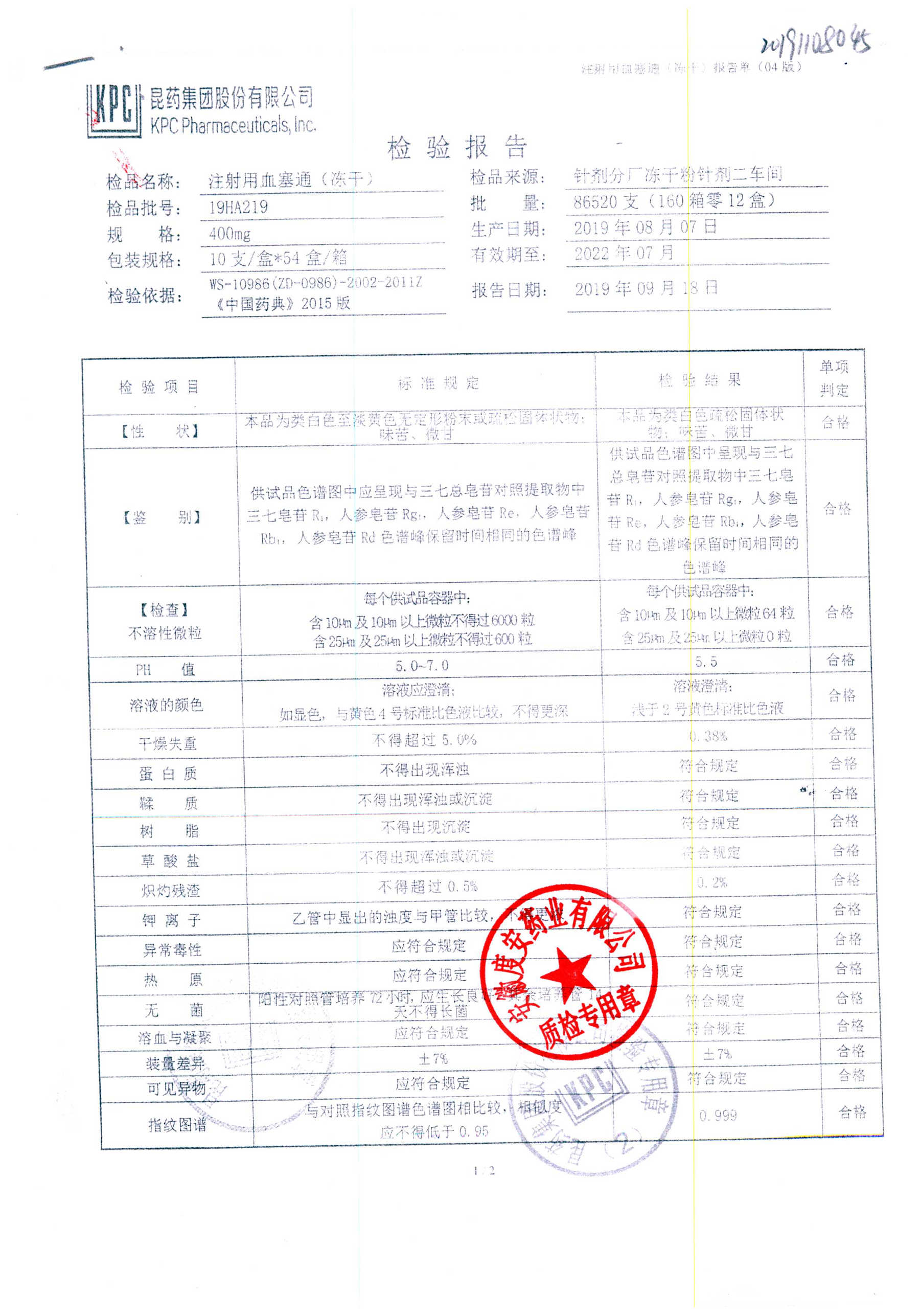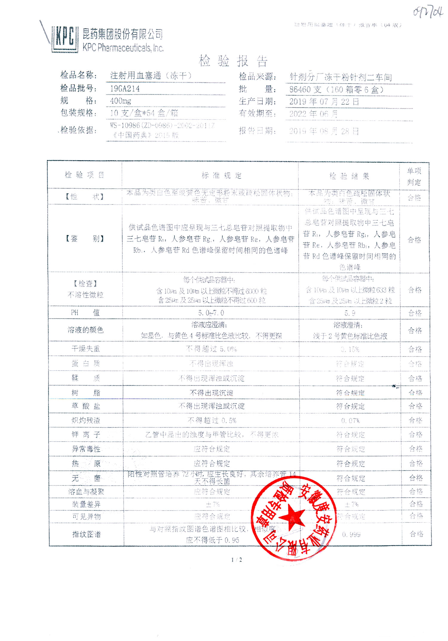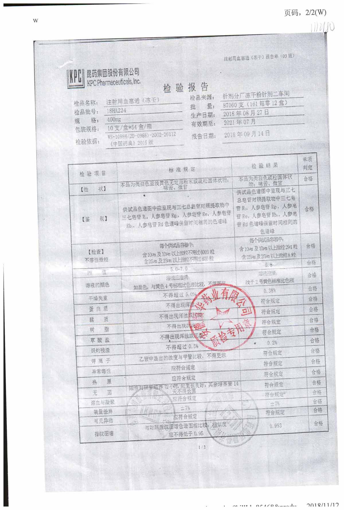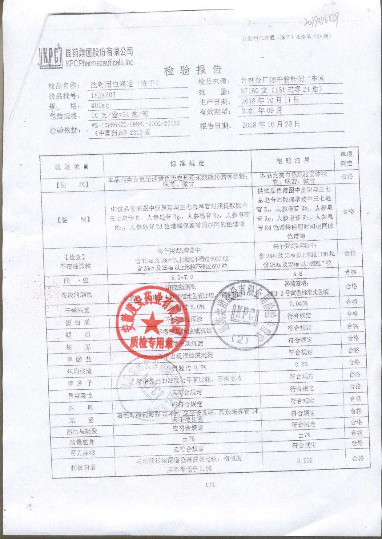 注射用血塞通(冻干) | 400mg | 19FA204(2/2) | 查看详情 |