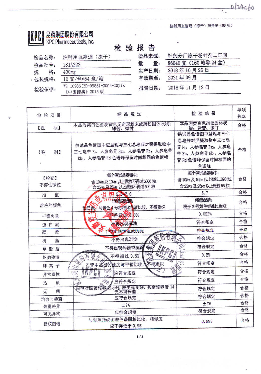 注射用血塞通(冻干) | 400mg | 18JA237(1/2) | 查看详情 |