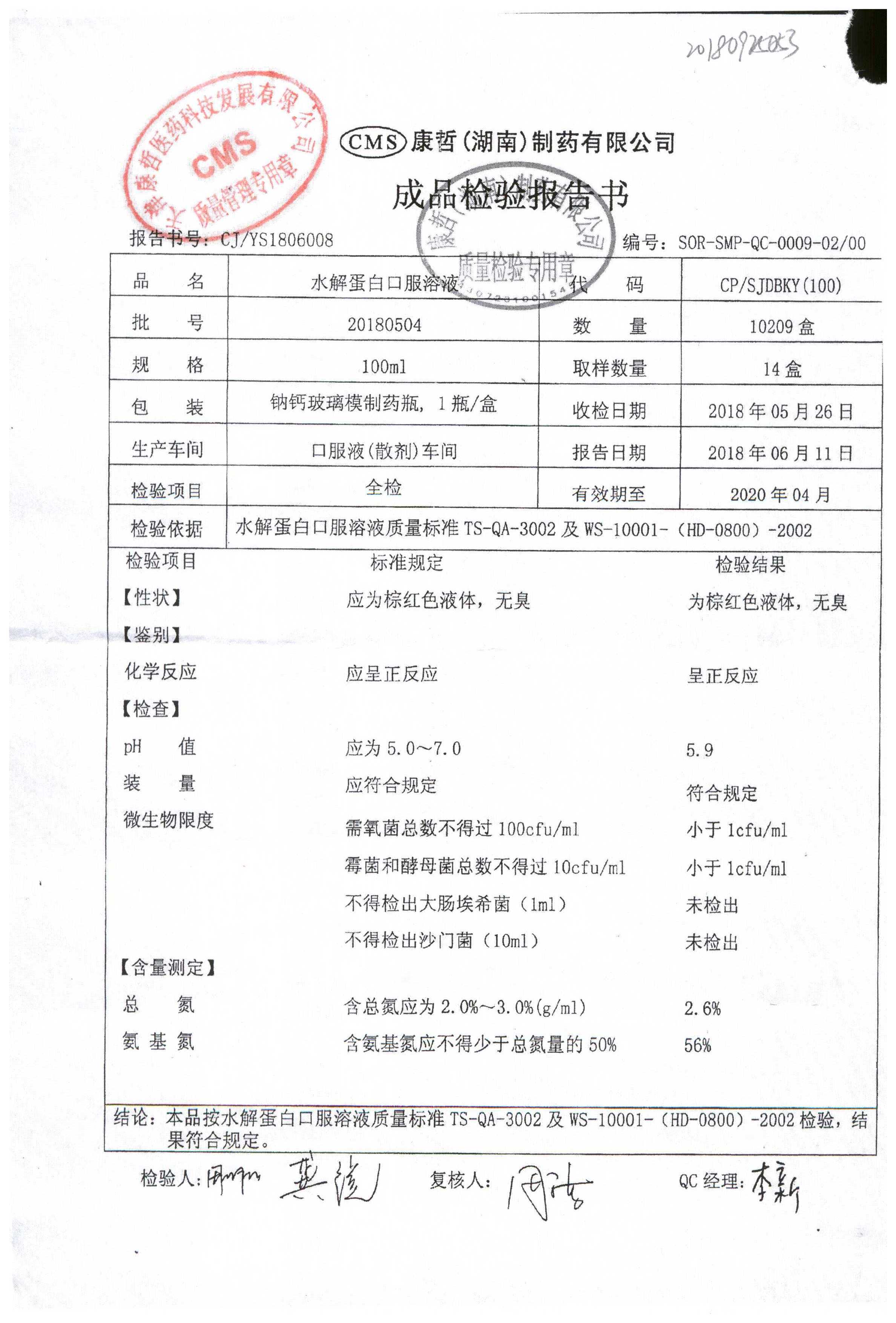水解蛋白口服溶液 | 100ml | 20180504 | 查看详情 |