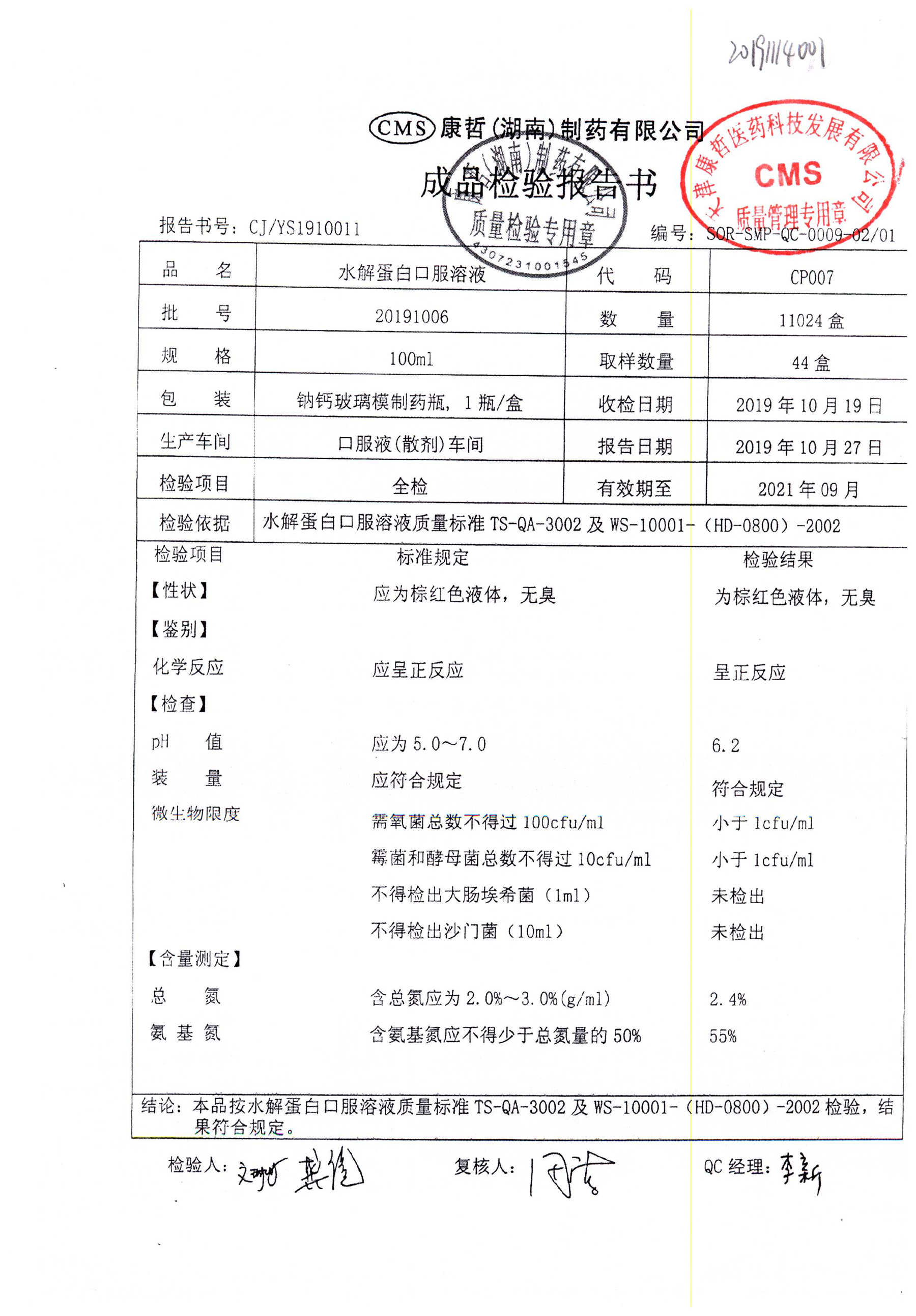 水解蛋白口服溶液 | 100ml | 20191006 | 查看详情 |