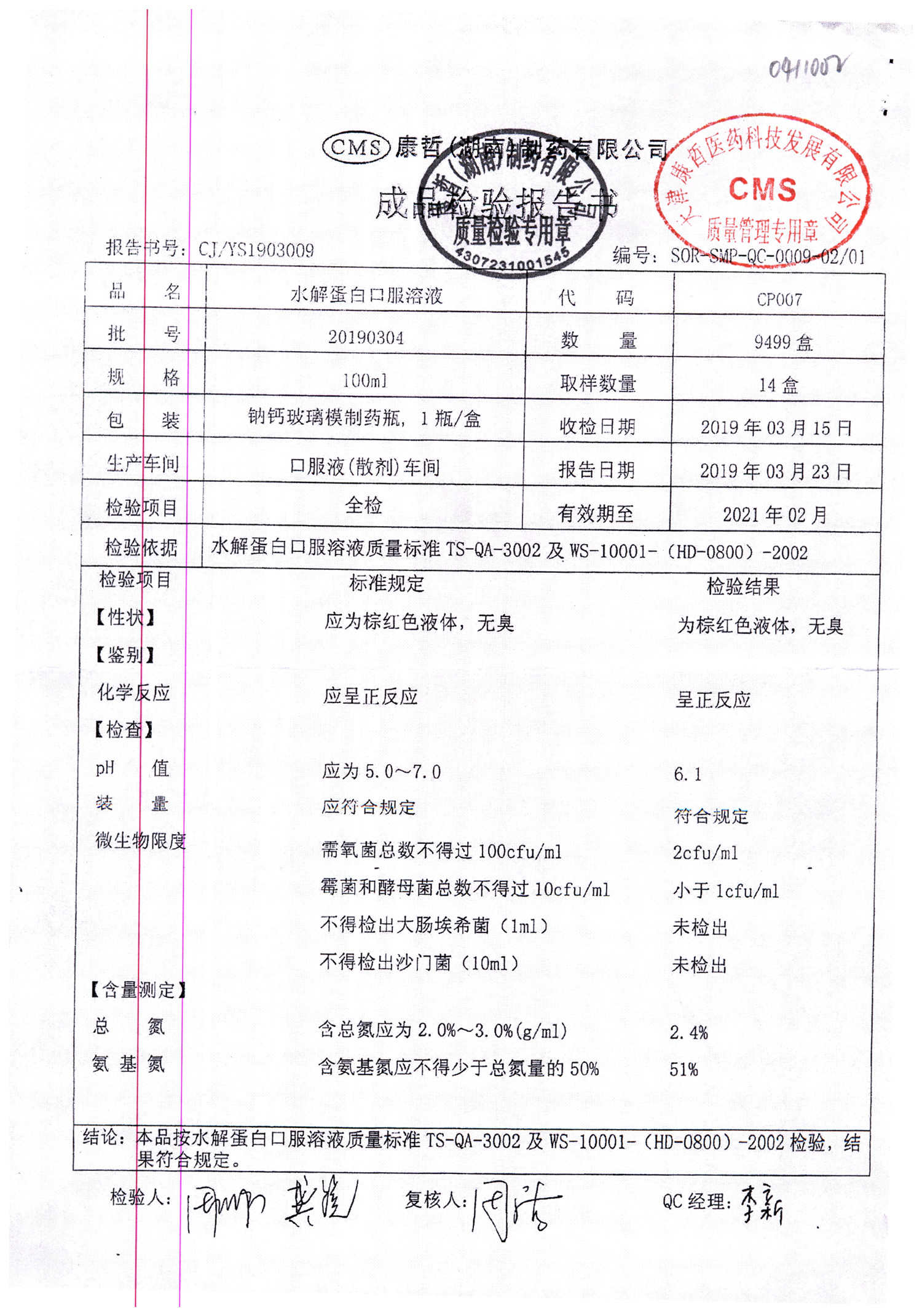 水解蛋白口服溶液 | 100ml | 20190304 | 查看详情 |
