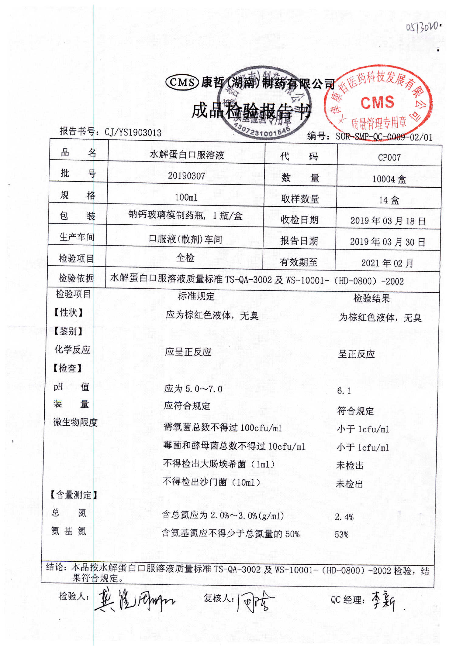 水解蛋白口服溶液 | 100ml | 20190307 | 查看详情 |