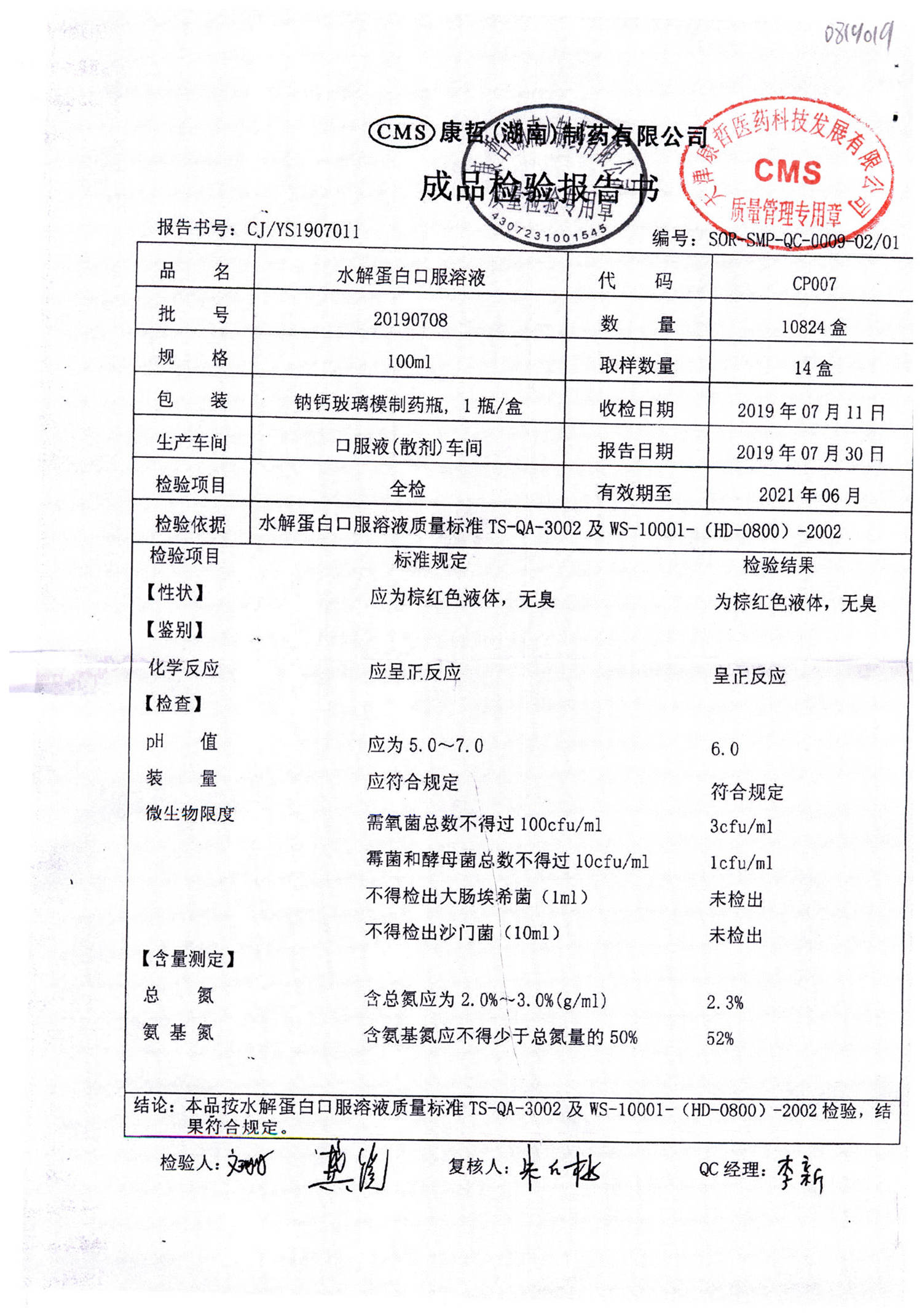 水解蛋白口服溶液 | 100ml | 20190708 | 查看详情 |