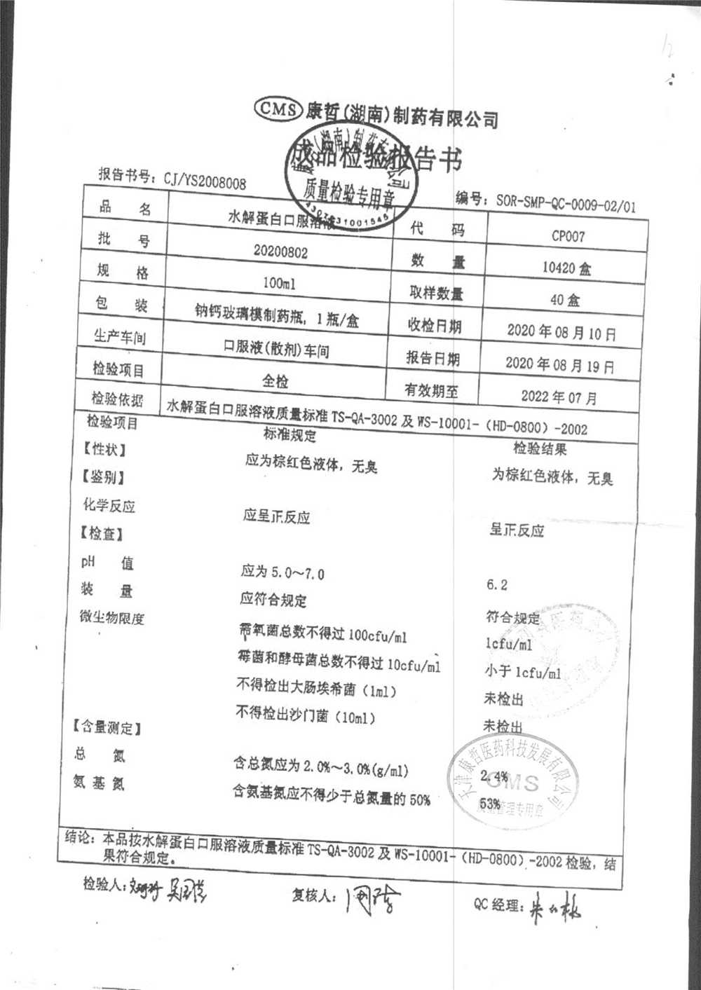 水解蛋白口服溶液 | 100ml | 20200802 | 查看详情 |