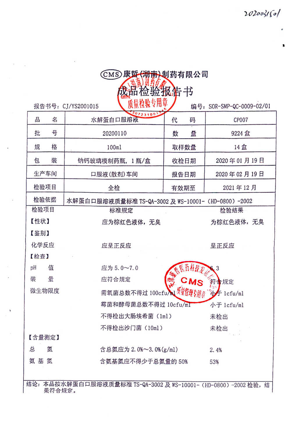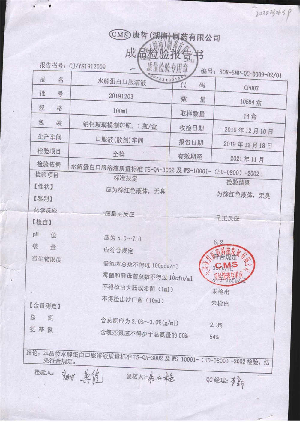 水解蛋白口服溶液 | 100ml | 20200110 | 查看详情 |