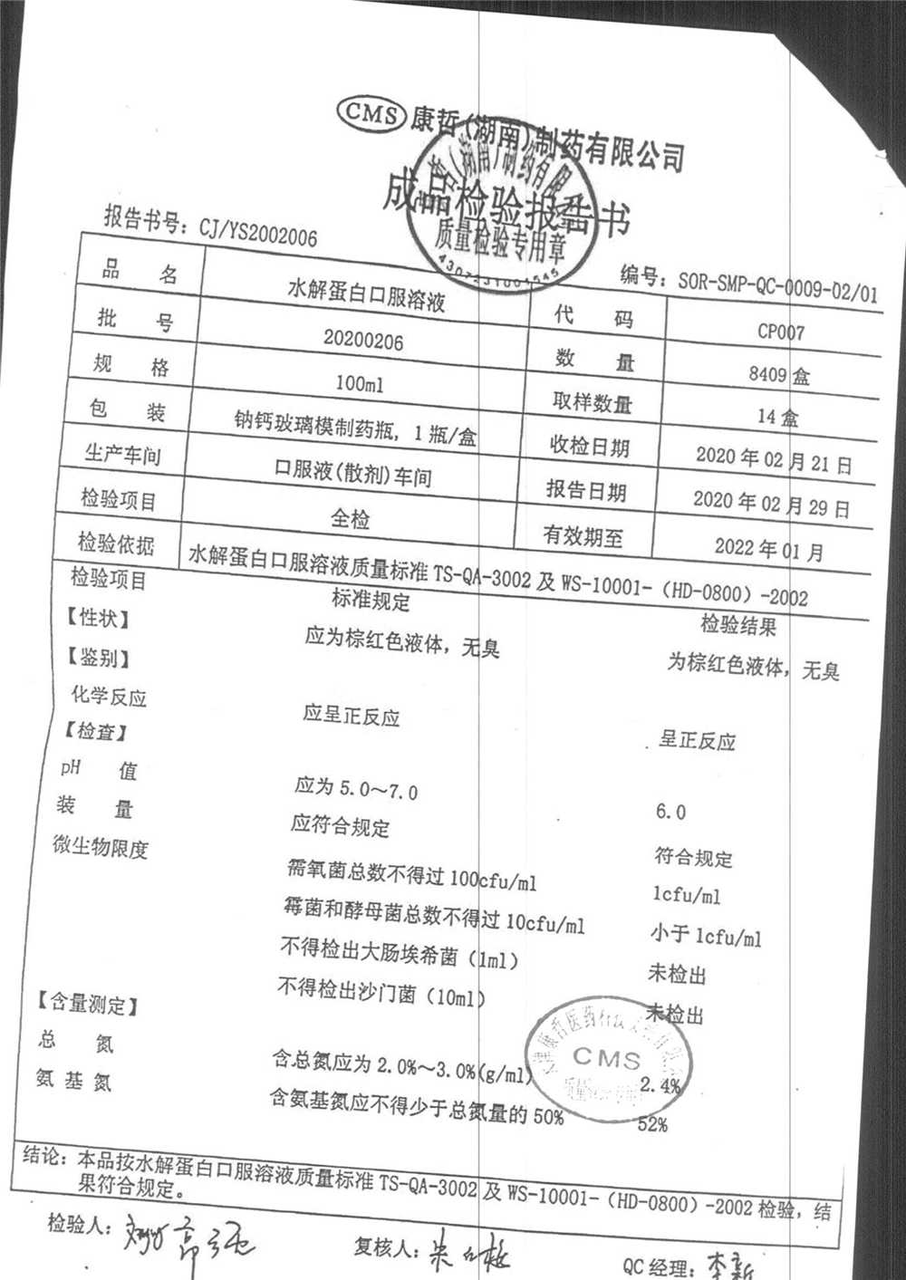 水解蛋白口服溶液 | 100ml | 20200206 | 查看详情 |