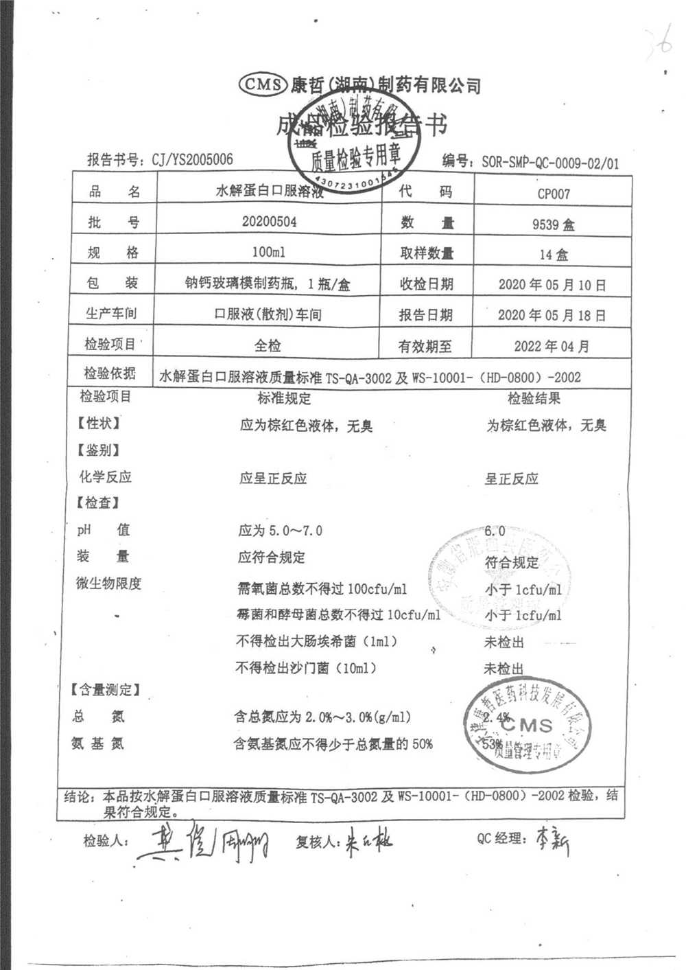 水解蛋白口服溶液 | 100ml | 20200504 | 查看详情 |