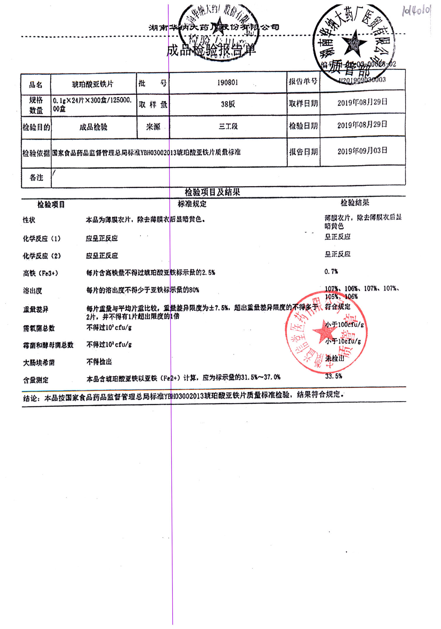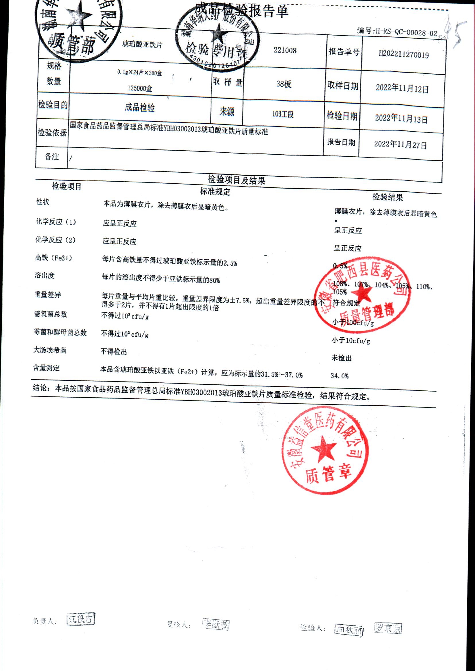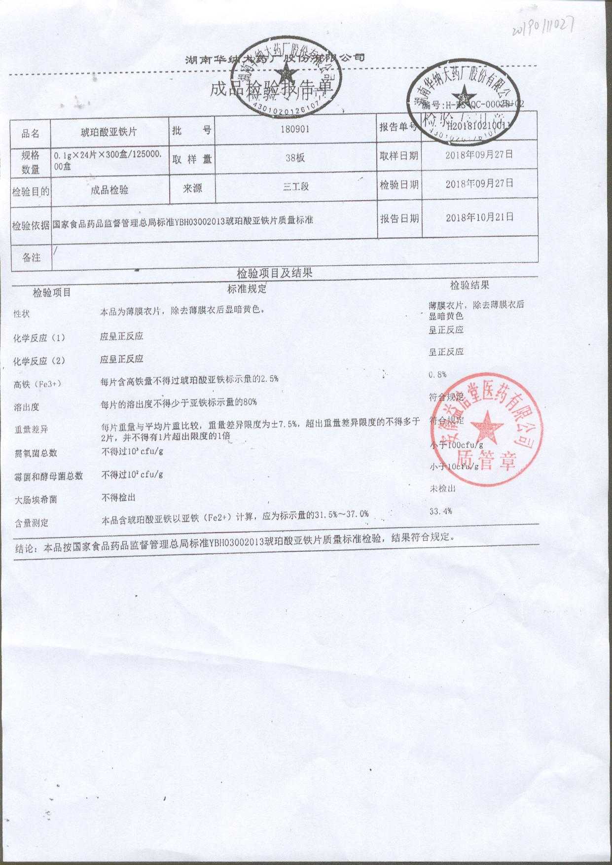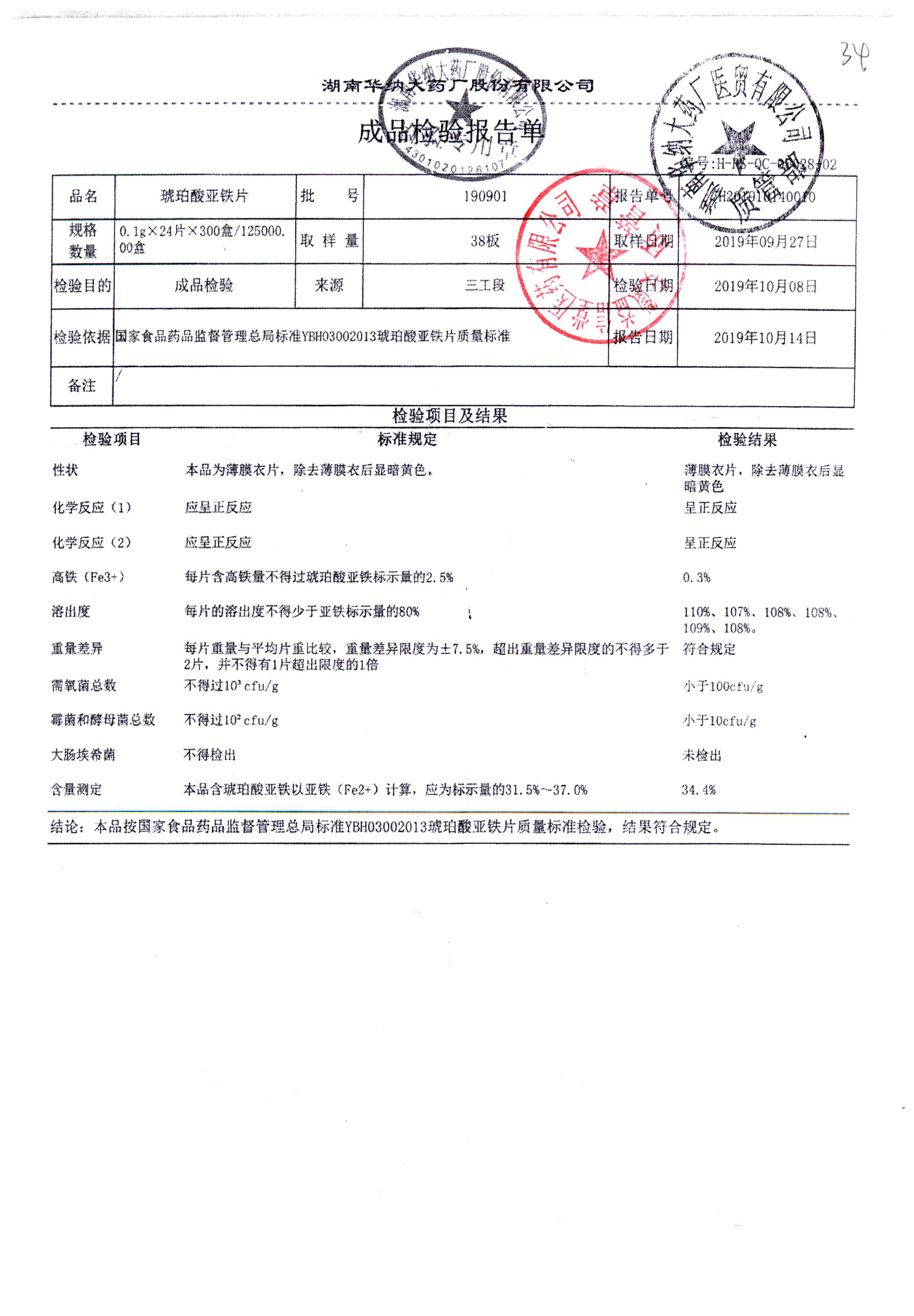 琥珀酸亚铁片 | 0.1g*24片 | 190901 | 查看详情 |
