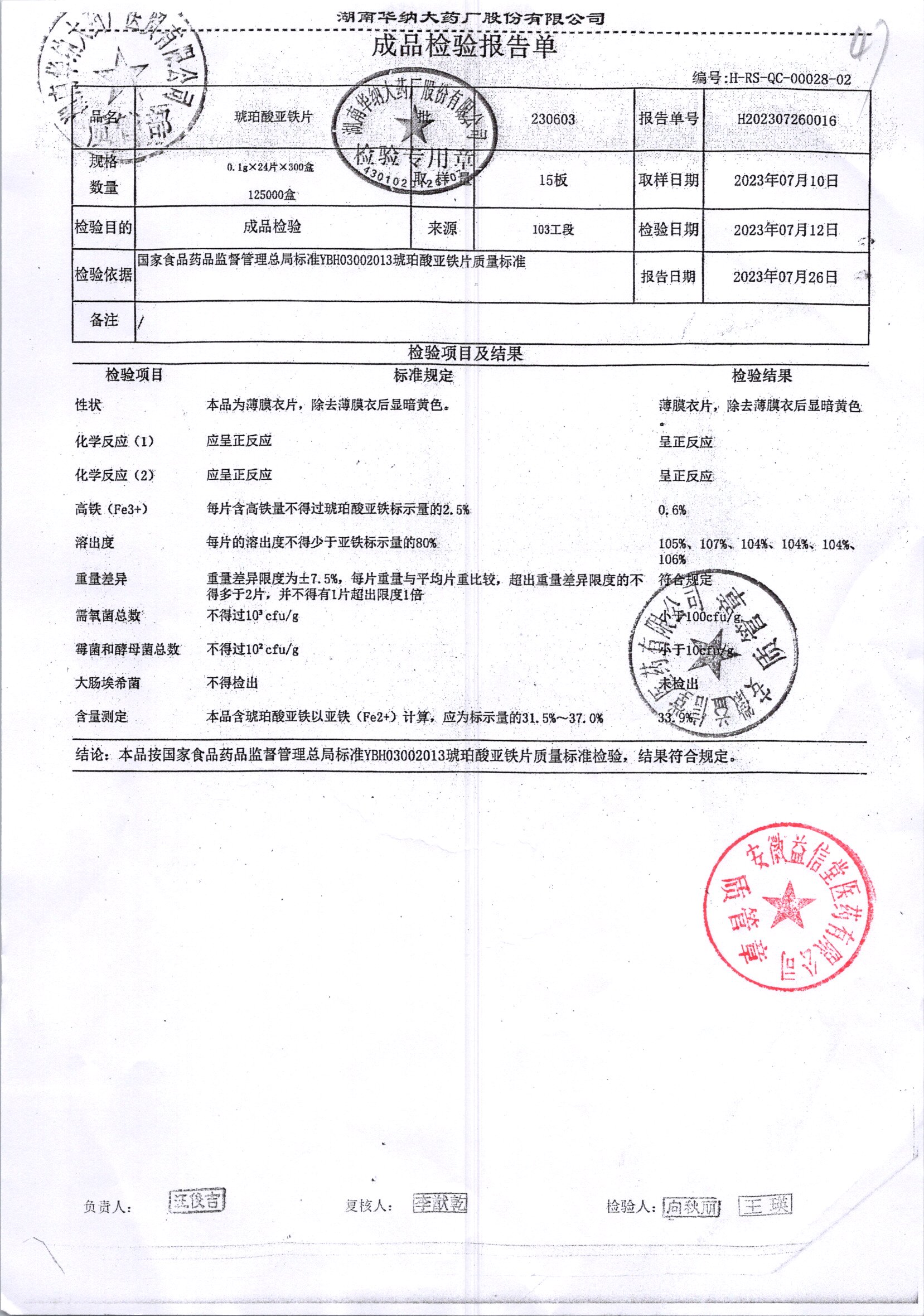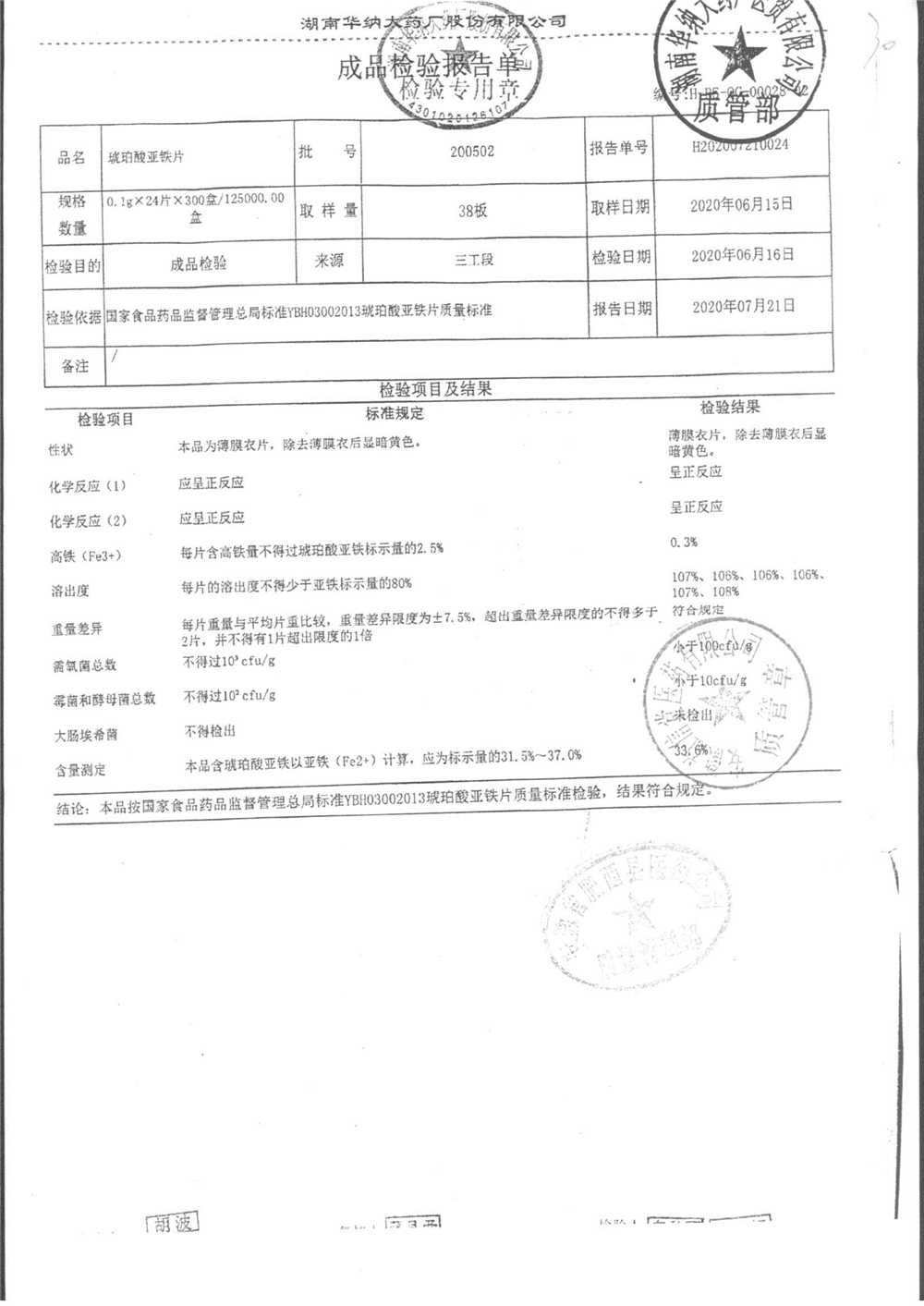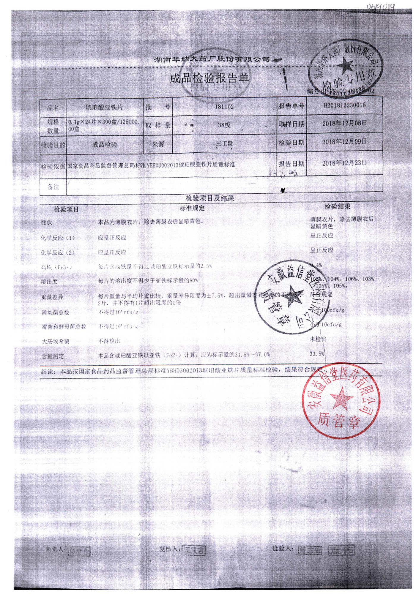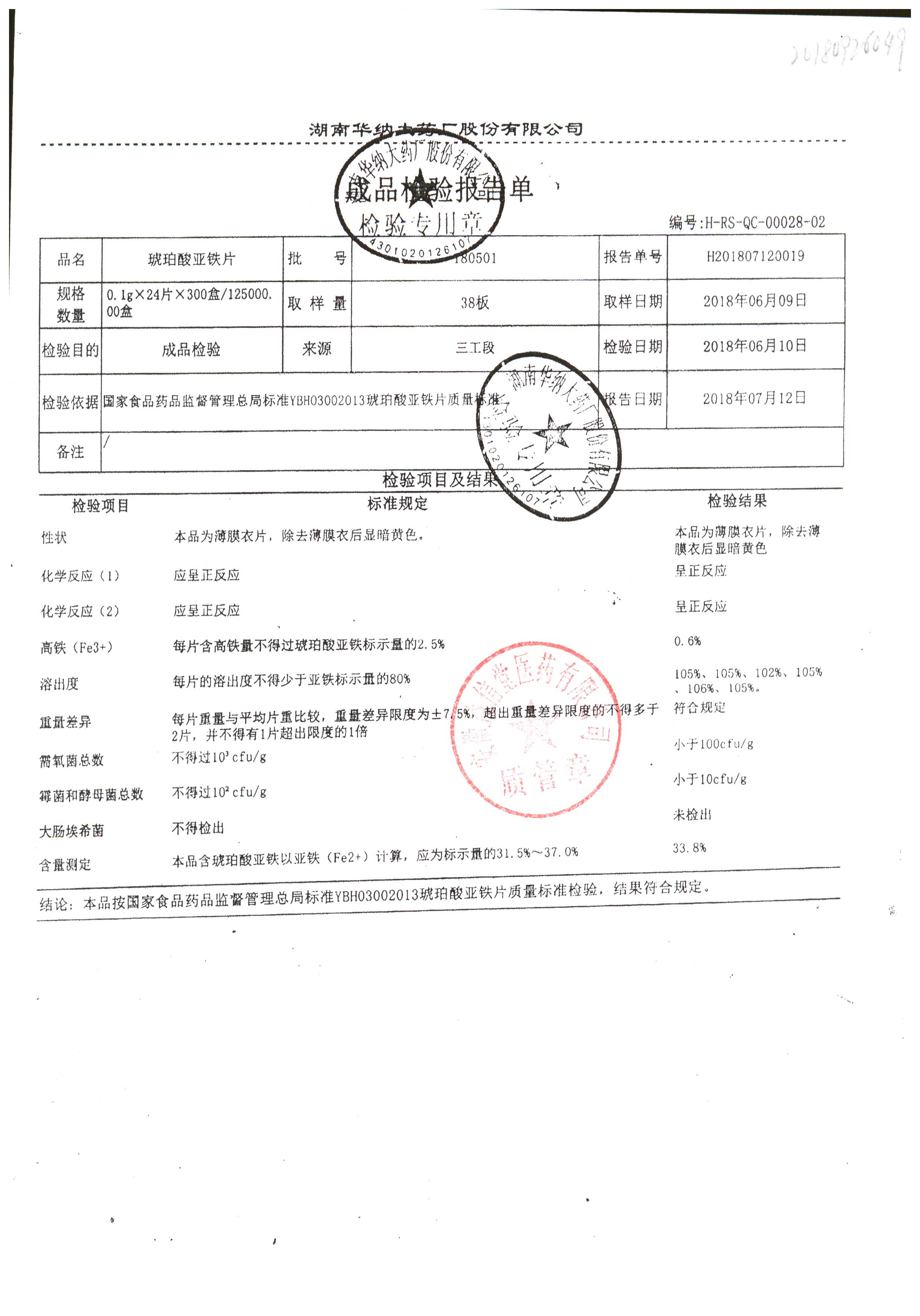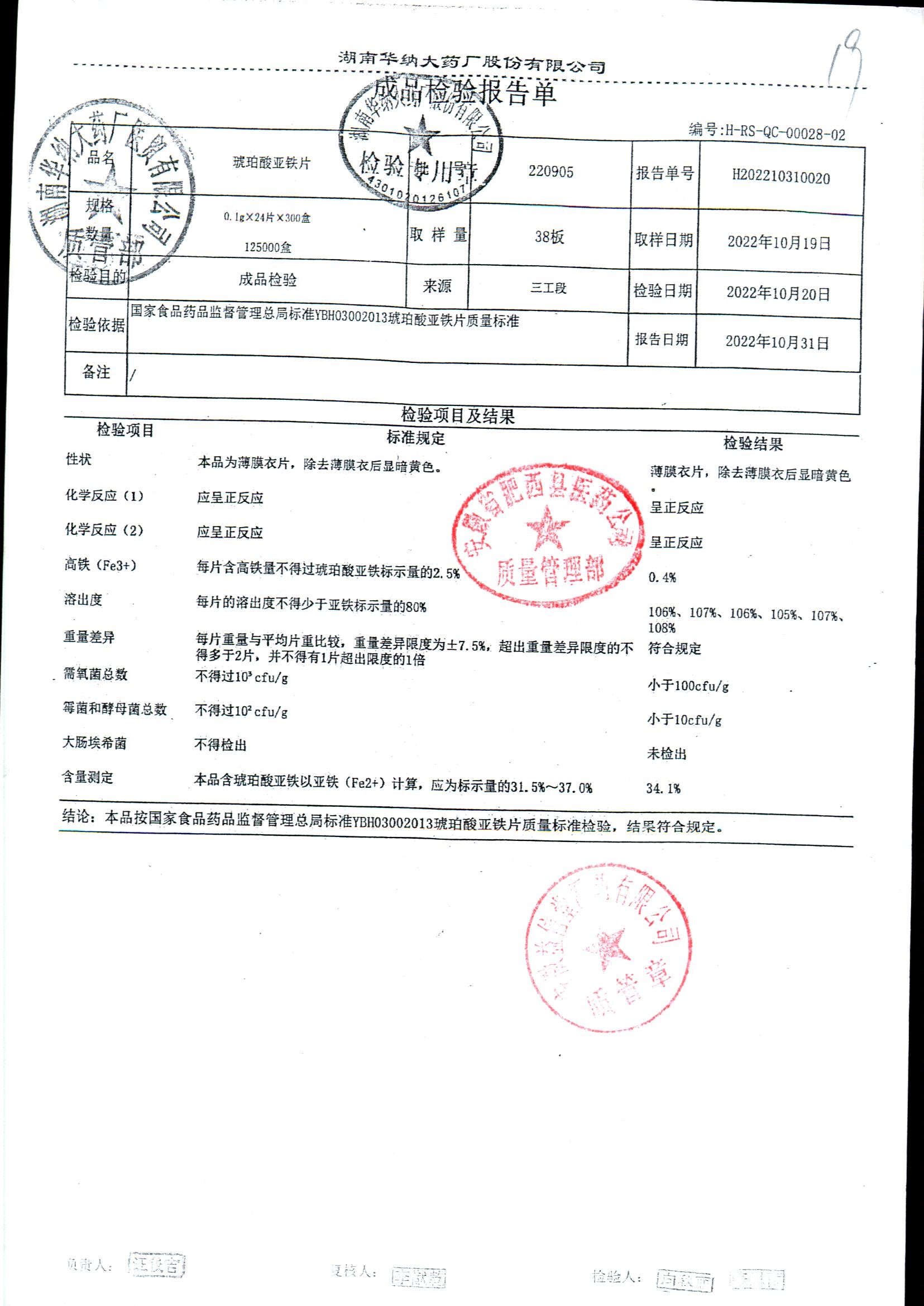 琥珀酸亚铁片 | 0.1g*24片 | 190901 | 查看详情 |