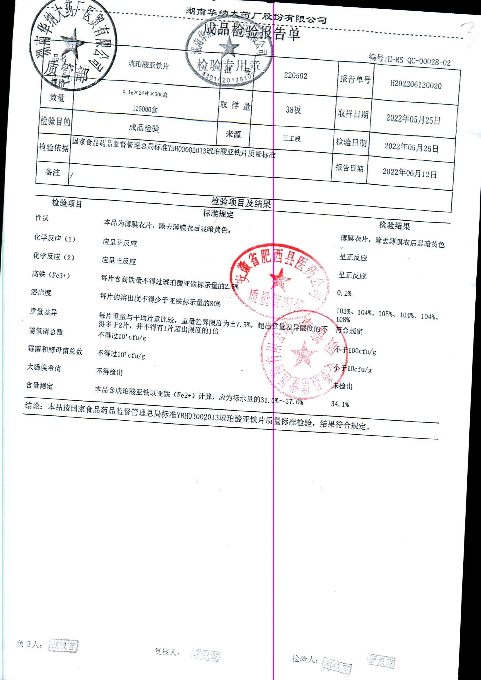 琥珀酸亚铁片 | 0.1g*24片 | 220502 | 查看详情 |