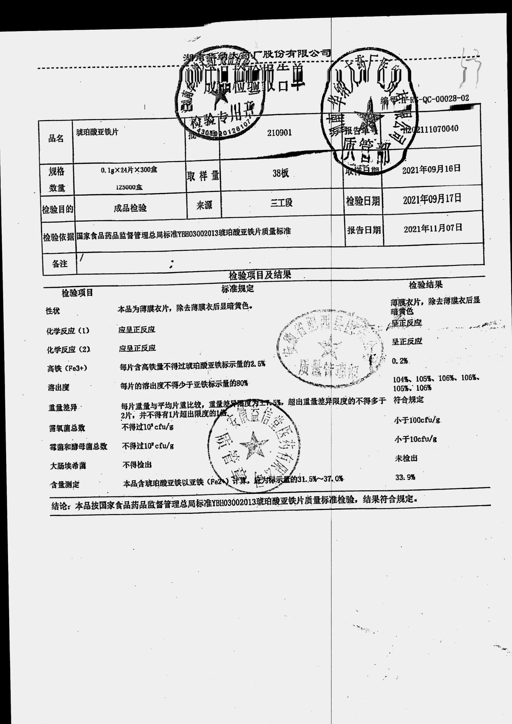 琥珀酸亚铁片 | 0.1g*24片 | 210901 | 查看详情 |