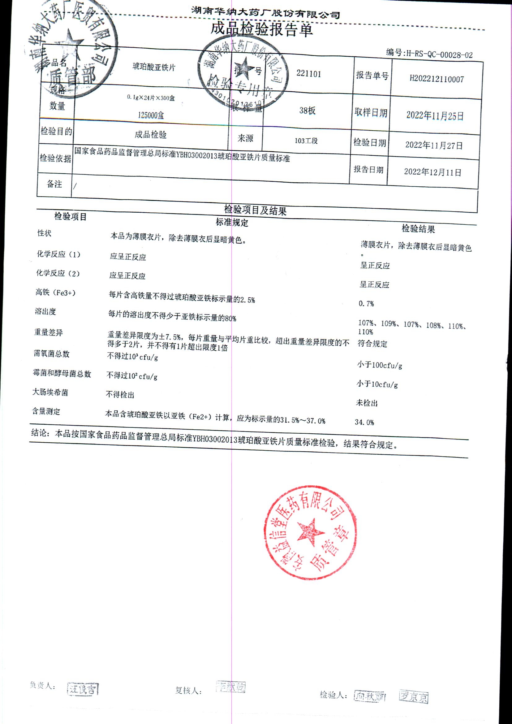 琥珀酸亚铁片 | 0.1g*24片 | 221101 | 查看详情 |