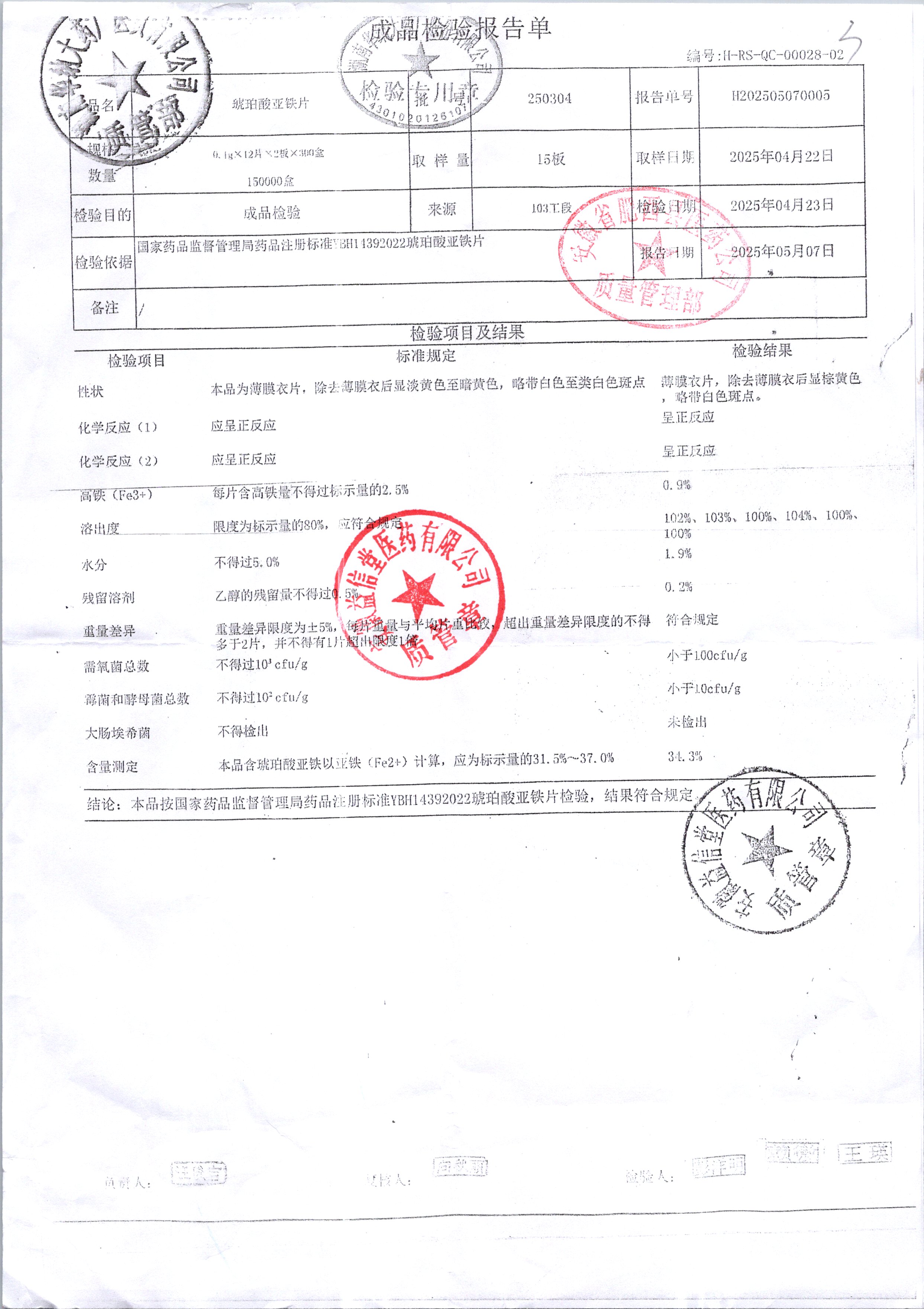 琥珀酸亚铁片 | 0.1g*24片 | 250304 | 查看详情 |
