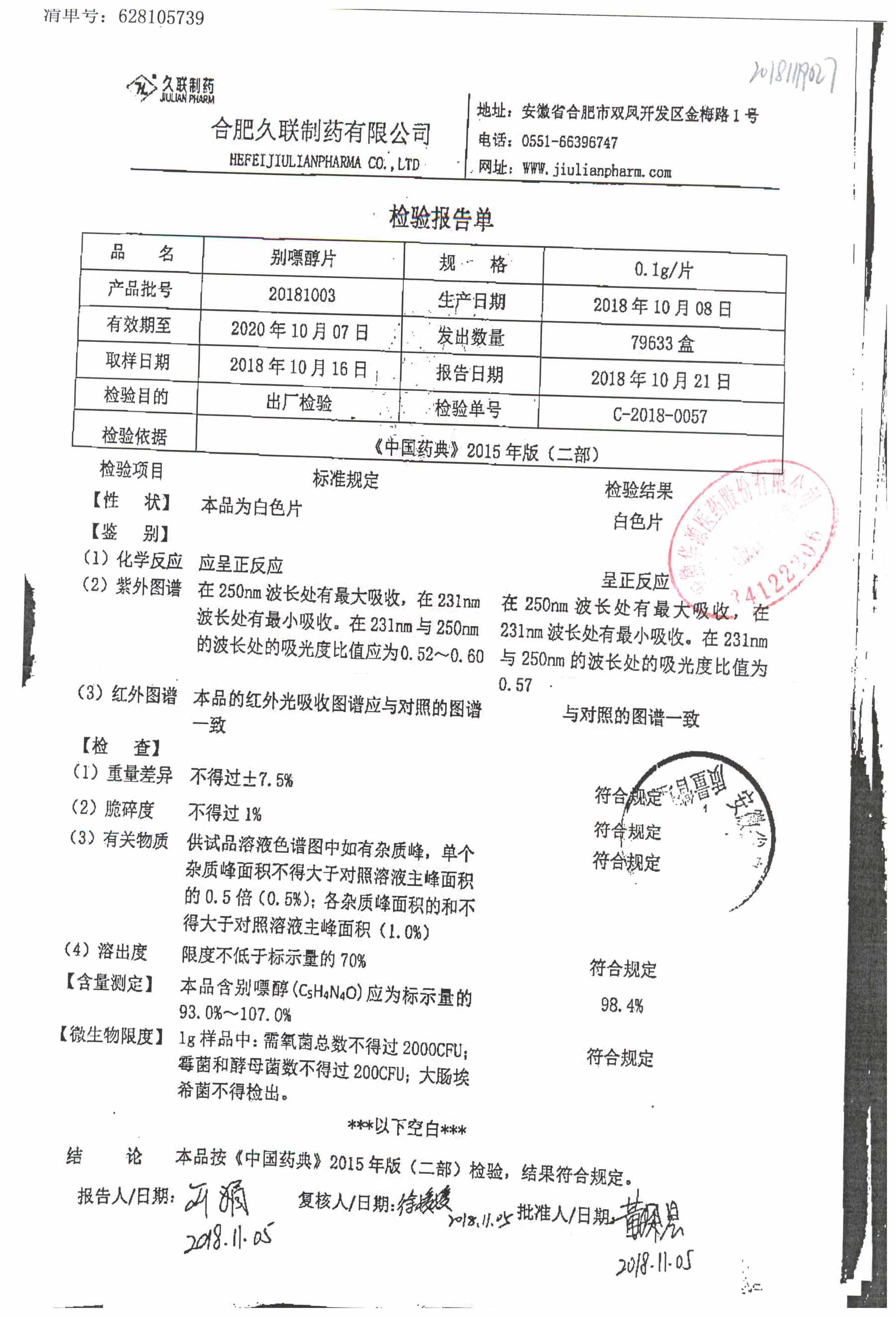 别嘌醇片 | 0.1g | 20181003 | 查看详情 |