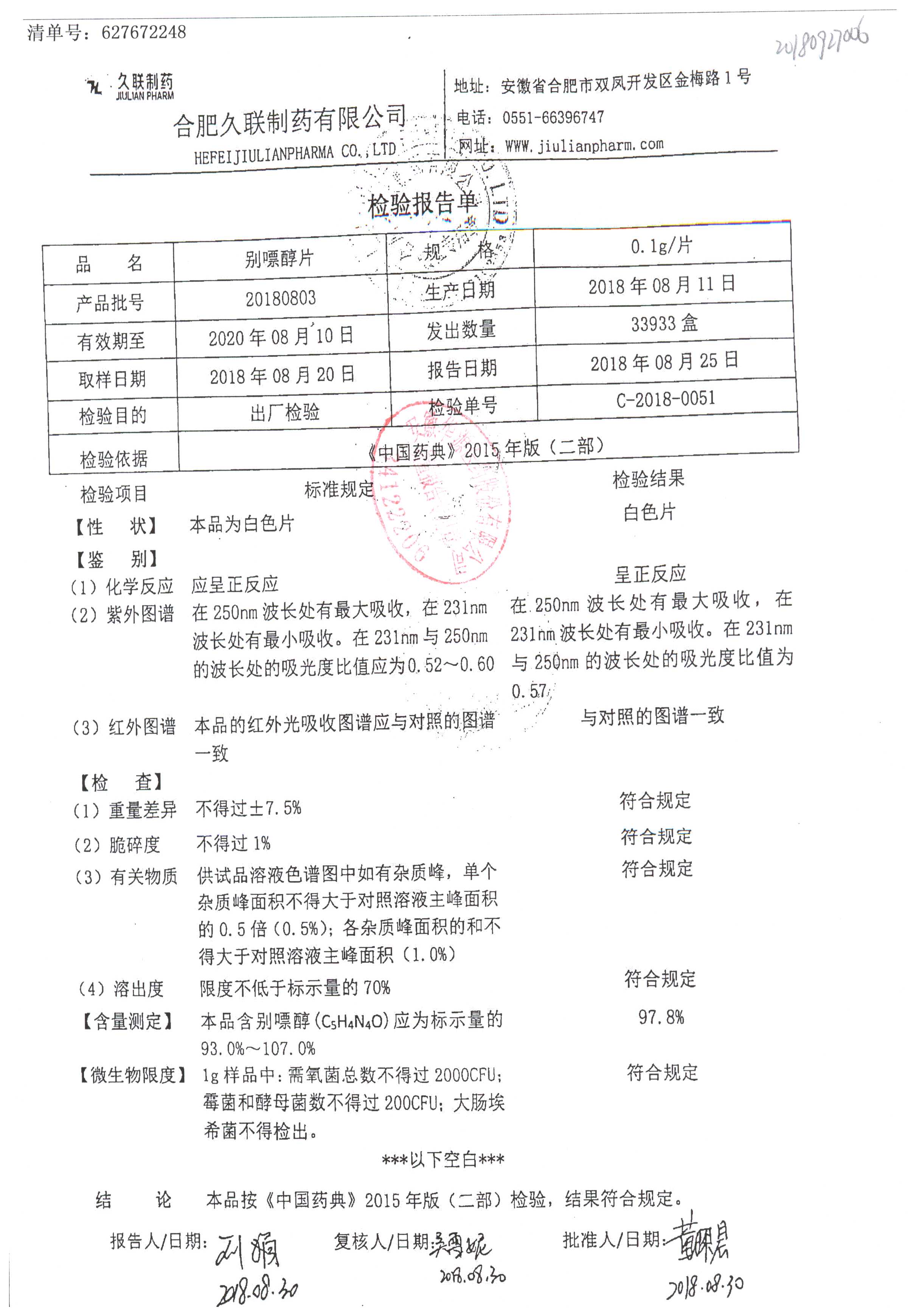别嘌醇片 | 0.1g | 20180803 | 查看详情 |