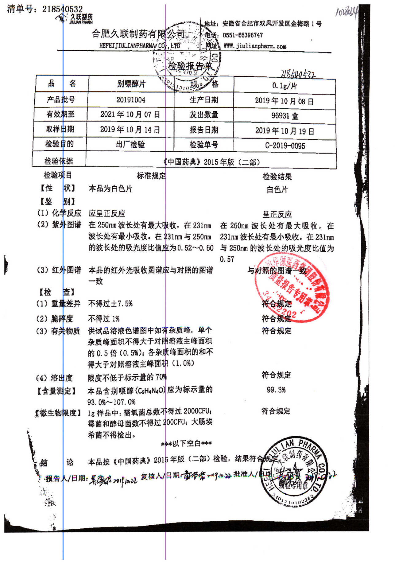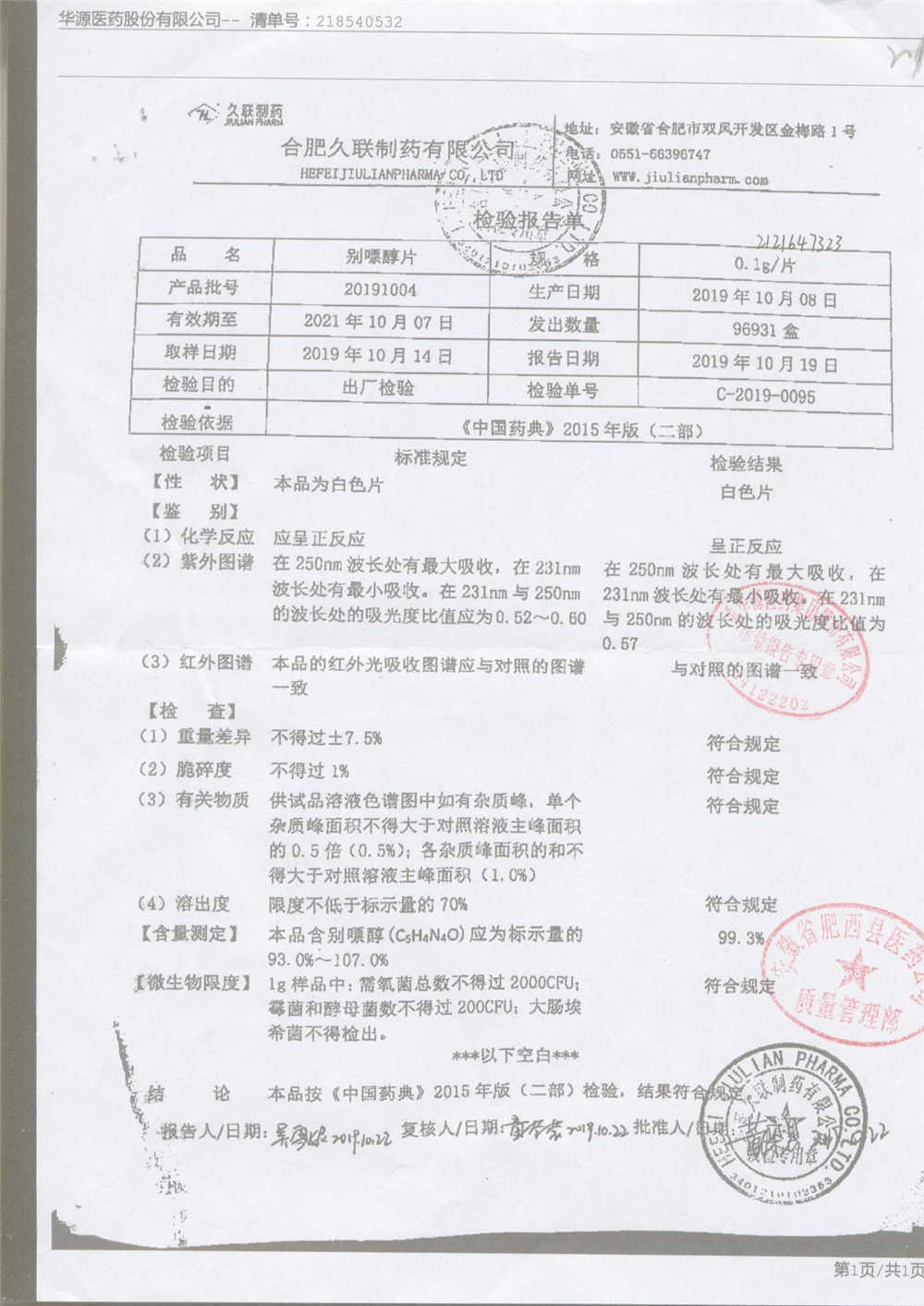 别嘌醇片 | 0.1g | 20191004 | 查看详情 |