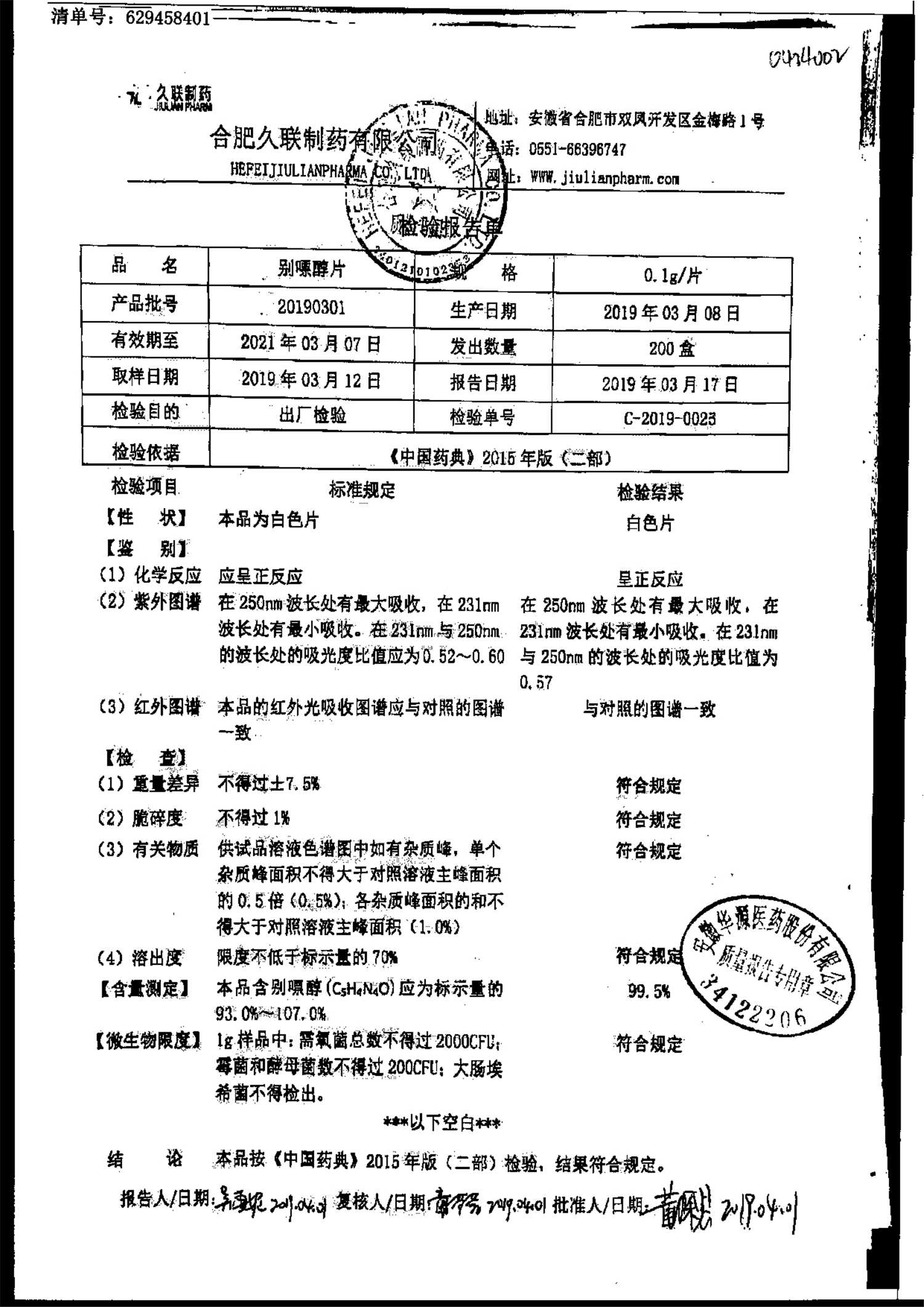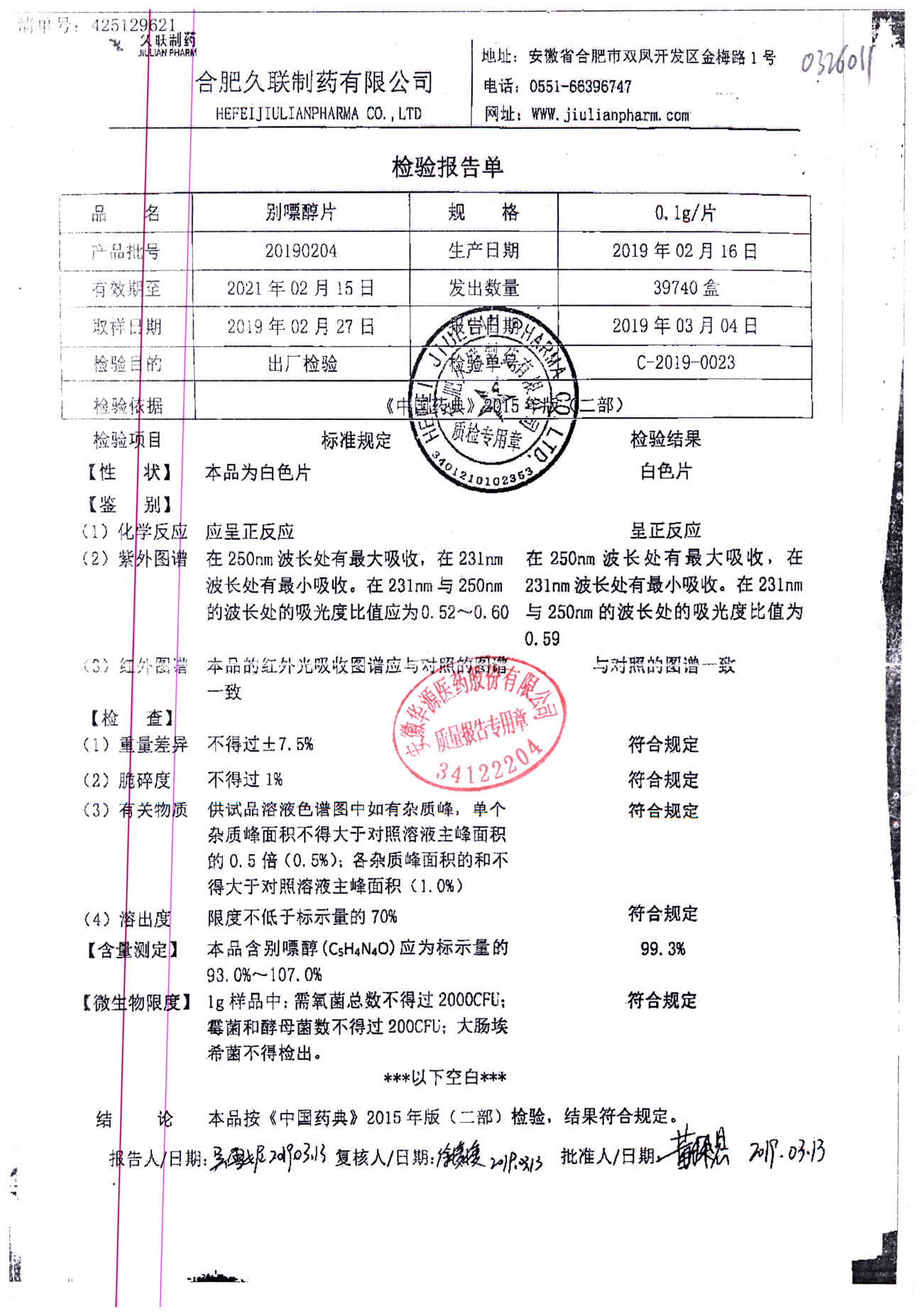 别嘌醇片 | 0.1g | 20190204 | 查看详情 |