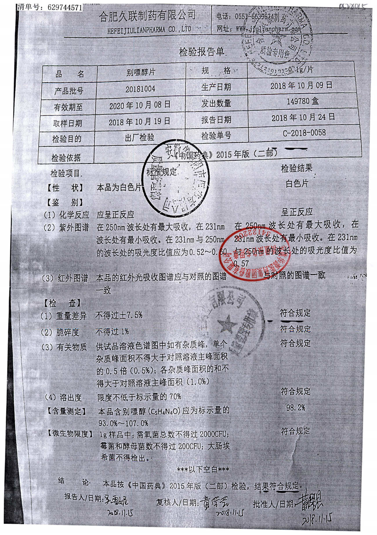 别嘌醇片 | 0.1g | 20181004 | 查看详情 |