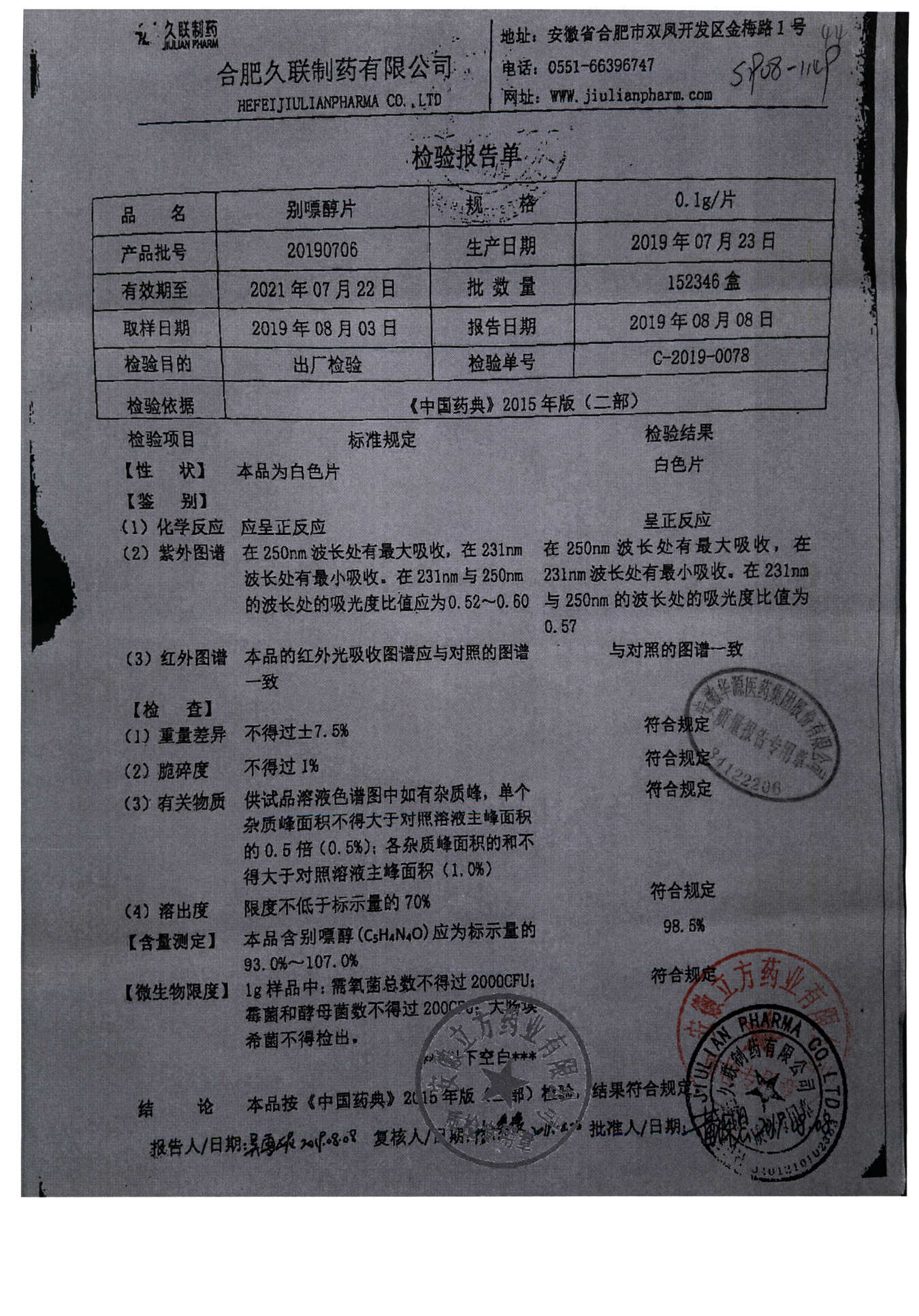 别嘌醇片 | 0.1g | 20190706 | 查看详情 |