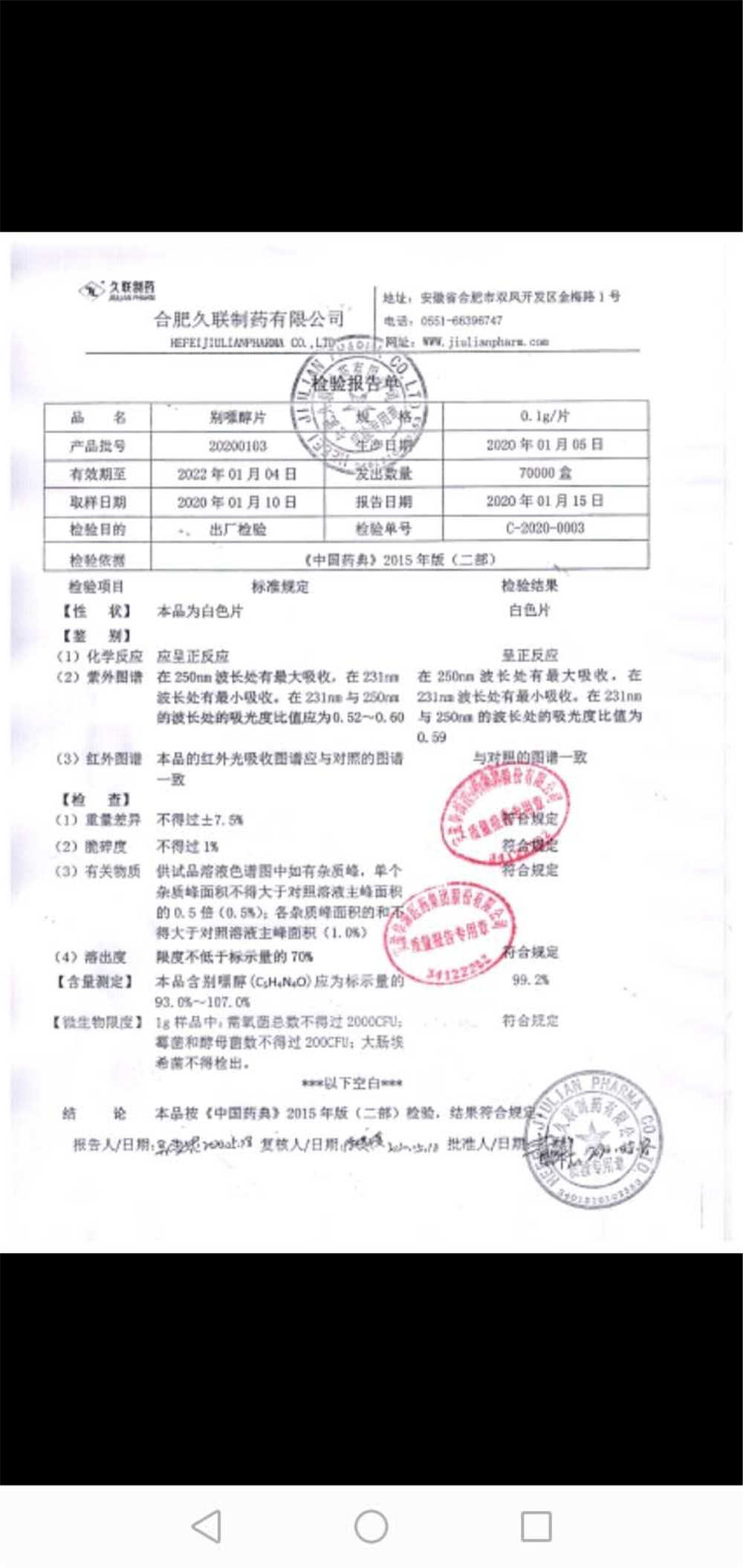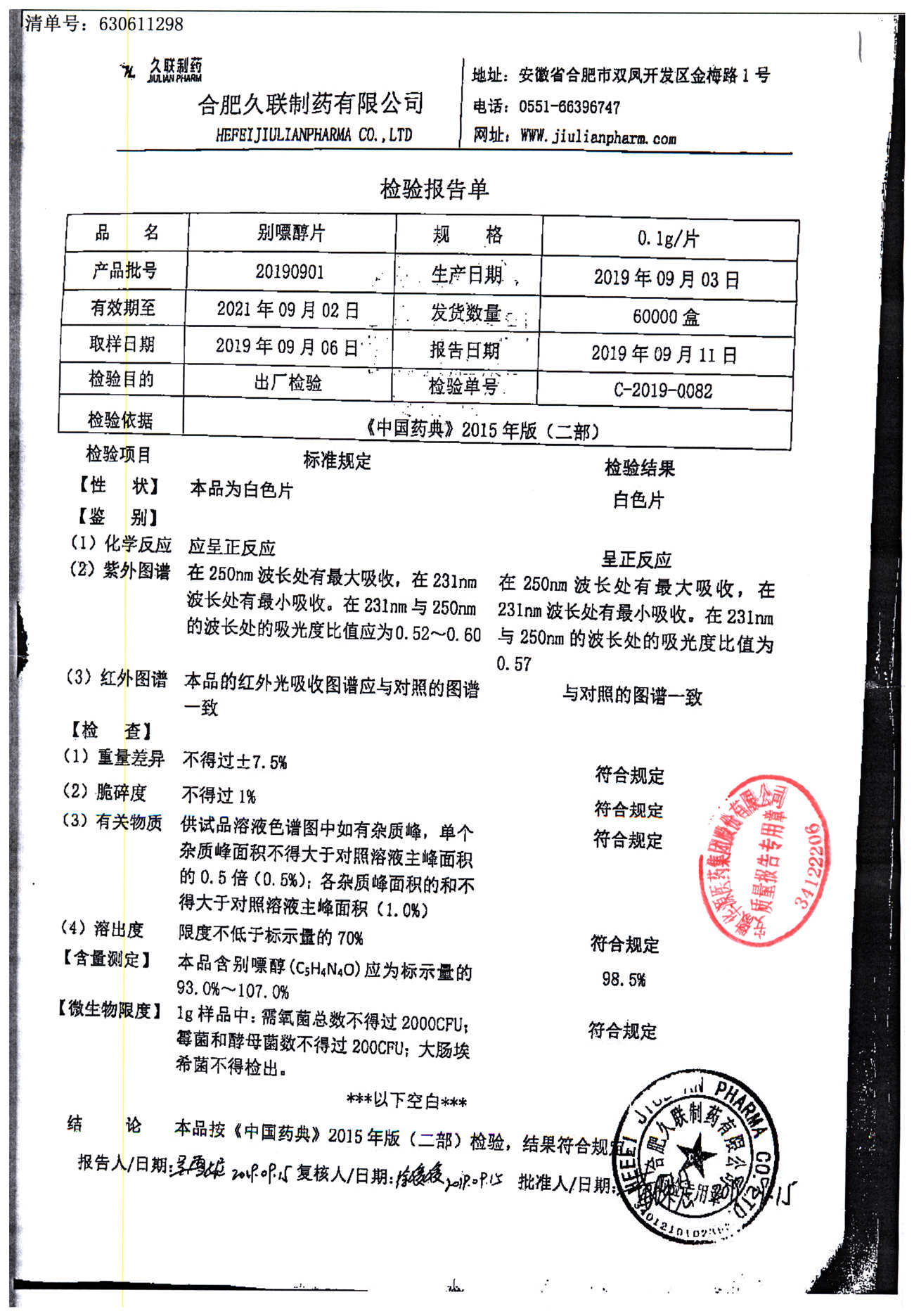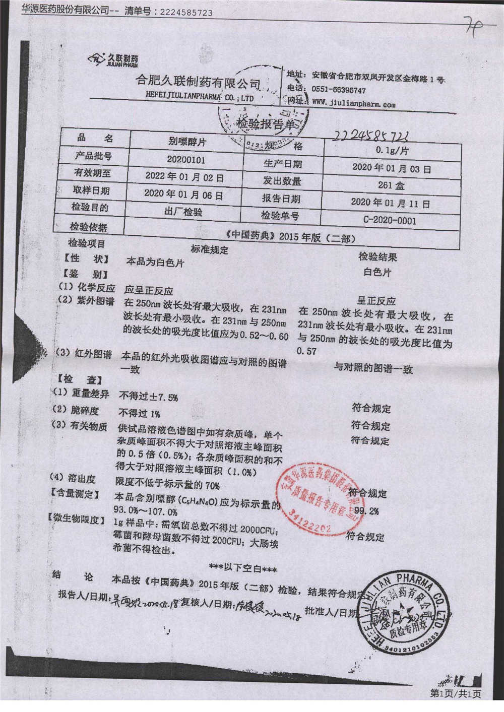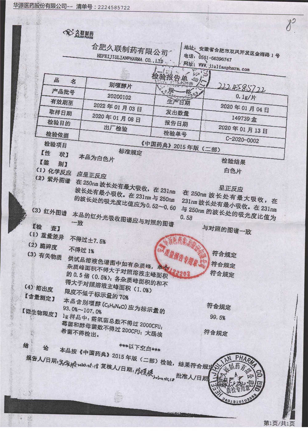 别嘌醇片 | 0.1g | 20200910 | 查看详情 |