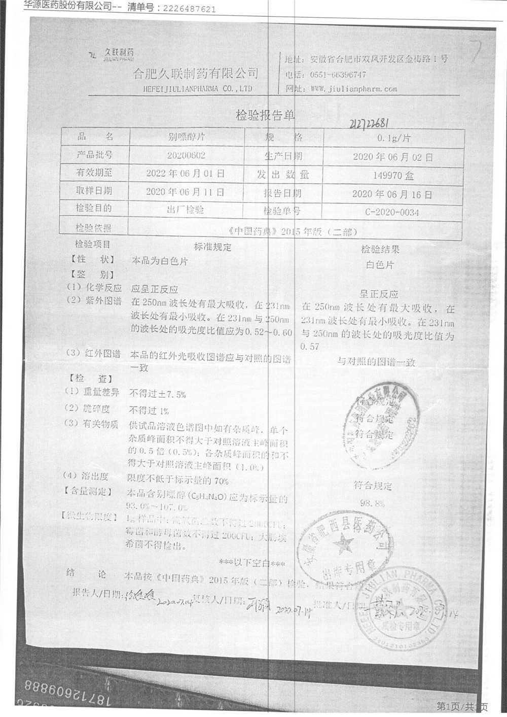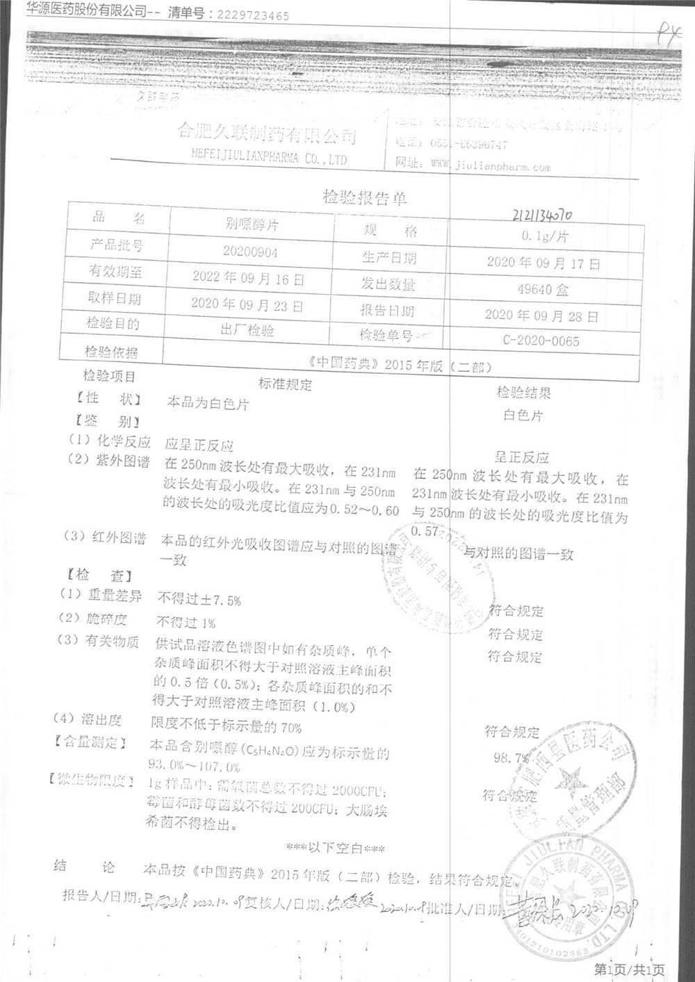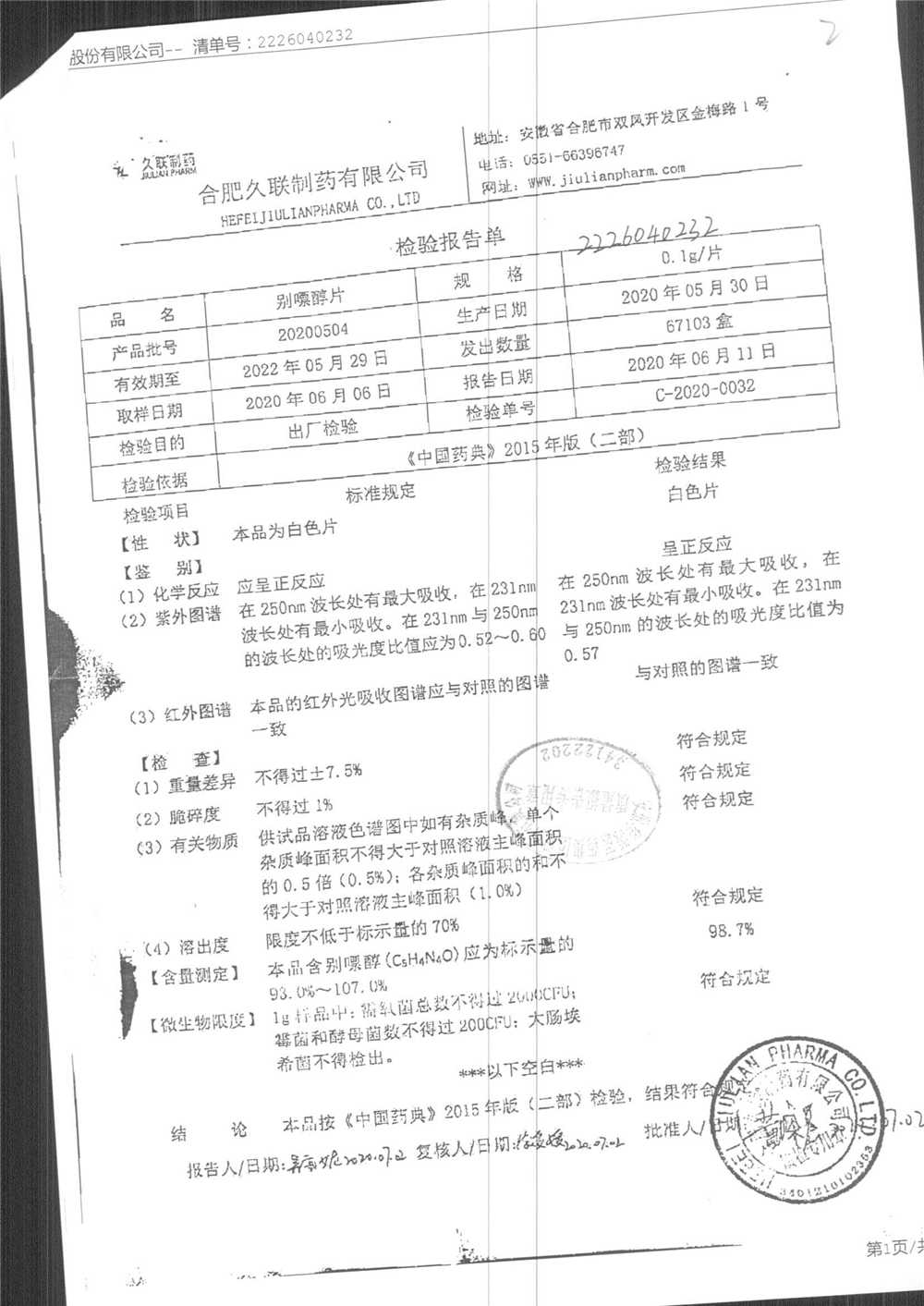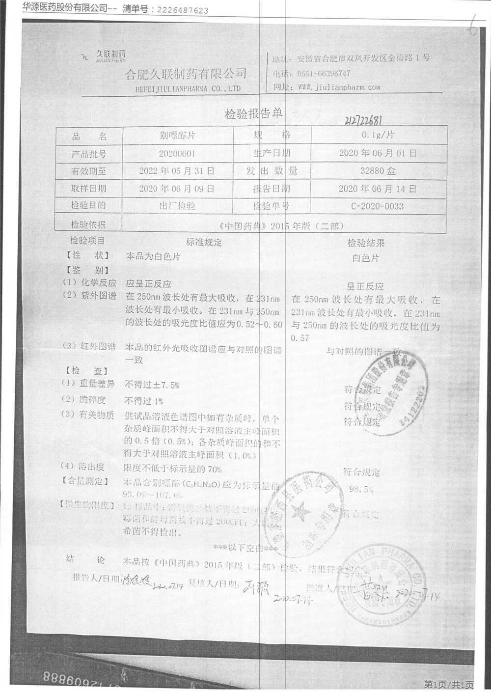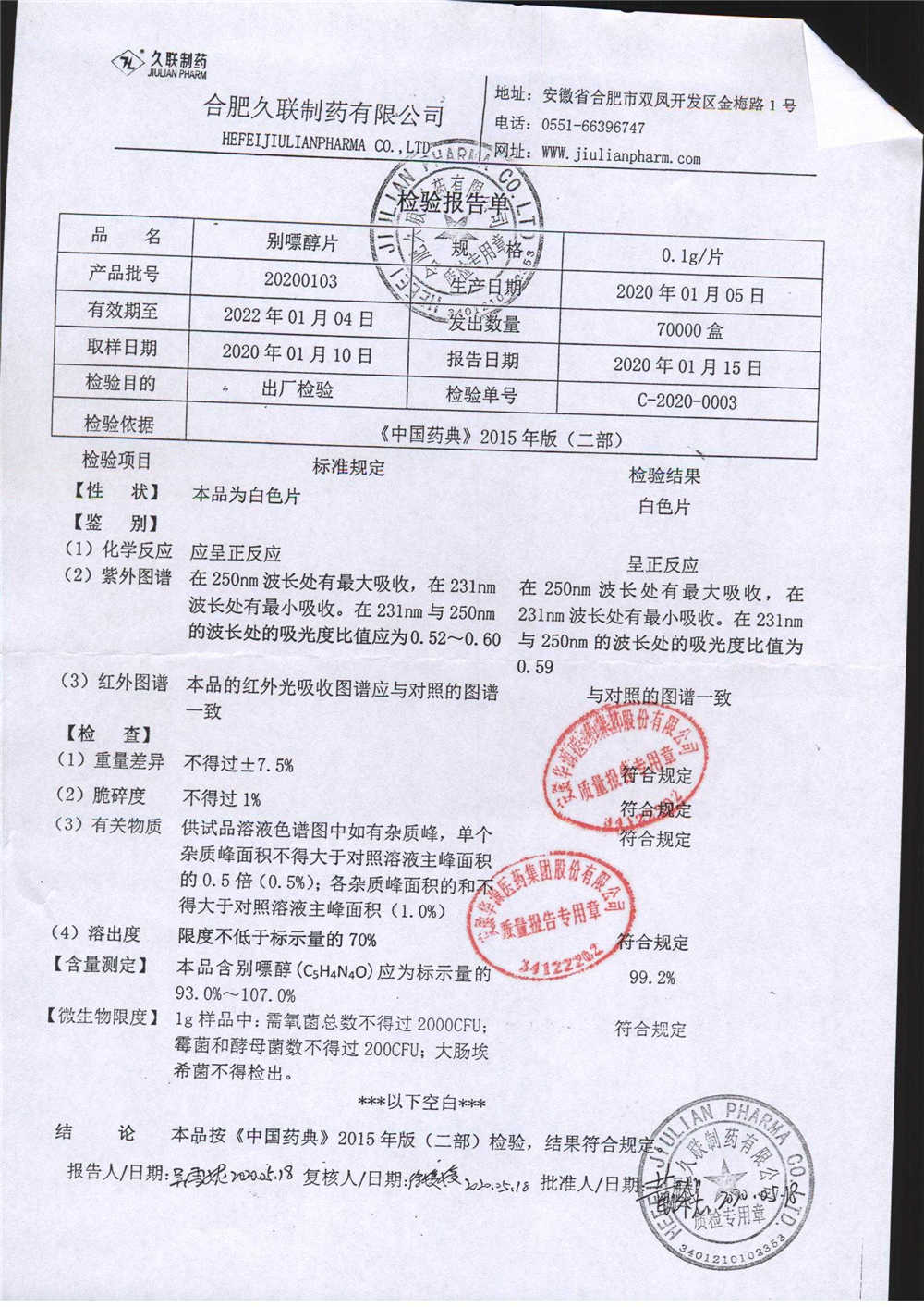 别嘌醇片 | 0.1g | 20200910 | 查看详情 |