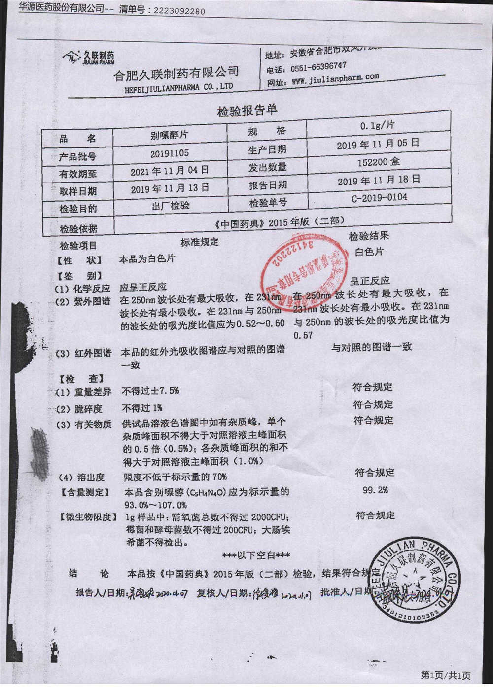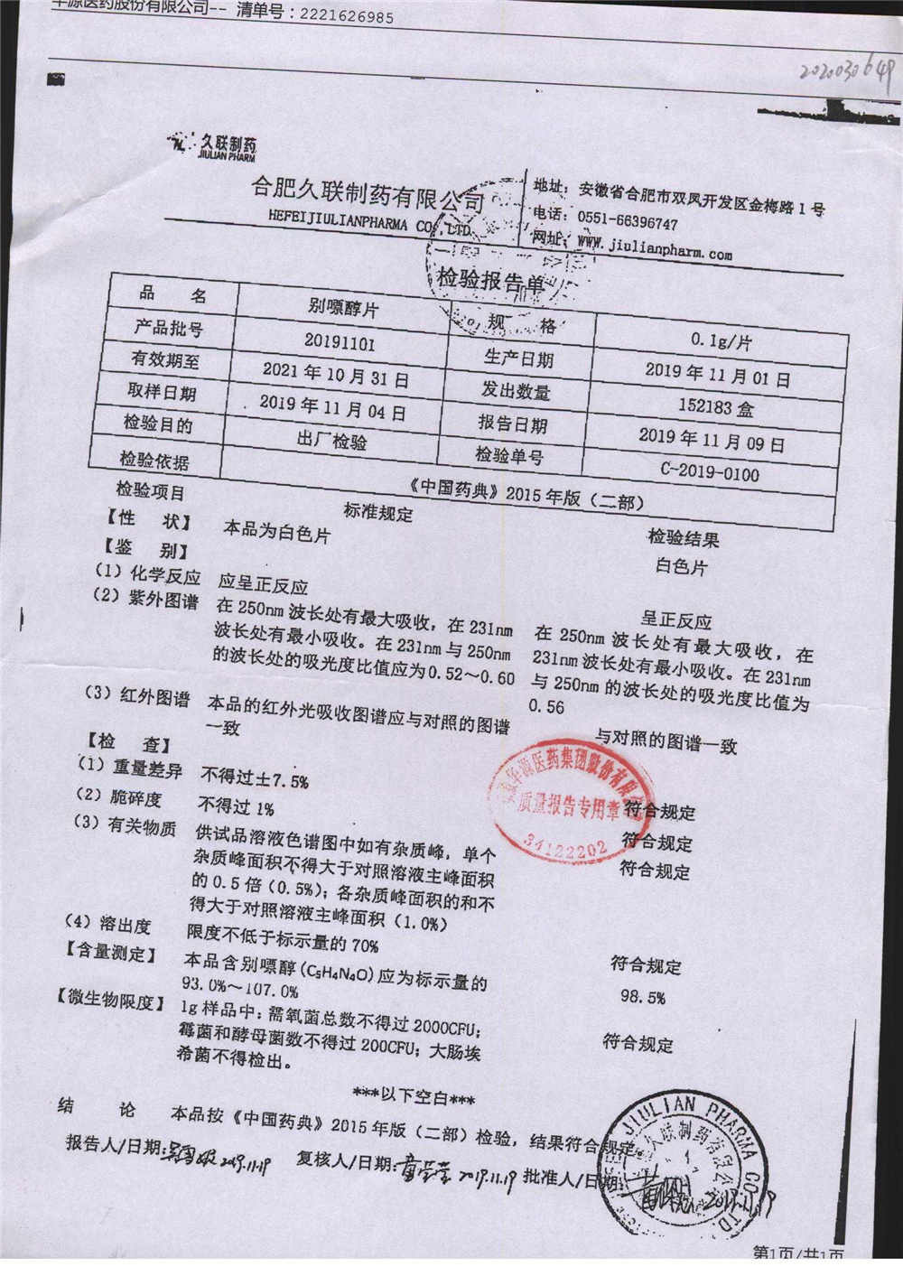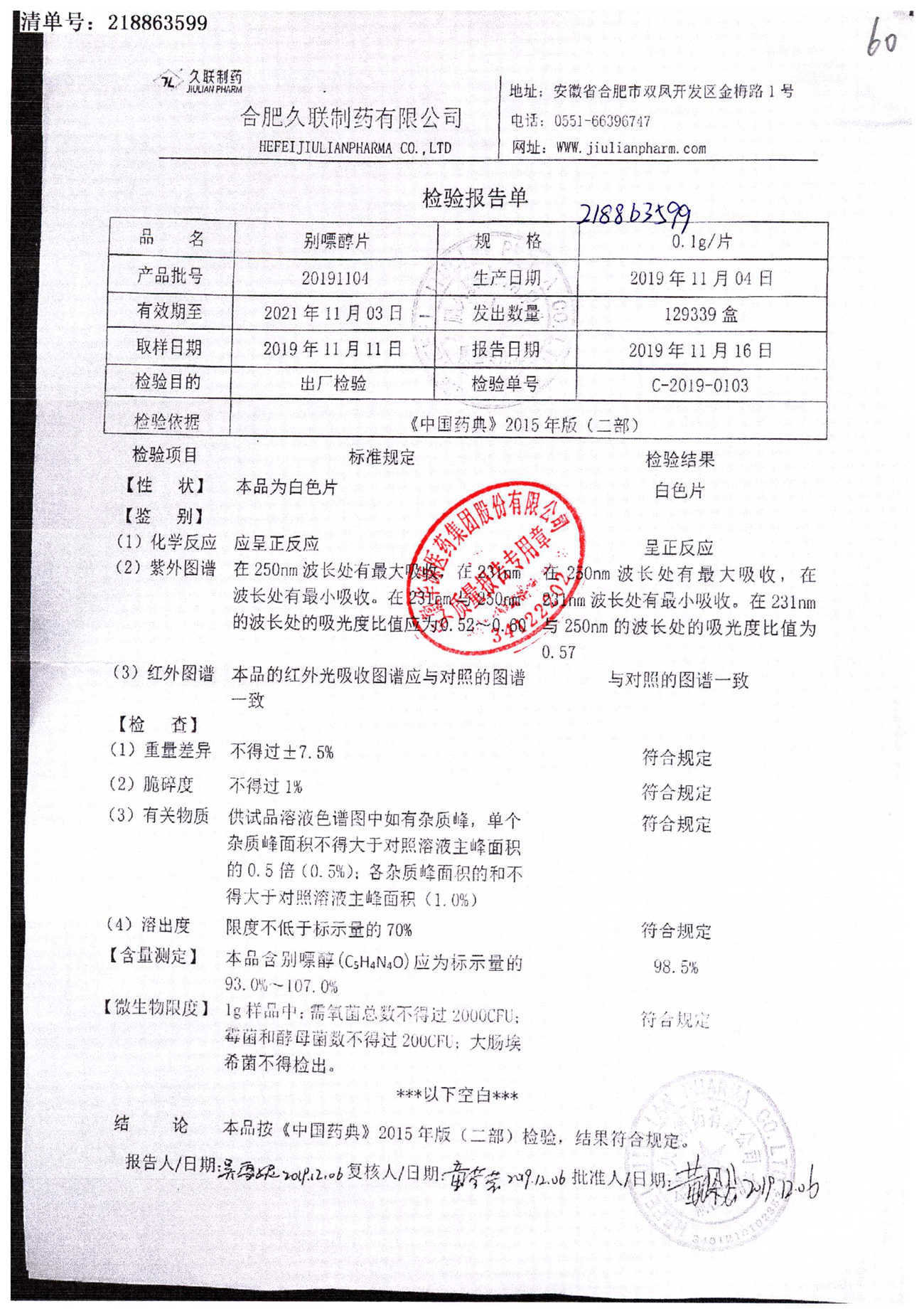 别嘌醇片 | 0.1g | 20191105 | 查看详情 |