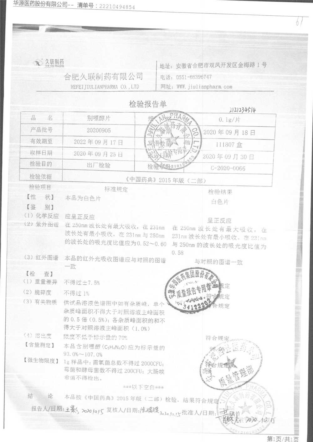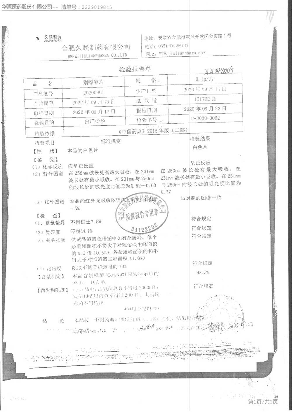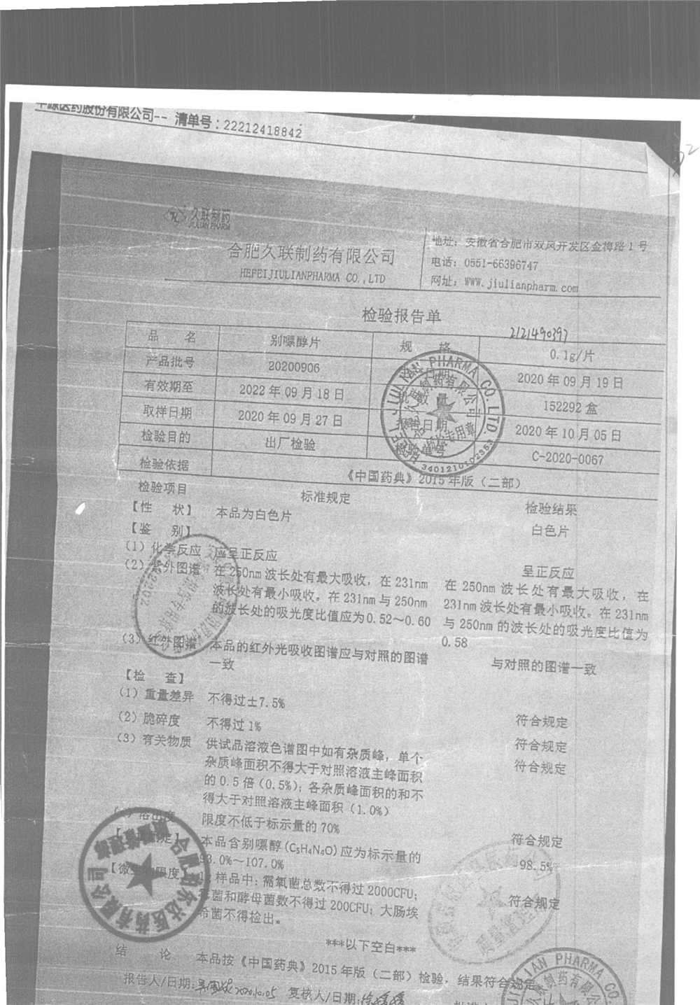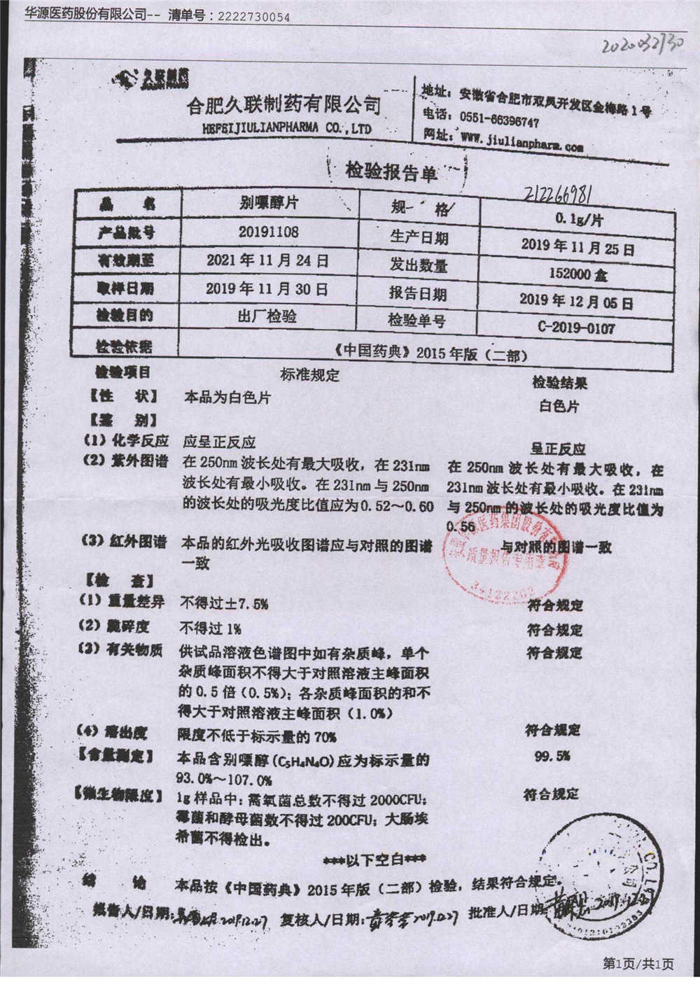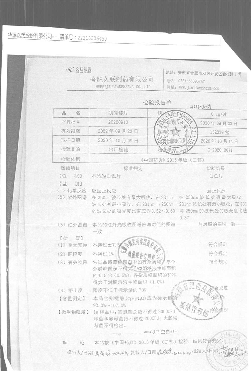 别嘌醇片 | 0.1g | 20201005 | 查看详情 |