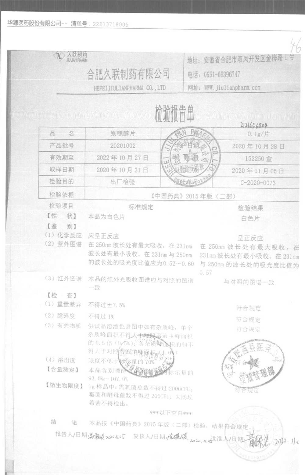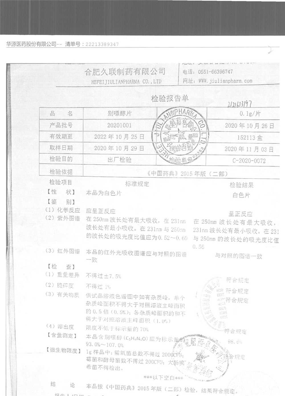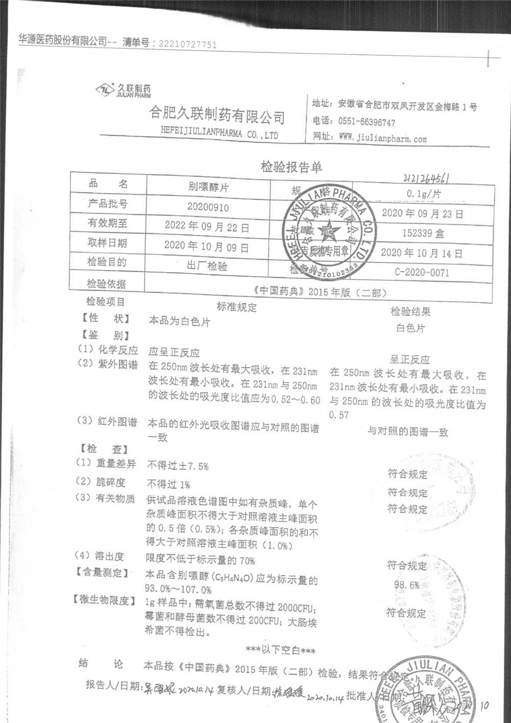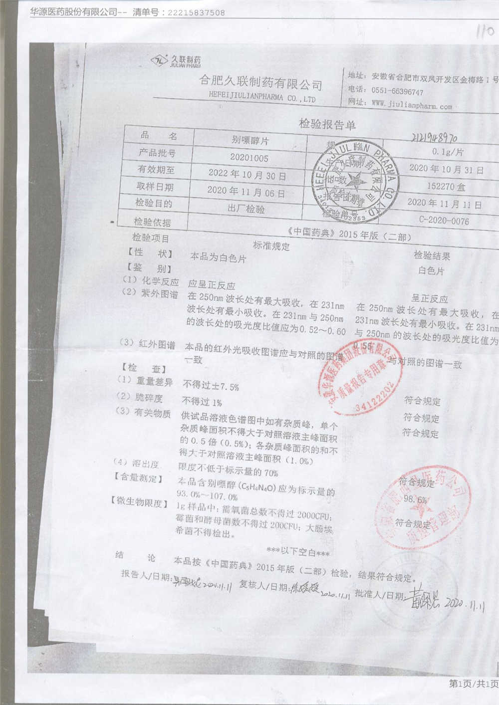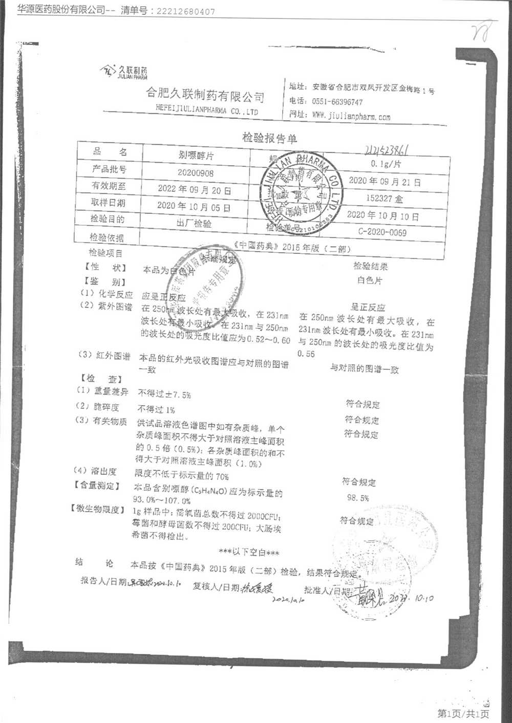 别嘌醇片 | 0.1g | 20201005 | 查看详情 |