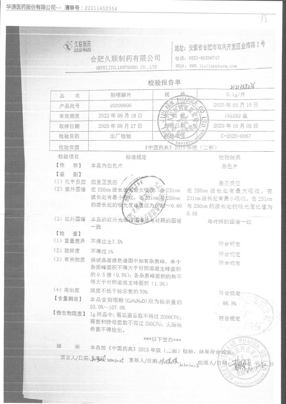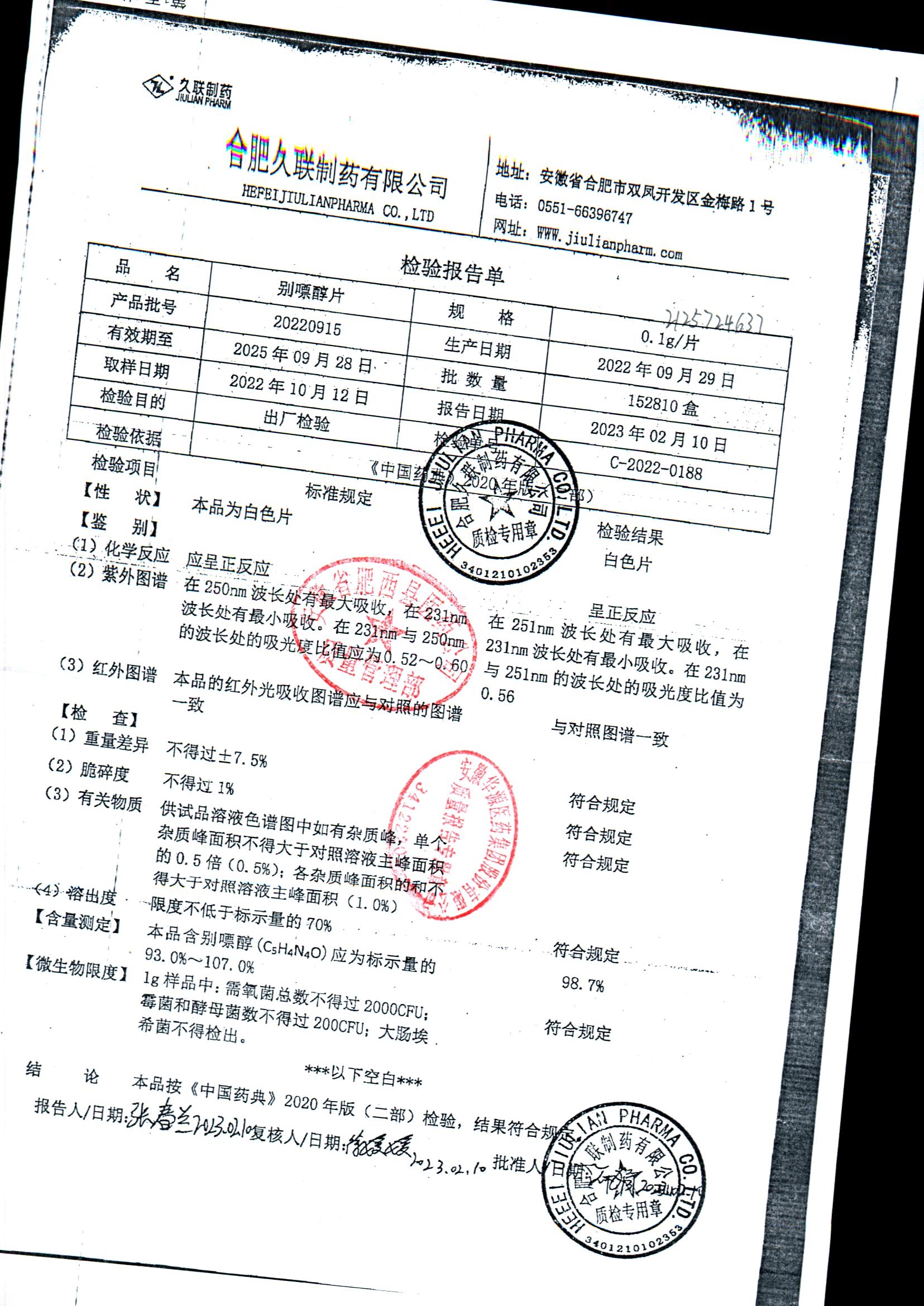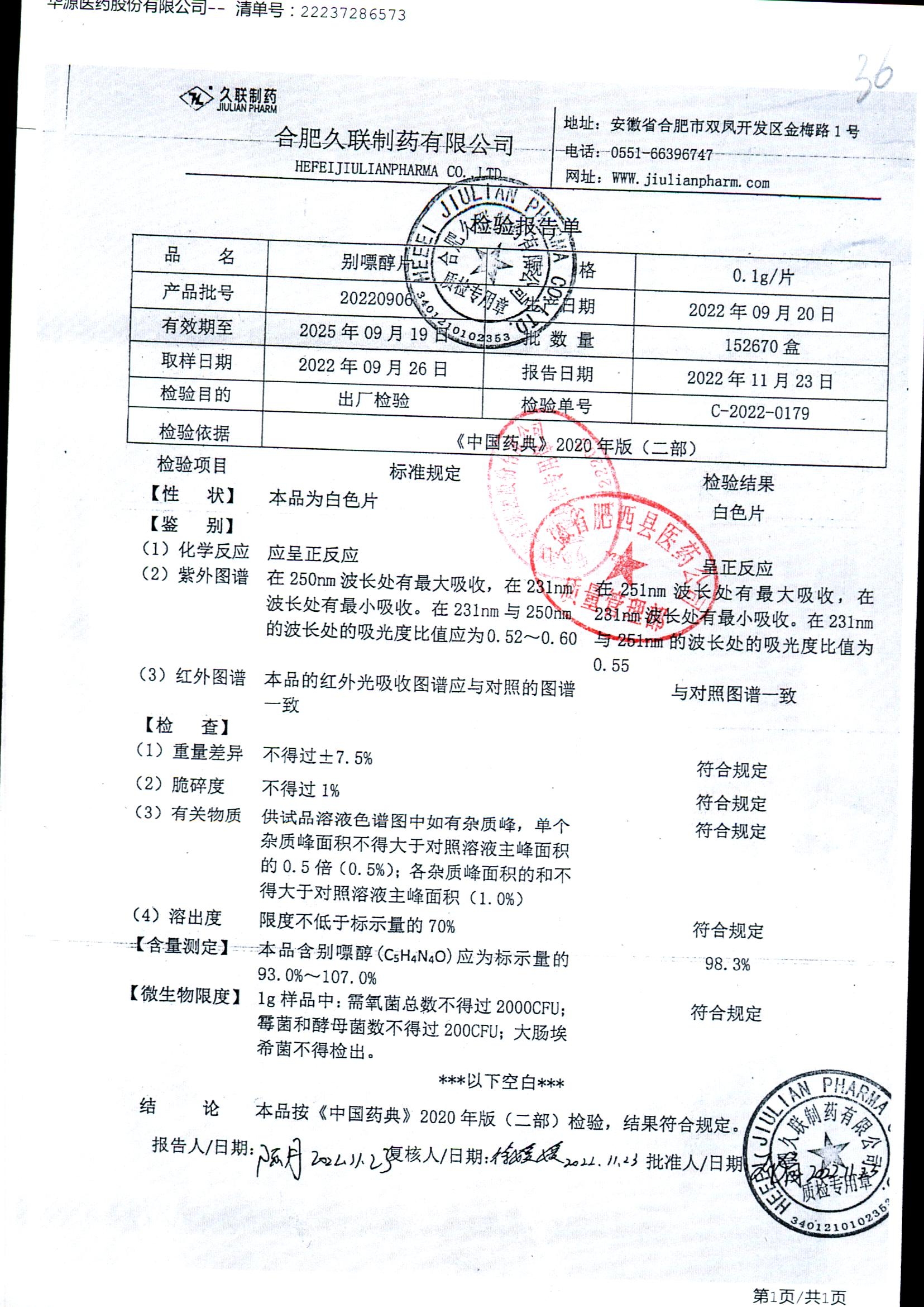 别嘌醇片 | 0.1g | 20220915 | 查看详情 |