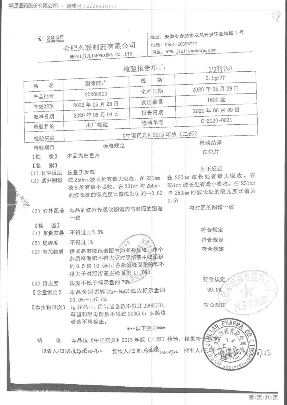 别嘌醇片 | 0.1g | 20200905 | 查看详情 |