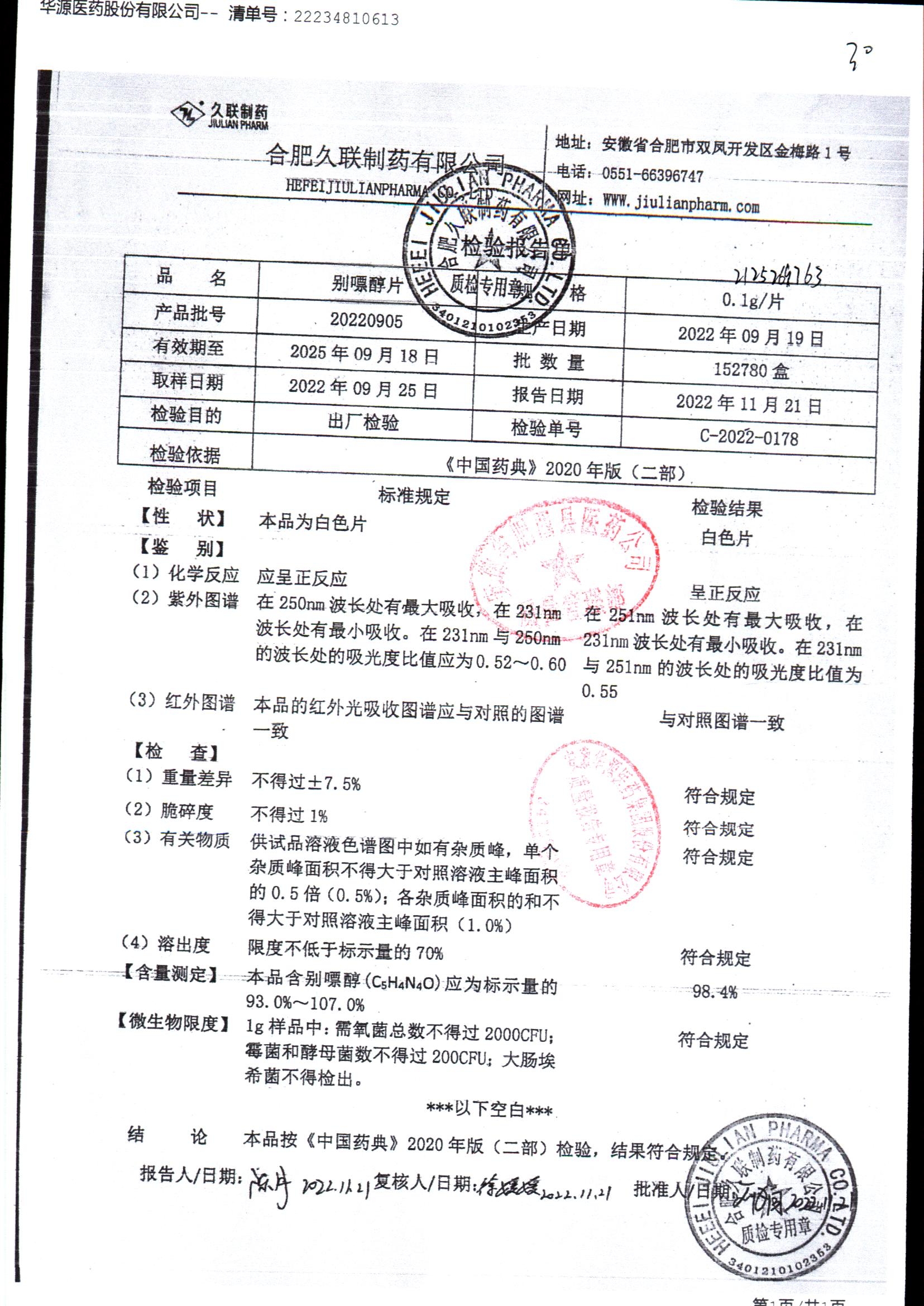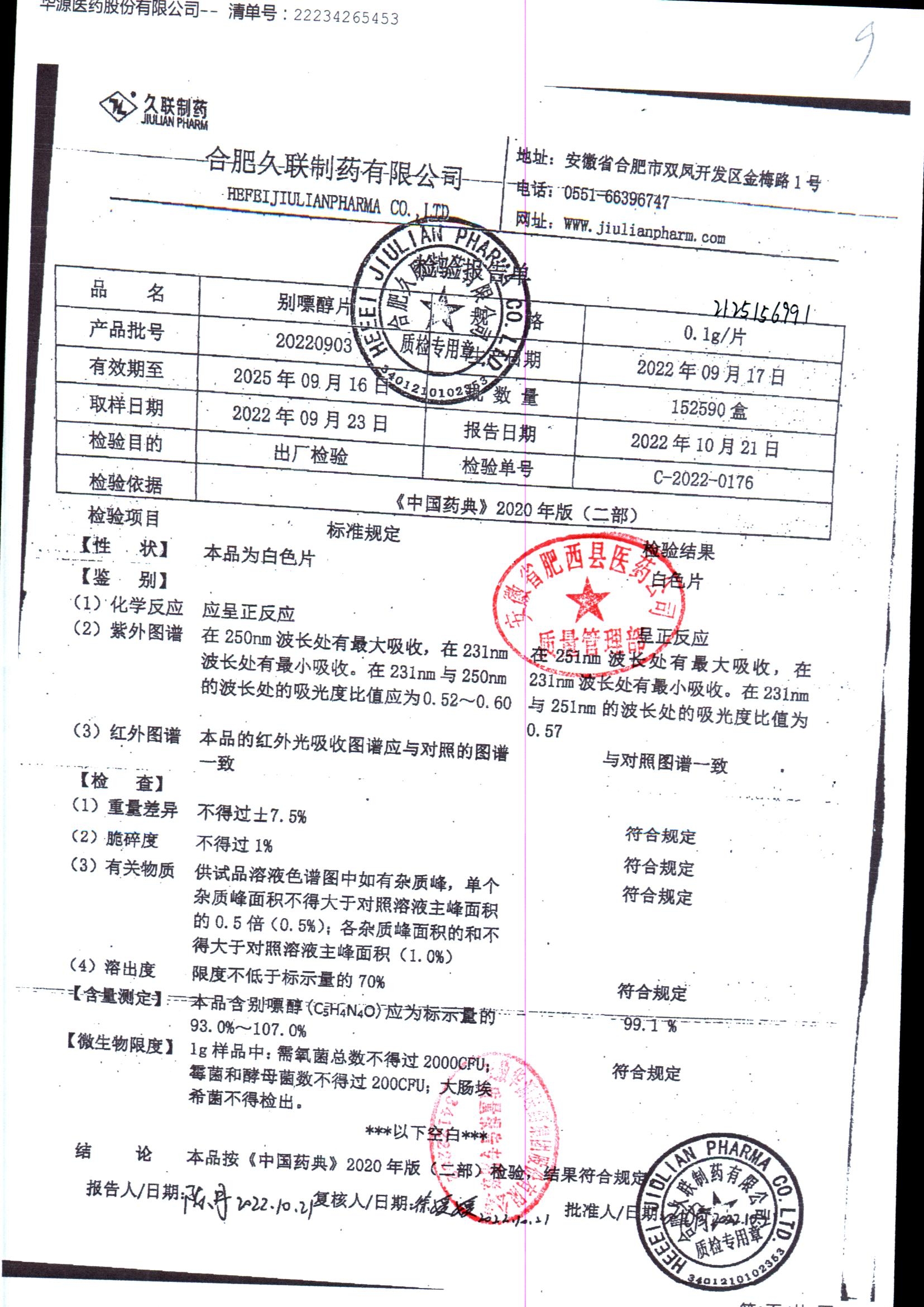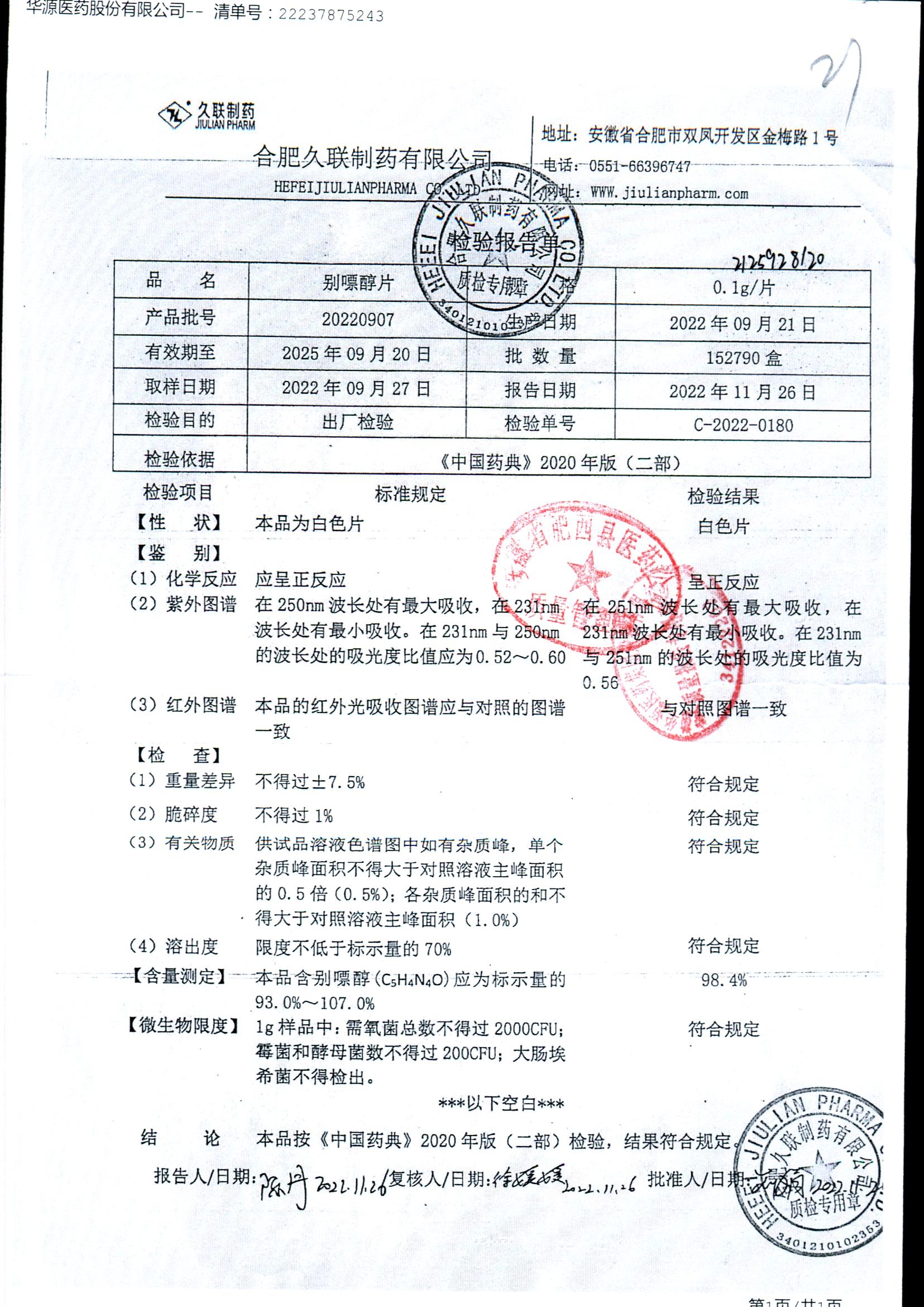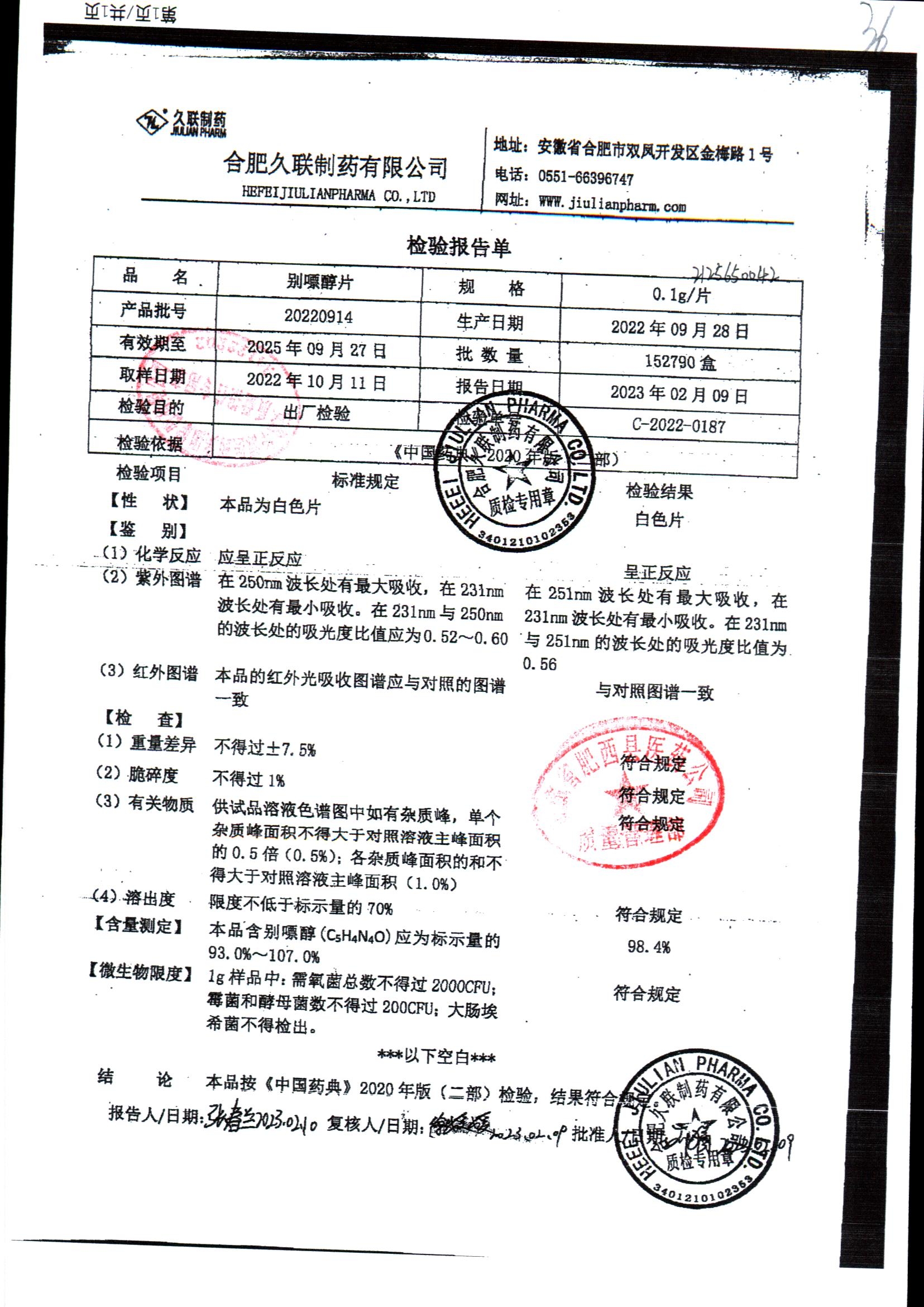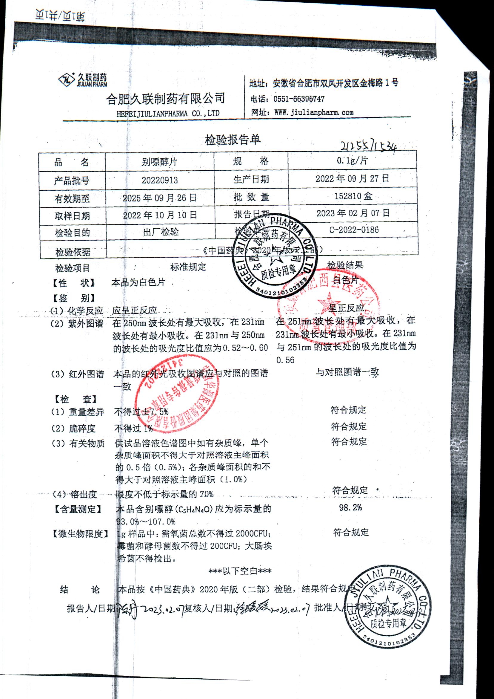 别嘌醇片 | 0.1g | 20220911 | 查看详情 |