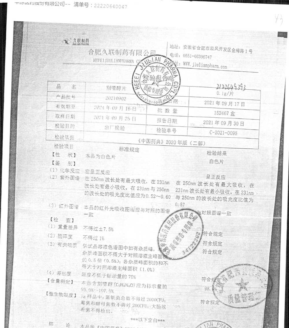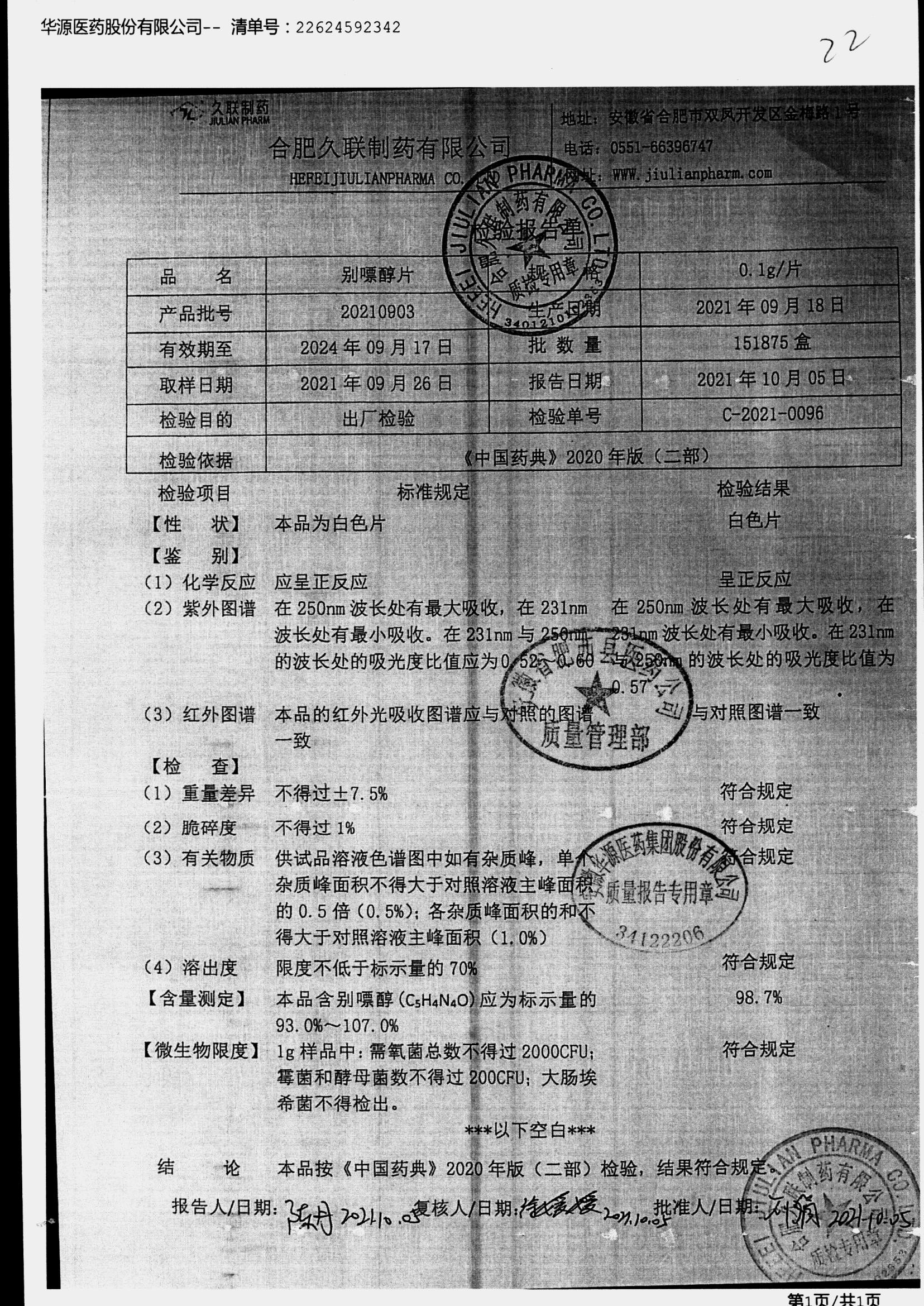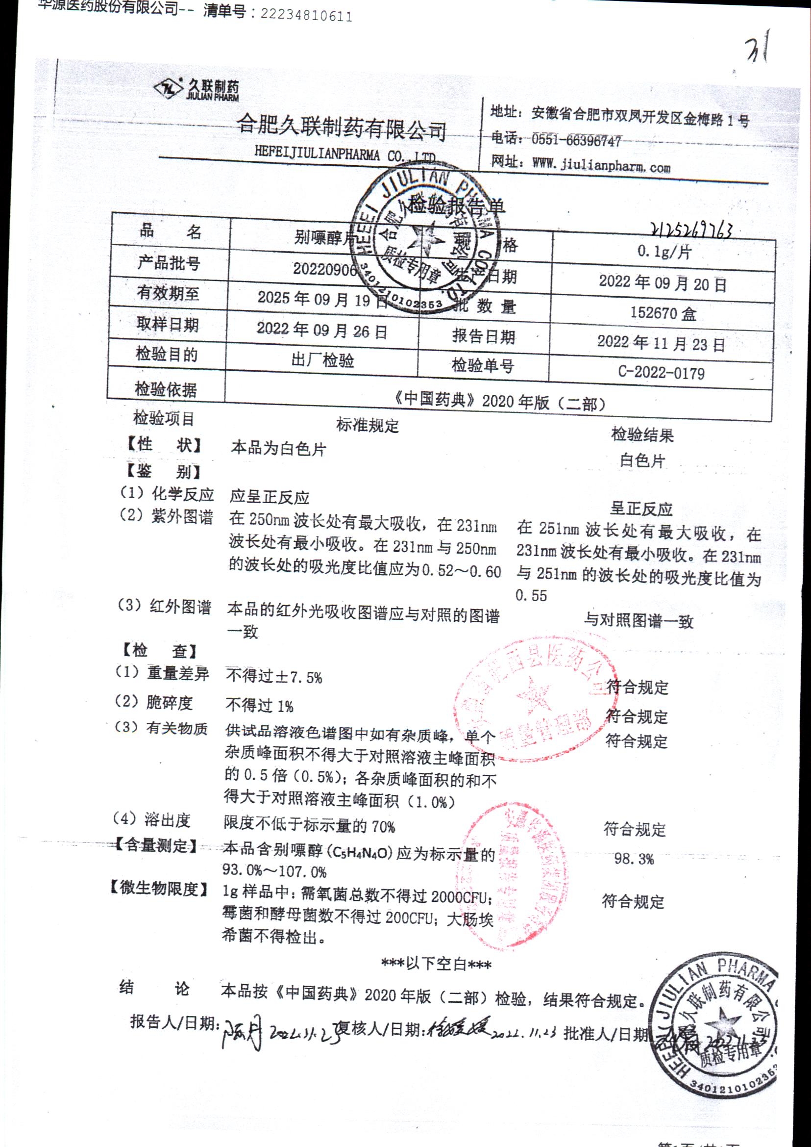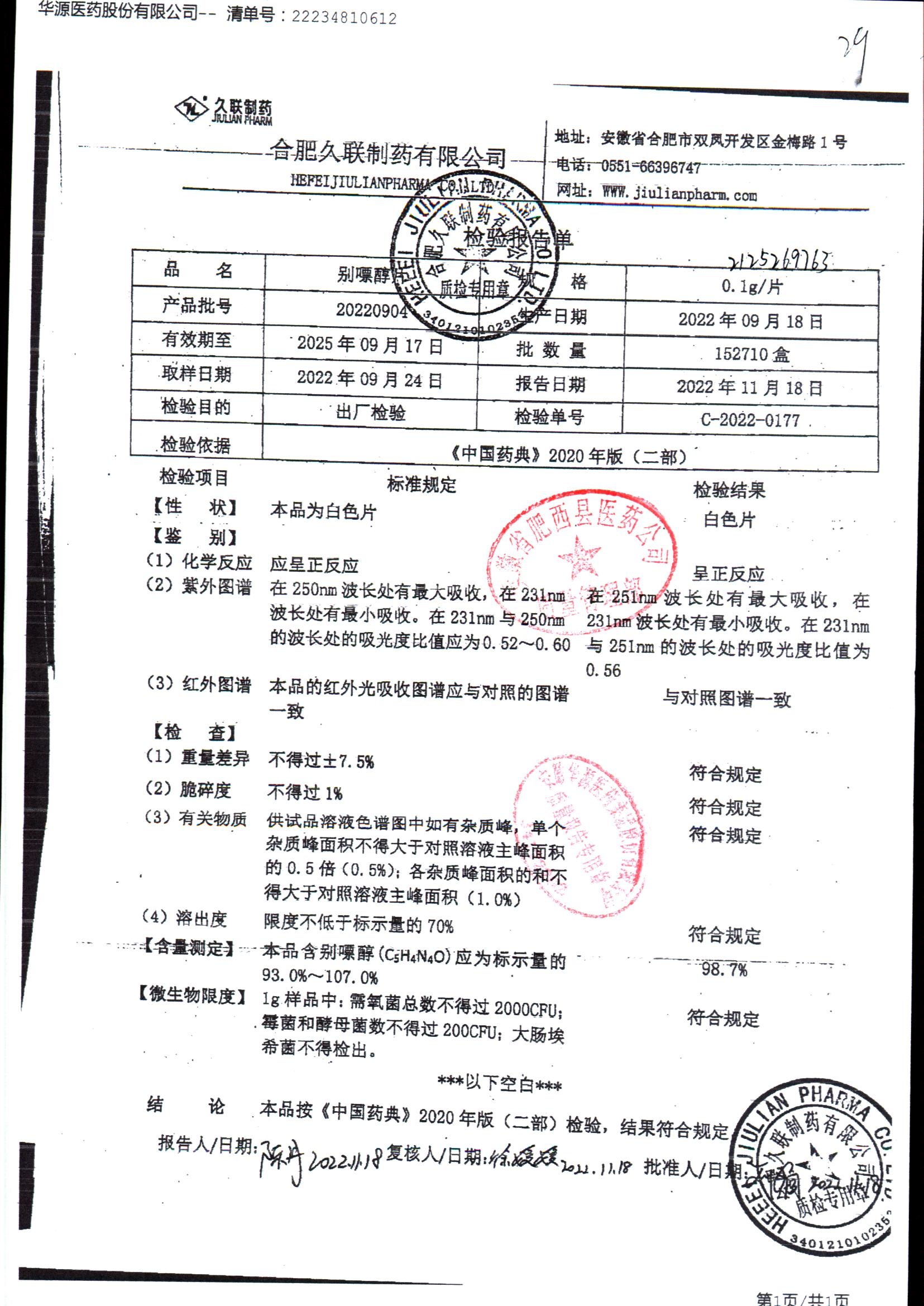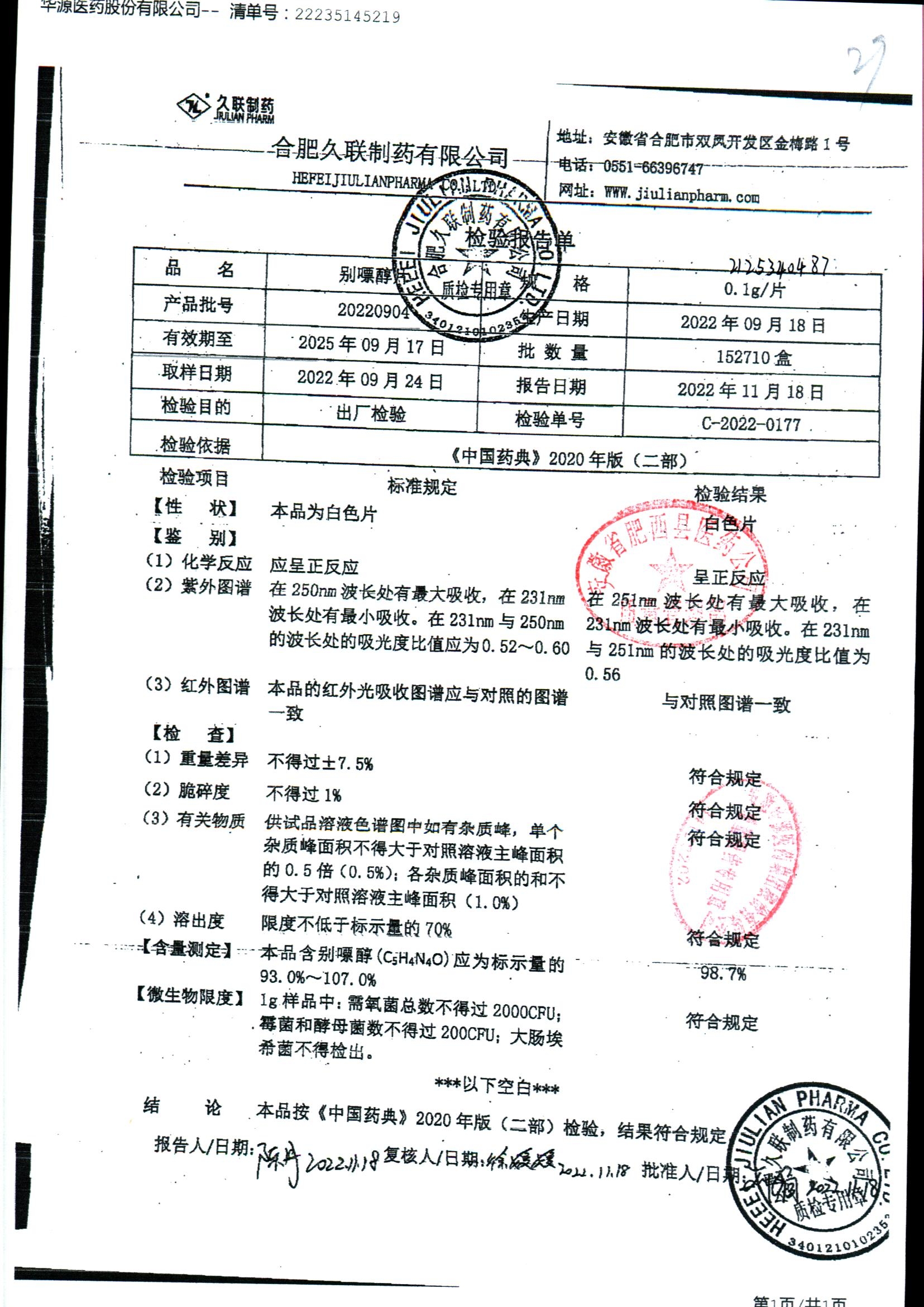 别嘌醇片 | 0.1g | 20220911 | 查看详情 |