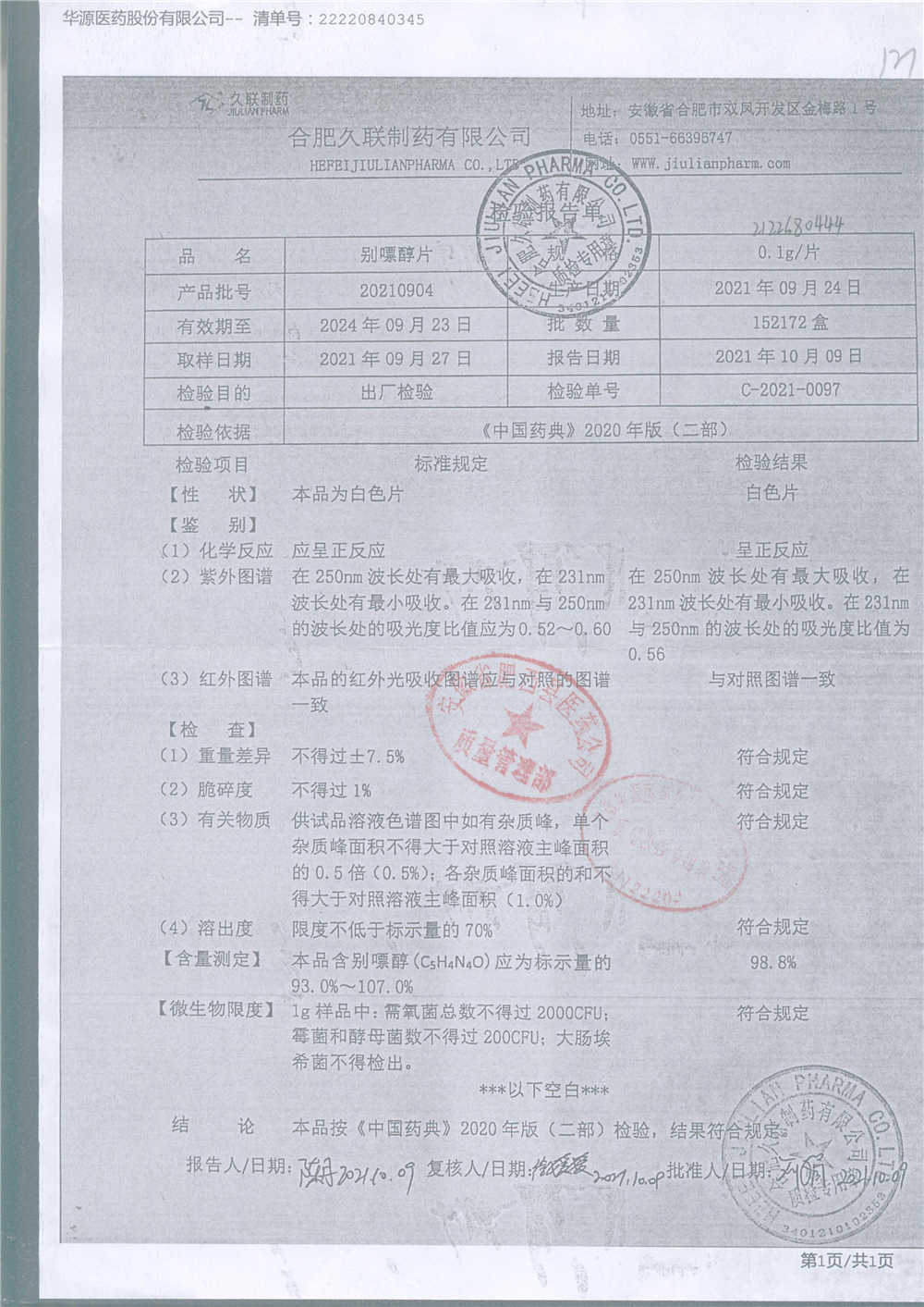别嘌醇片 | 0.1g | 20210904 | 查看详情 |