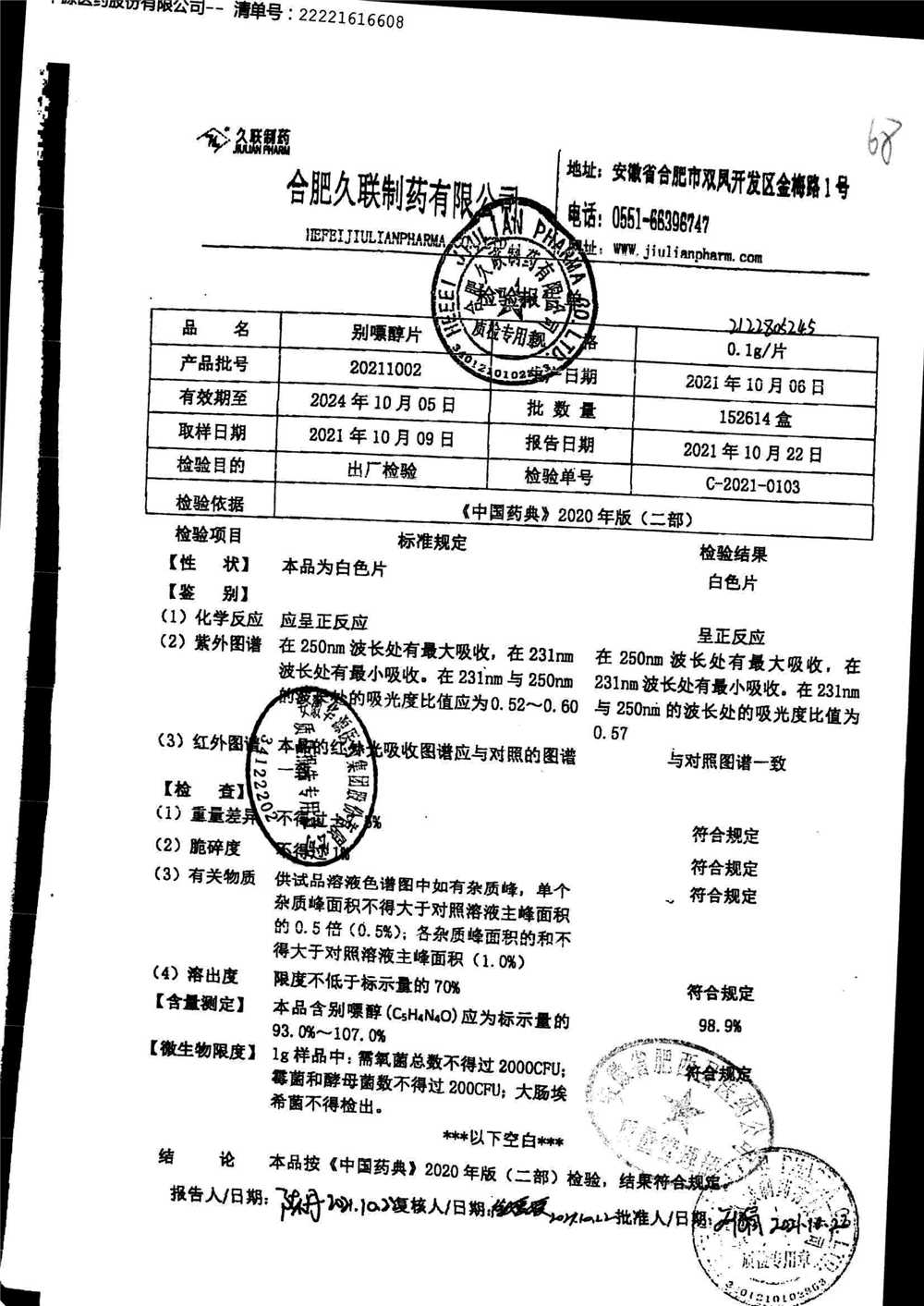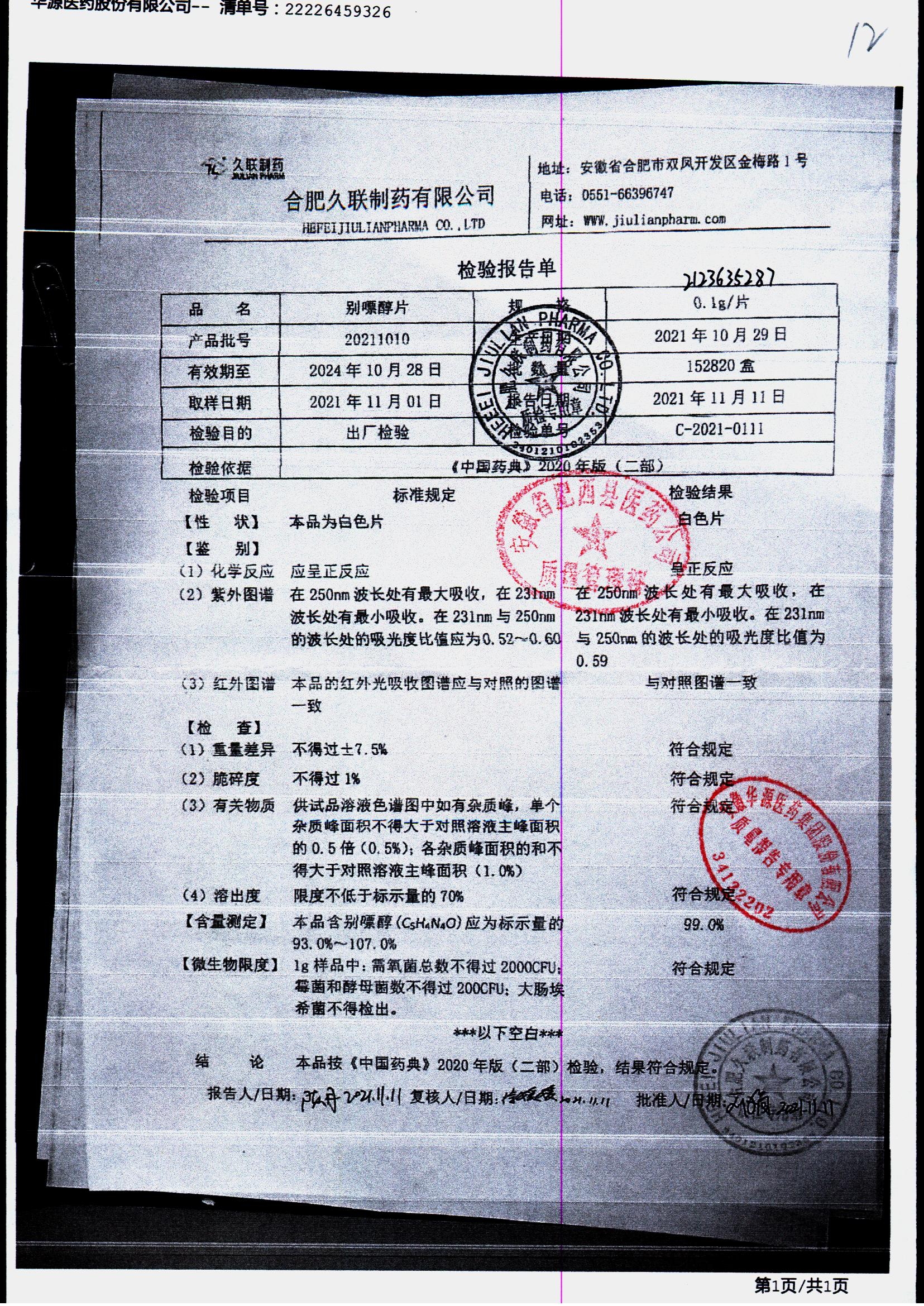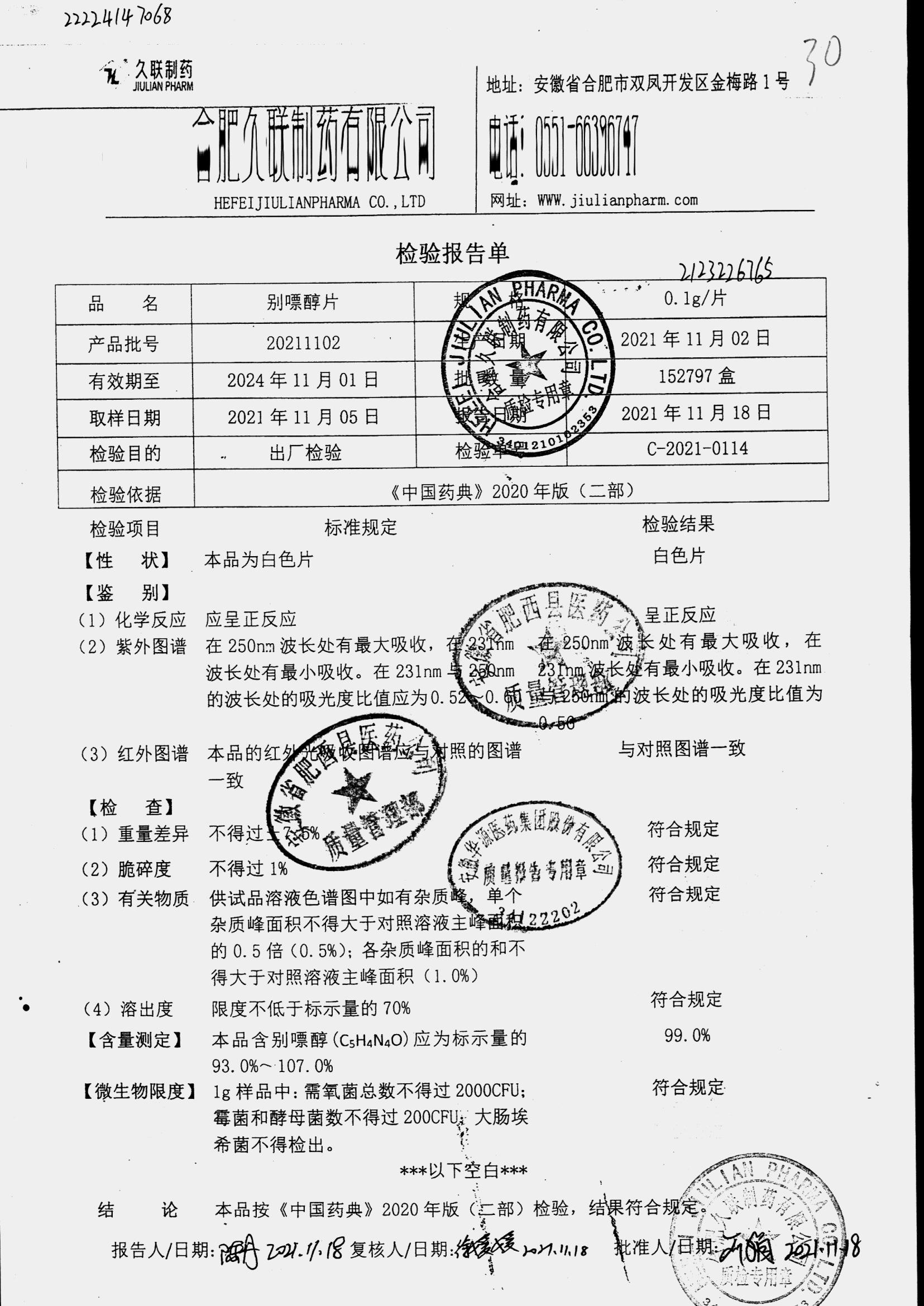 别嘌醇片 | 0.1g | 20211102 | 查看详情 |