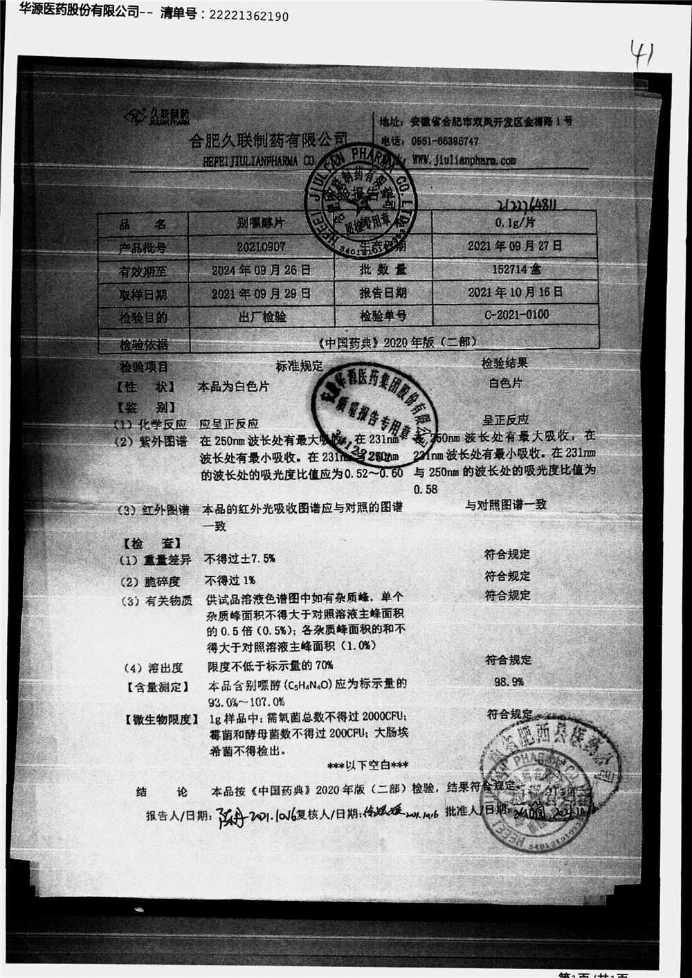 别嘌醇片 | 0.1g | 20211009 | 查看详情 |