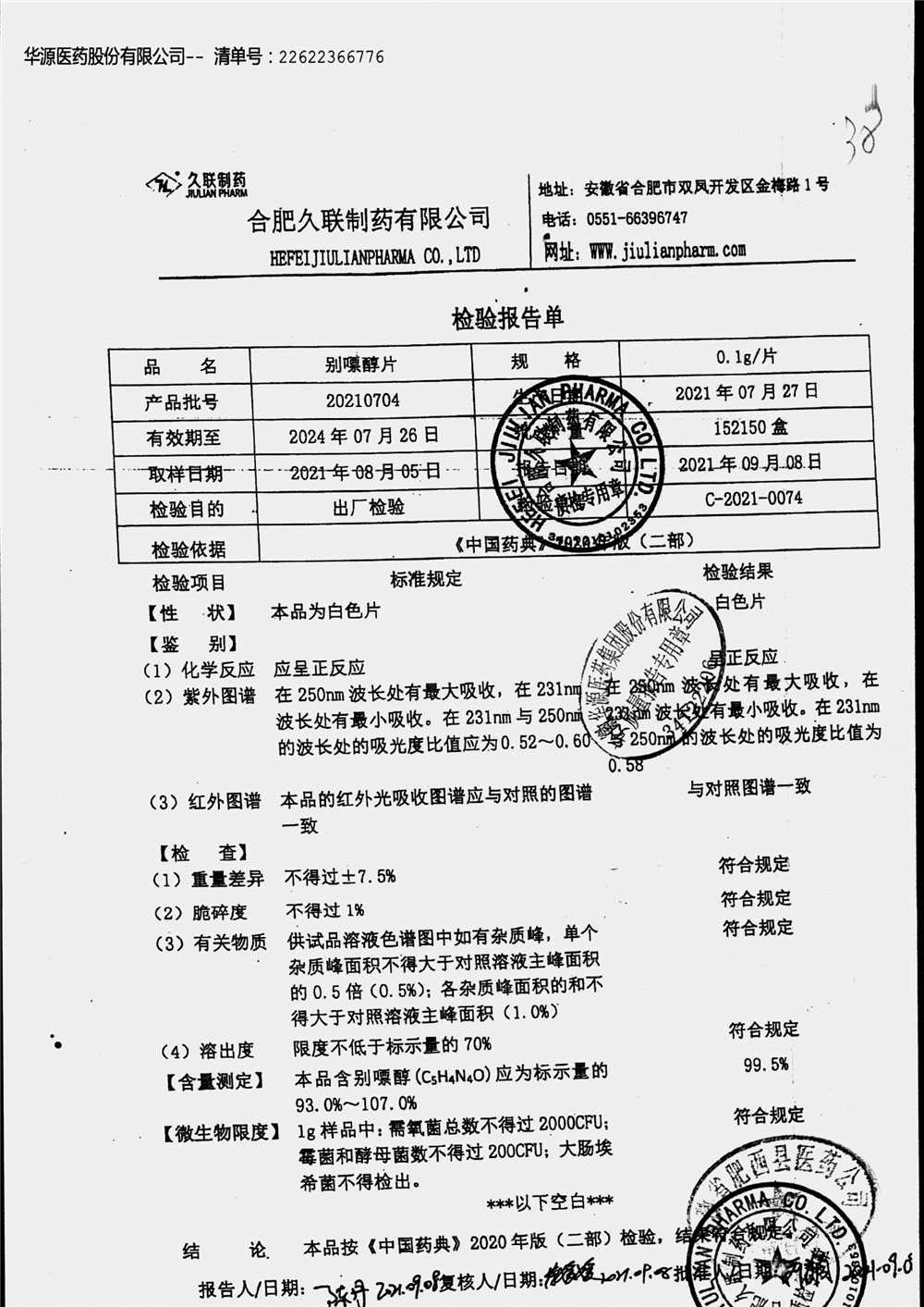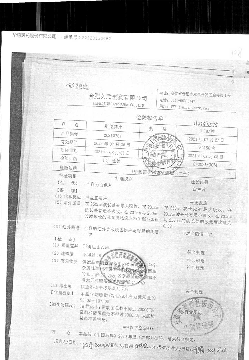 别嘌醇片 | 0.1g | 20210907 | 查看详情 |
