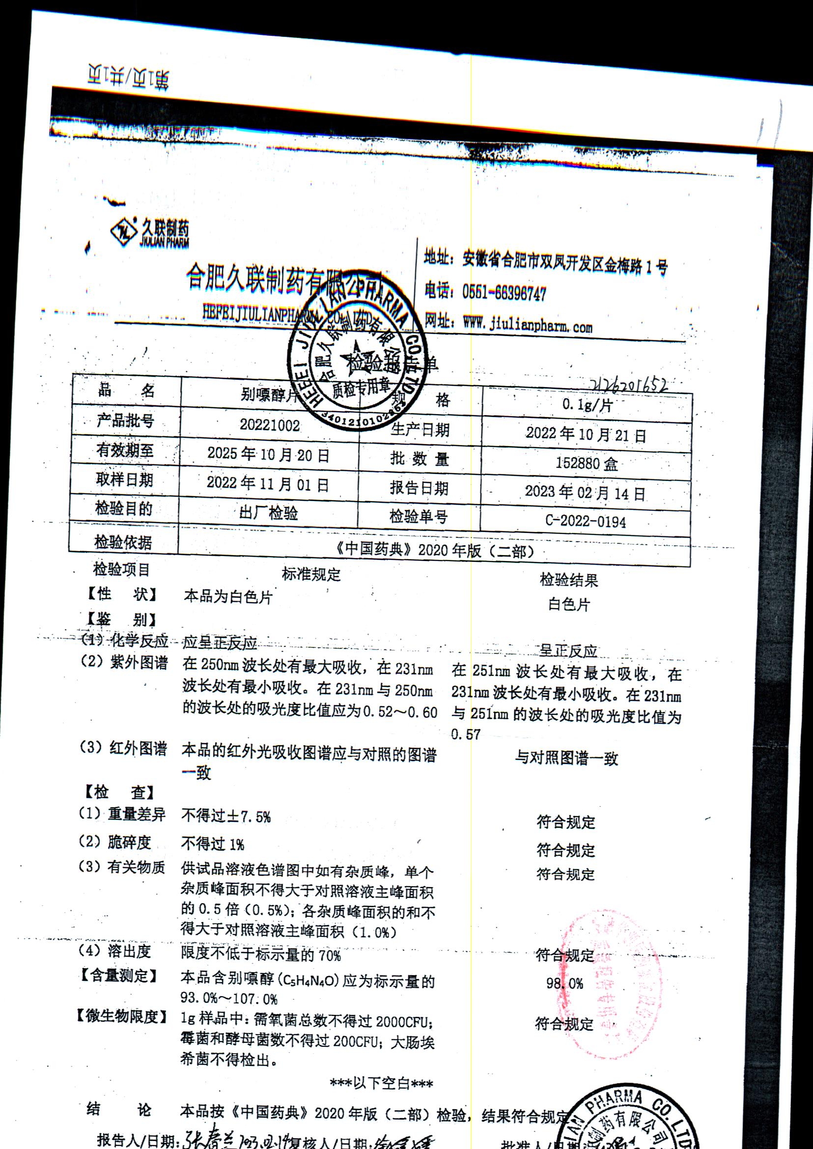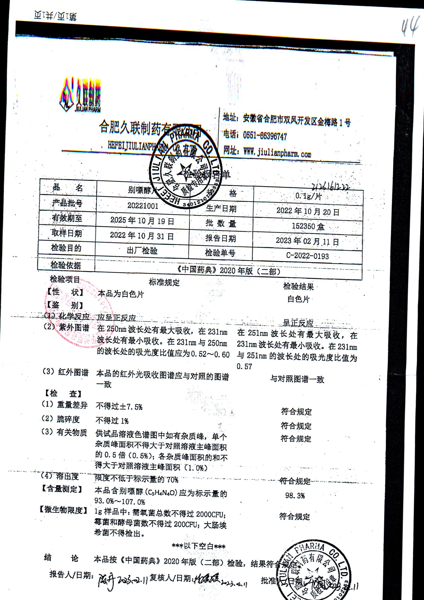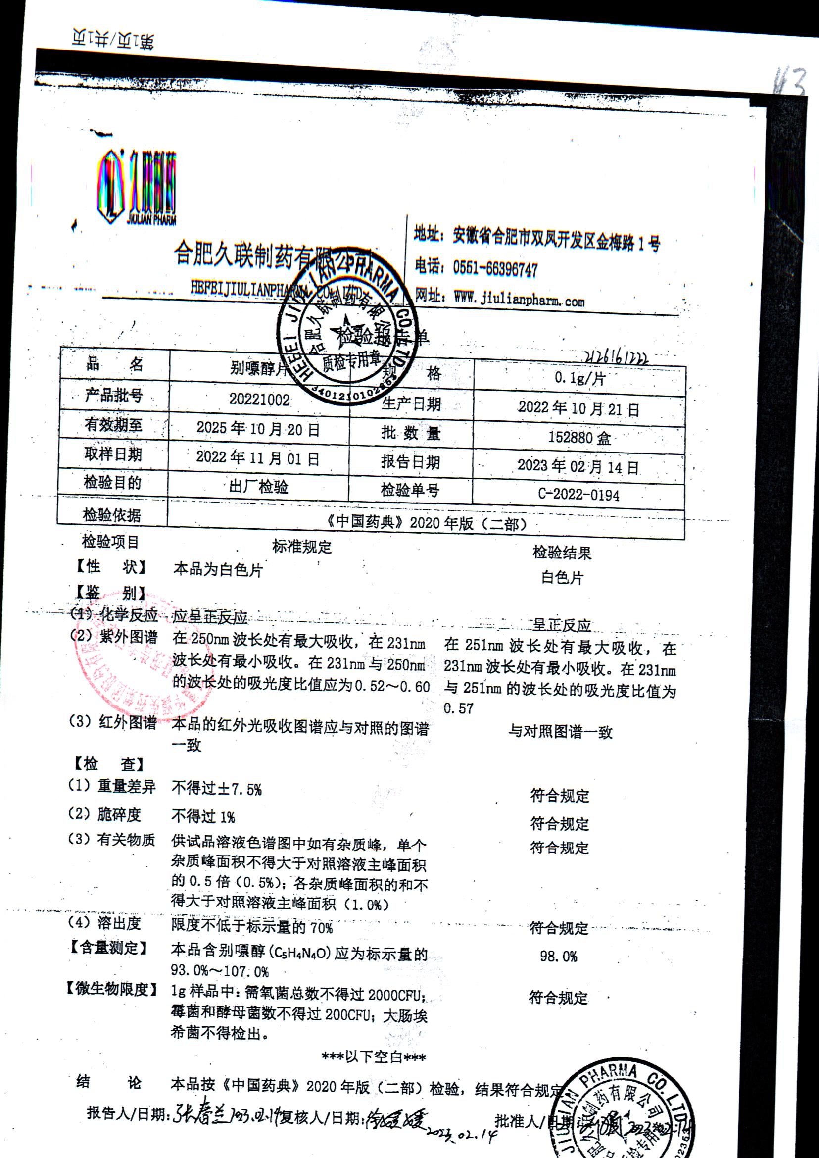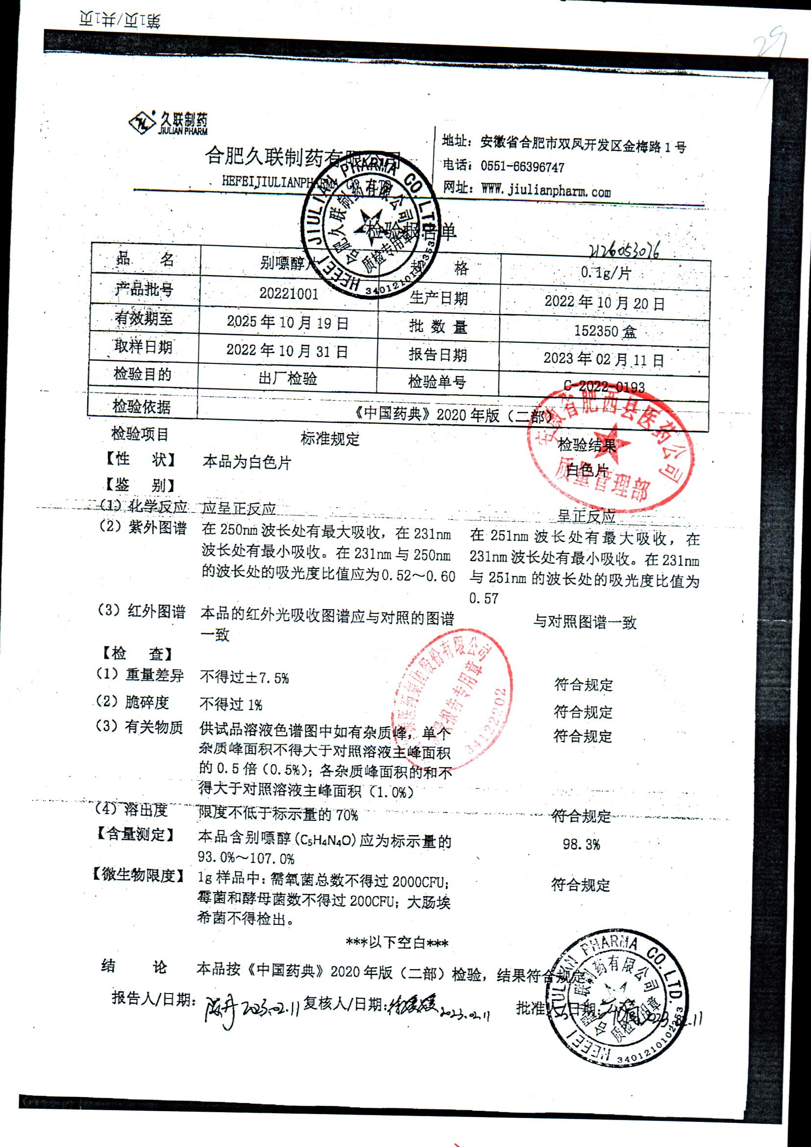 别嘌醇片 | 0.1g | 20220202 | 查看详情 |