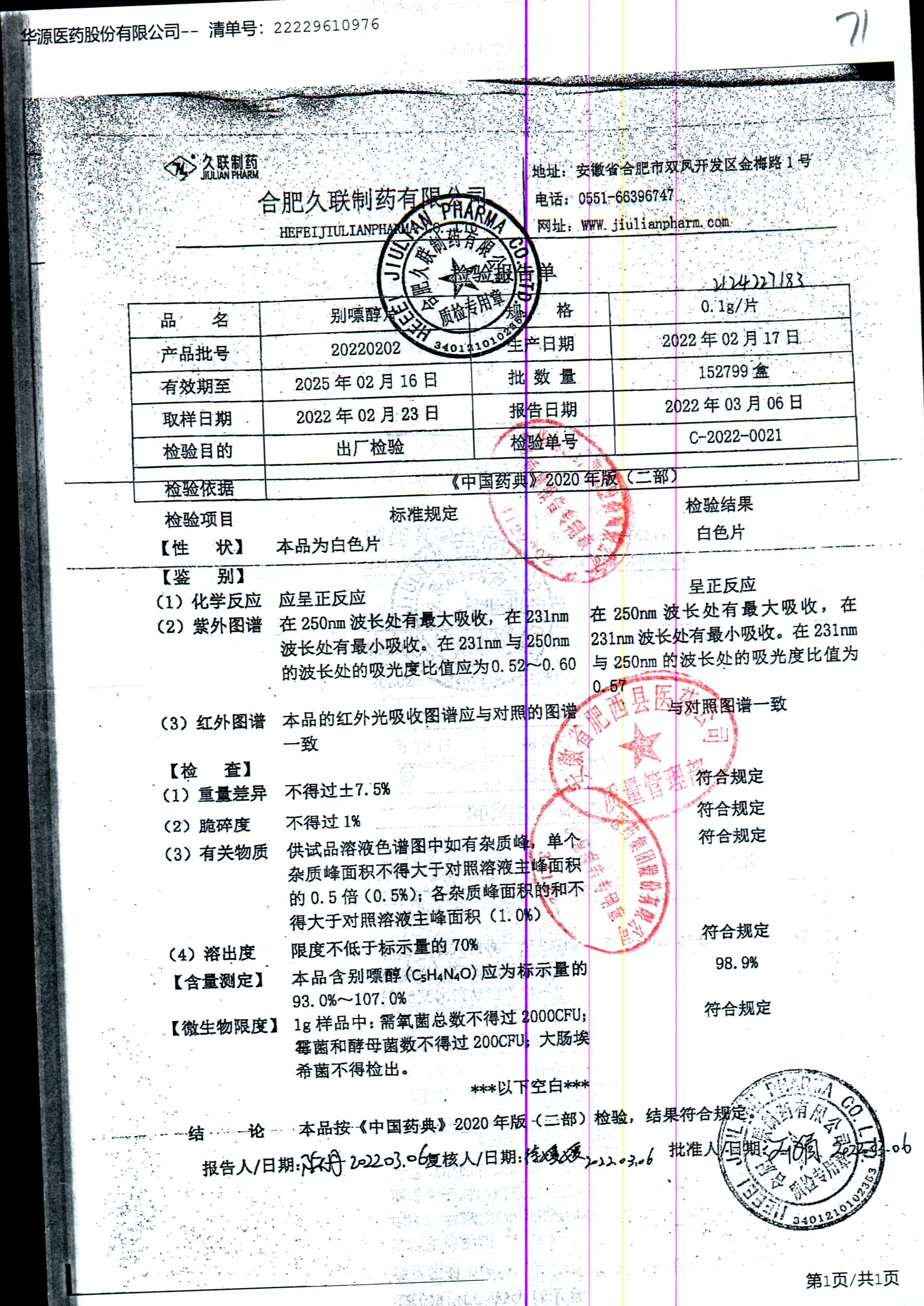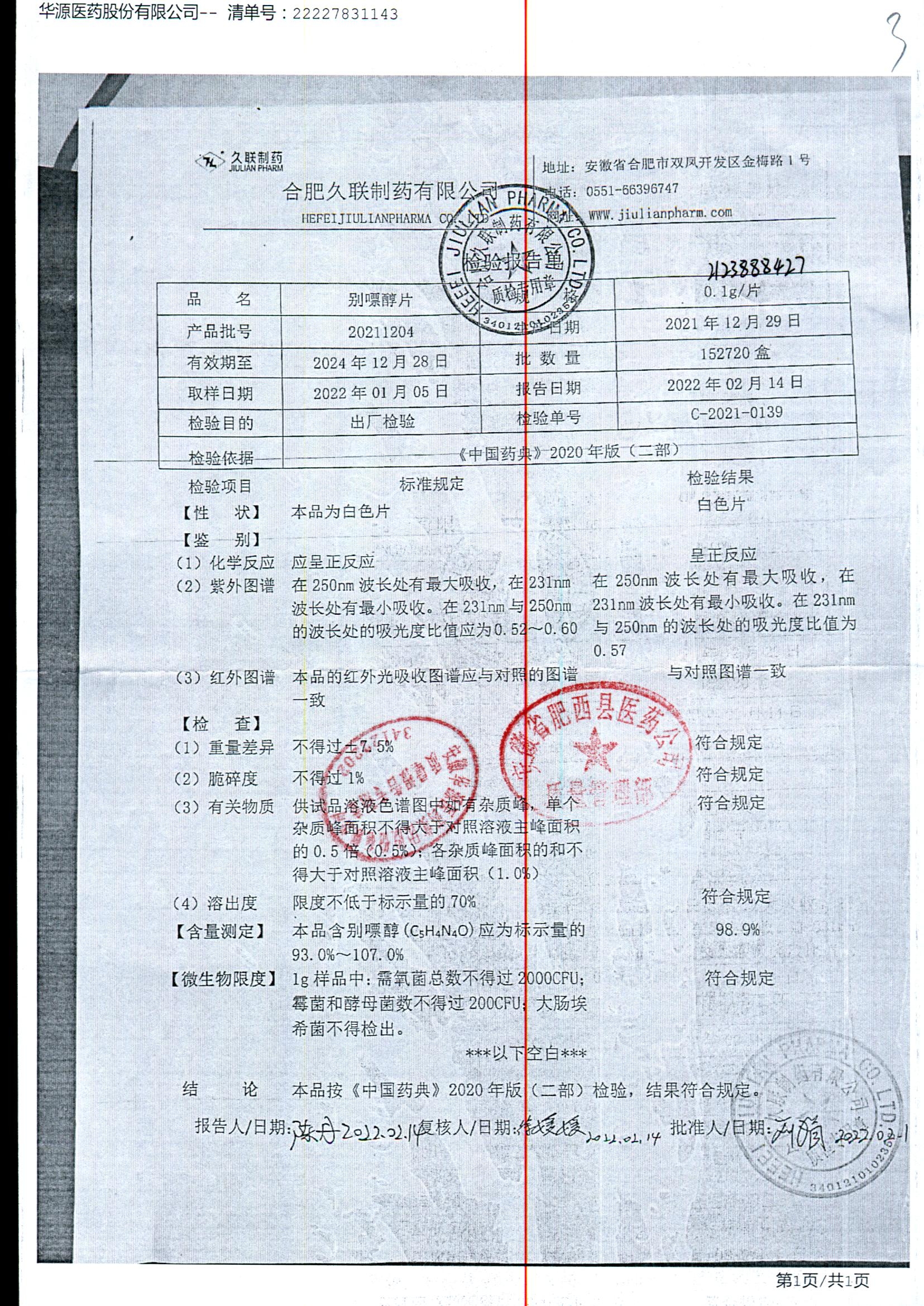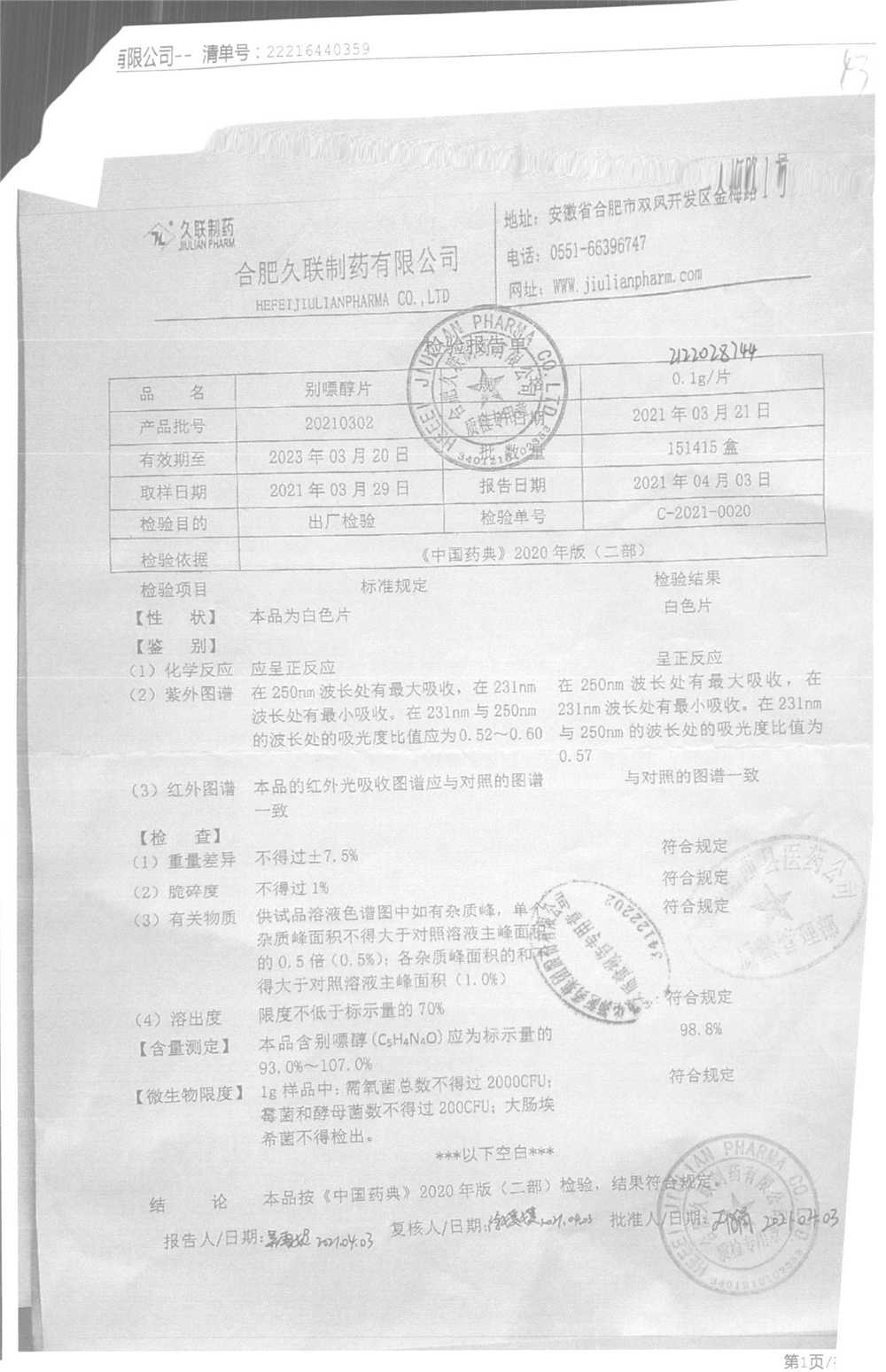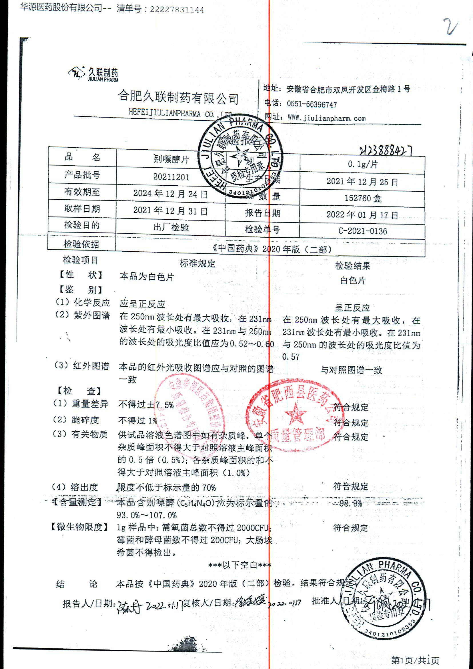 别嘌醇片 | 0.1g | 20220202 | 查看详情 |