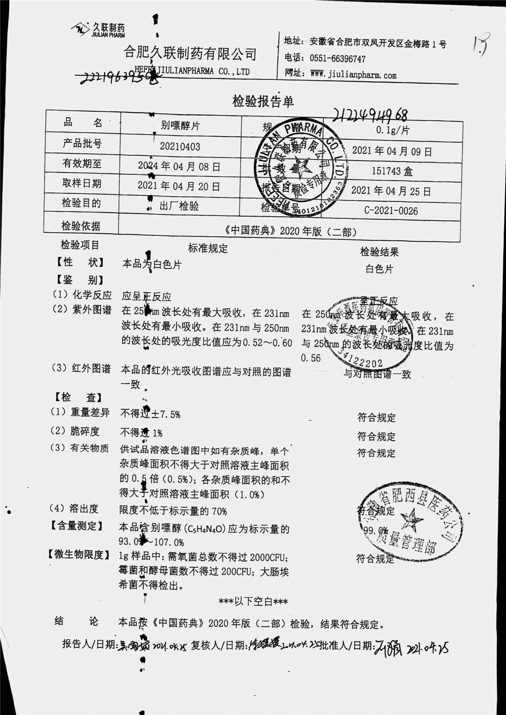 别嘌醇片 | 0.1g | 20210704 | 查看详情 |