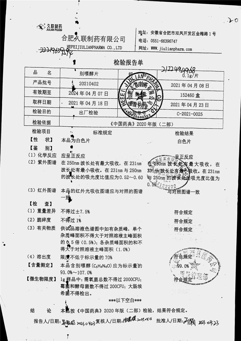 别嘌醇片 | 0.1g | 20210402 | 查看详情 |