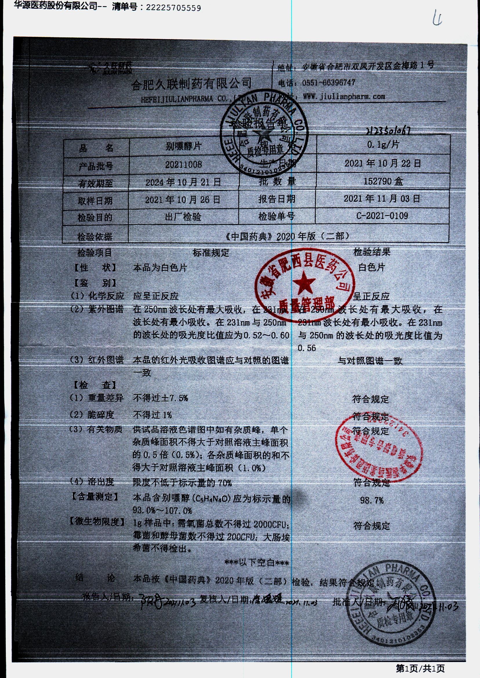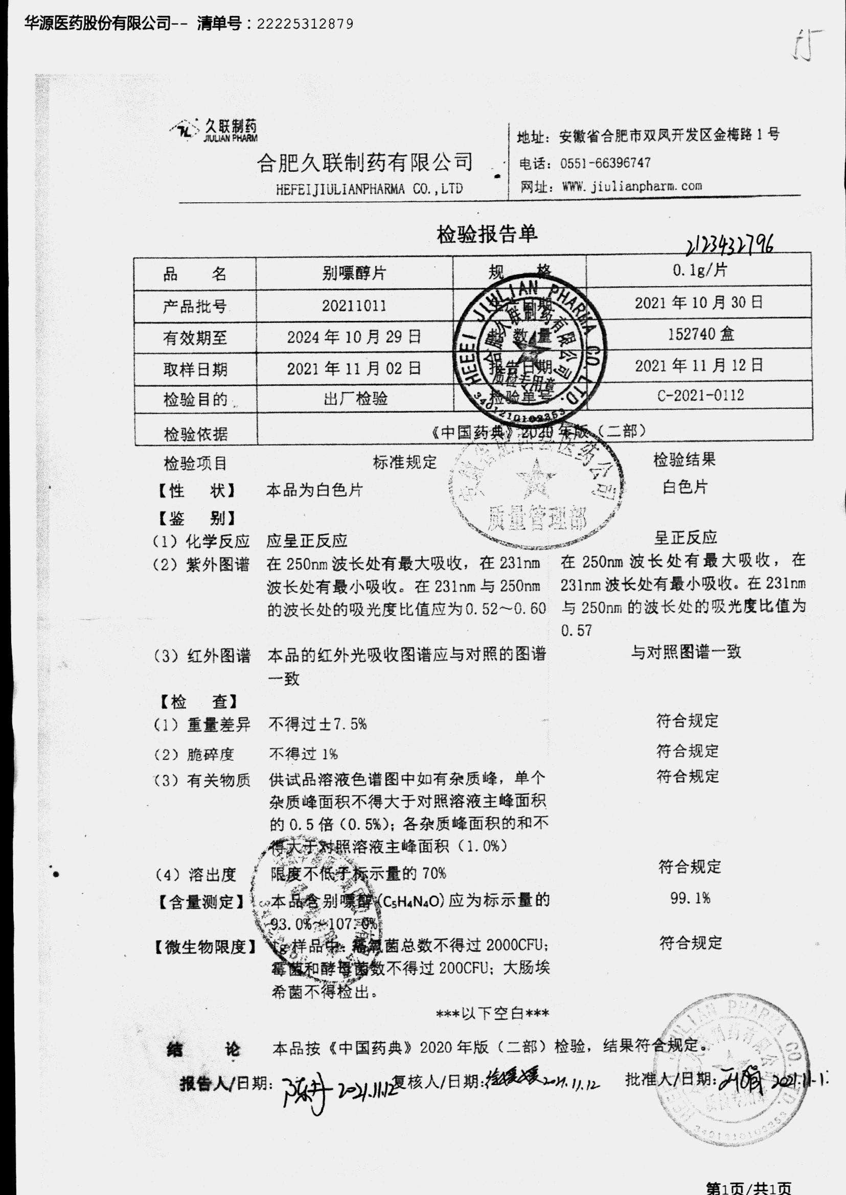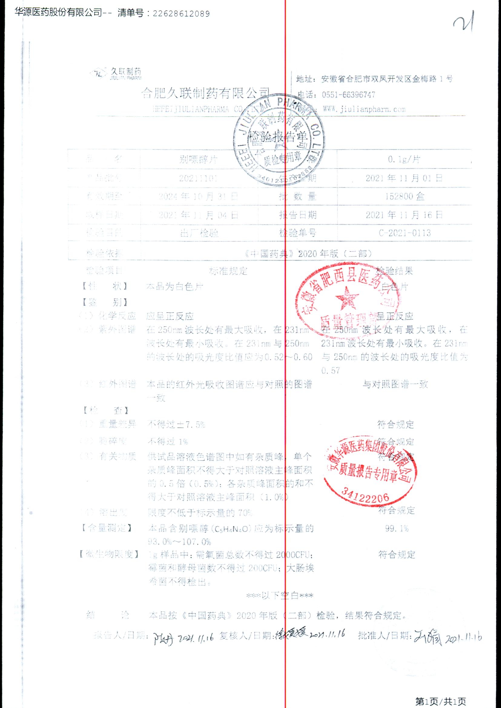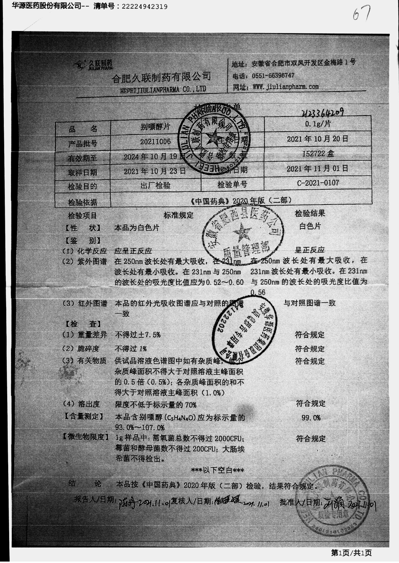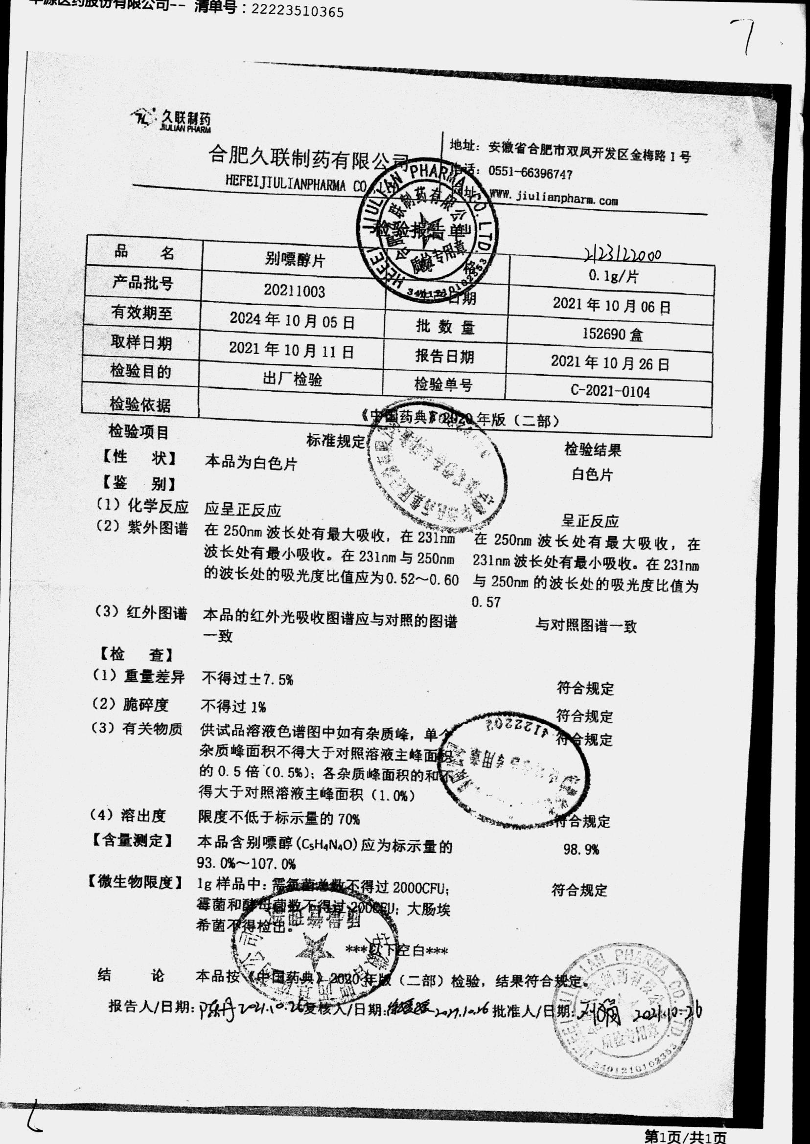 别嘌醇片 | 0.1g | 20211101 | 查看详情 |