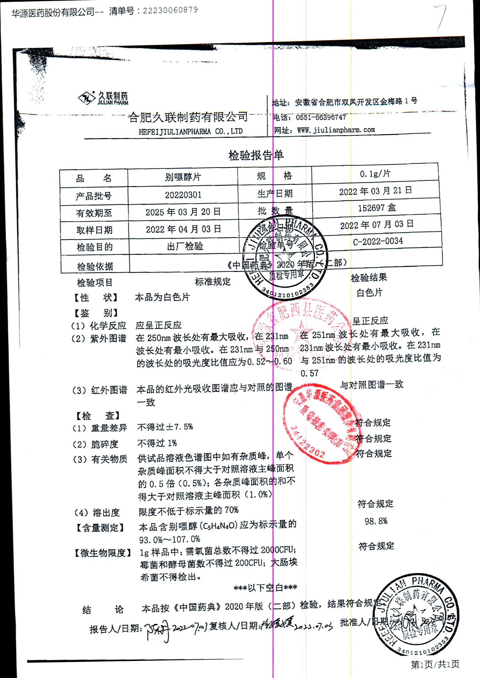 别嘌醇片 | 0.1g | 20220701 | 查看详情 |