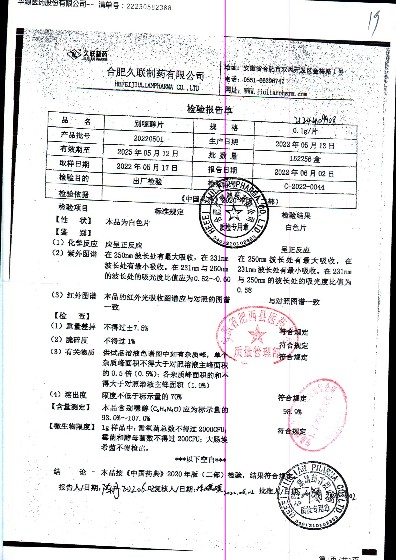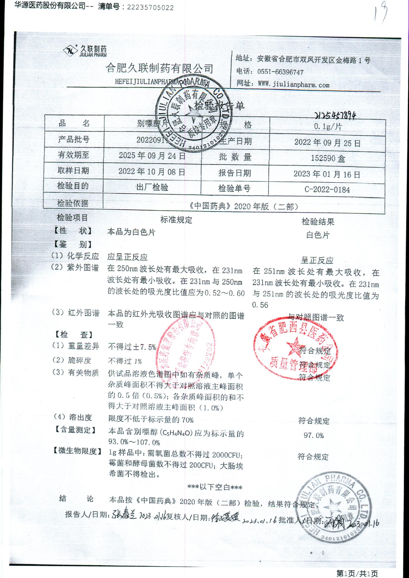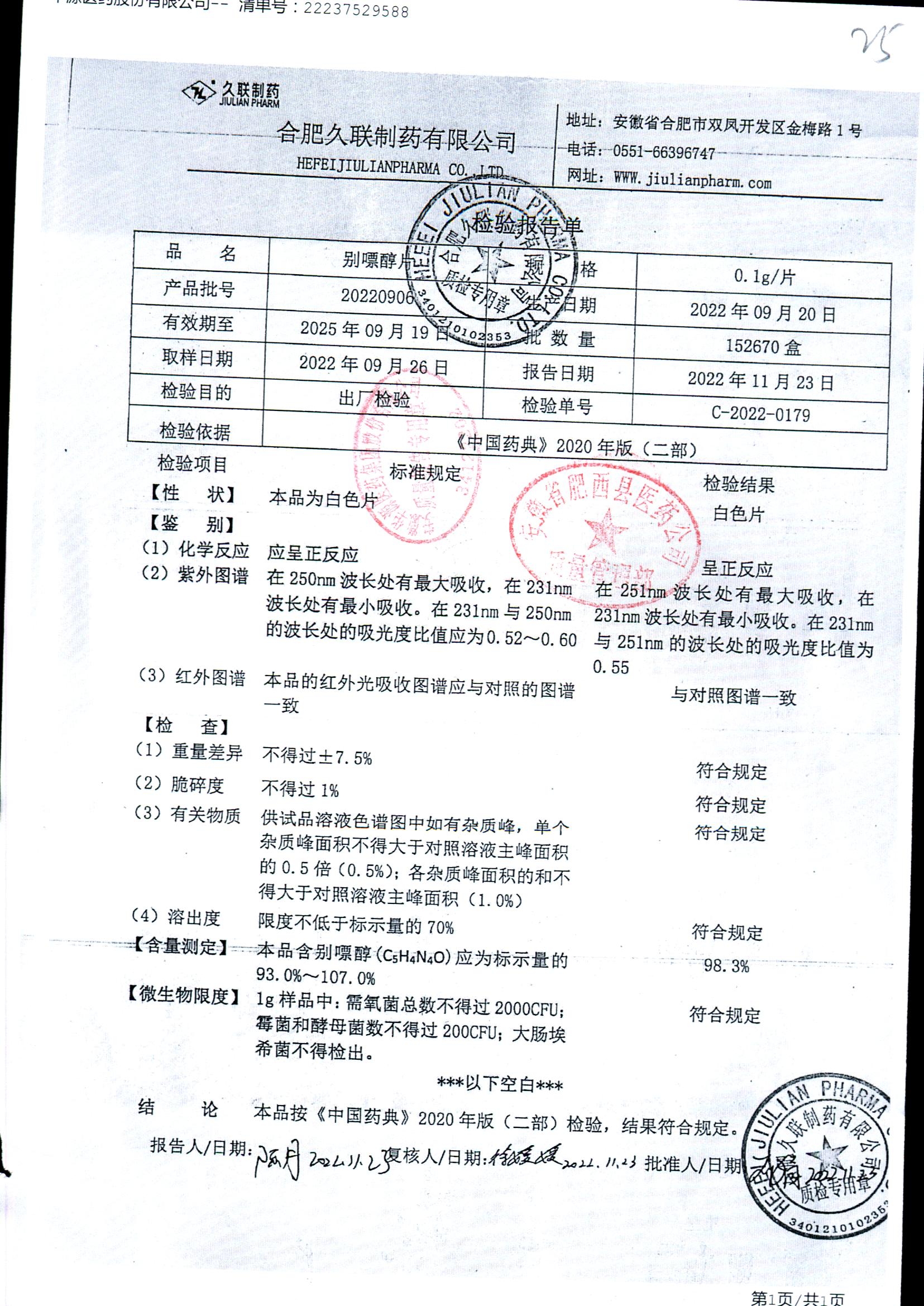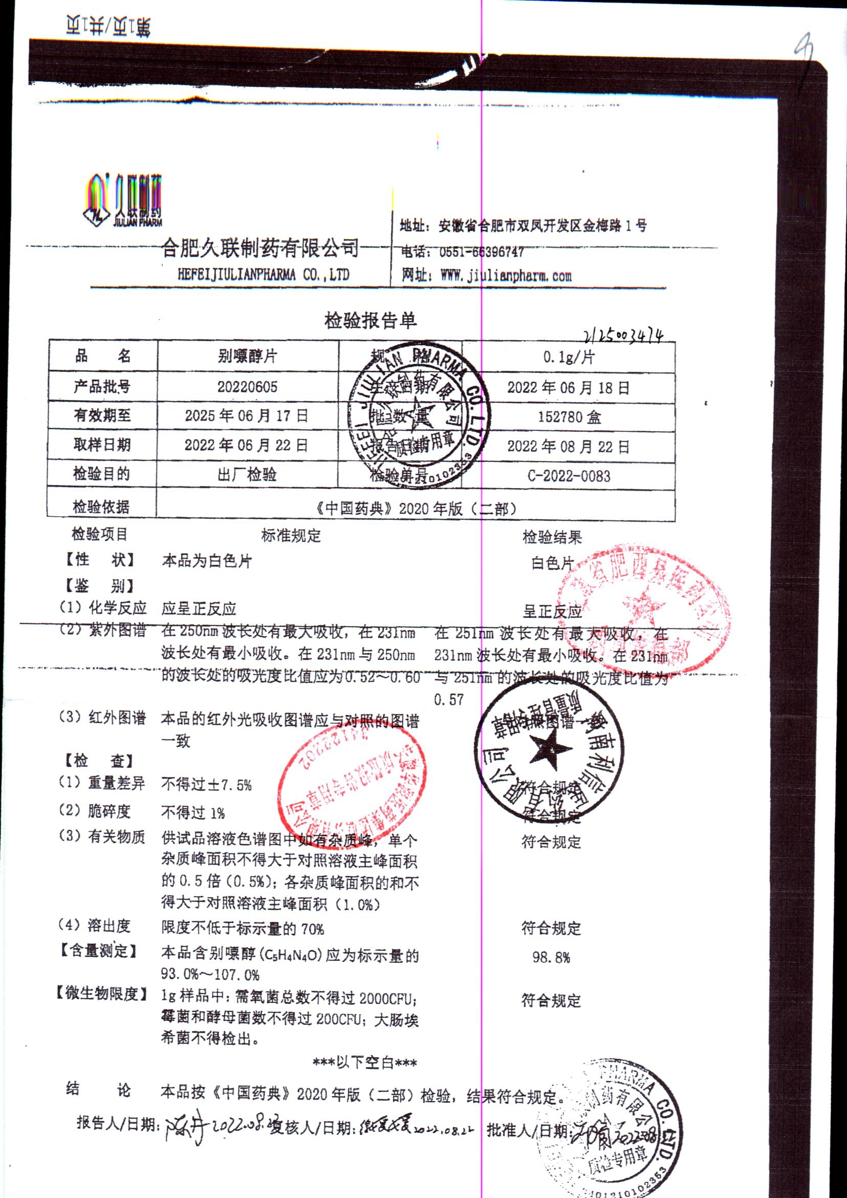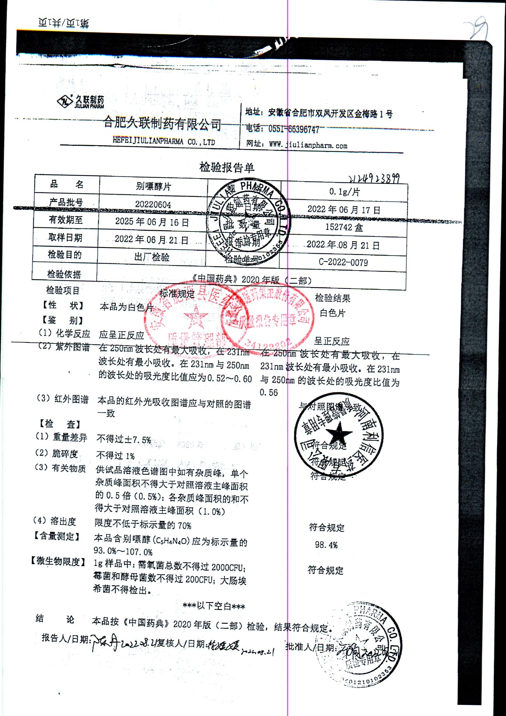 别嘌醇片 | 0.1g | 20220605 | 查看详情 |