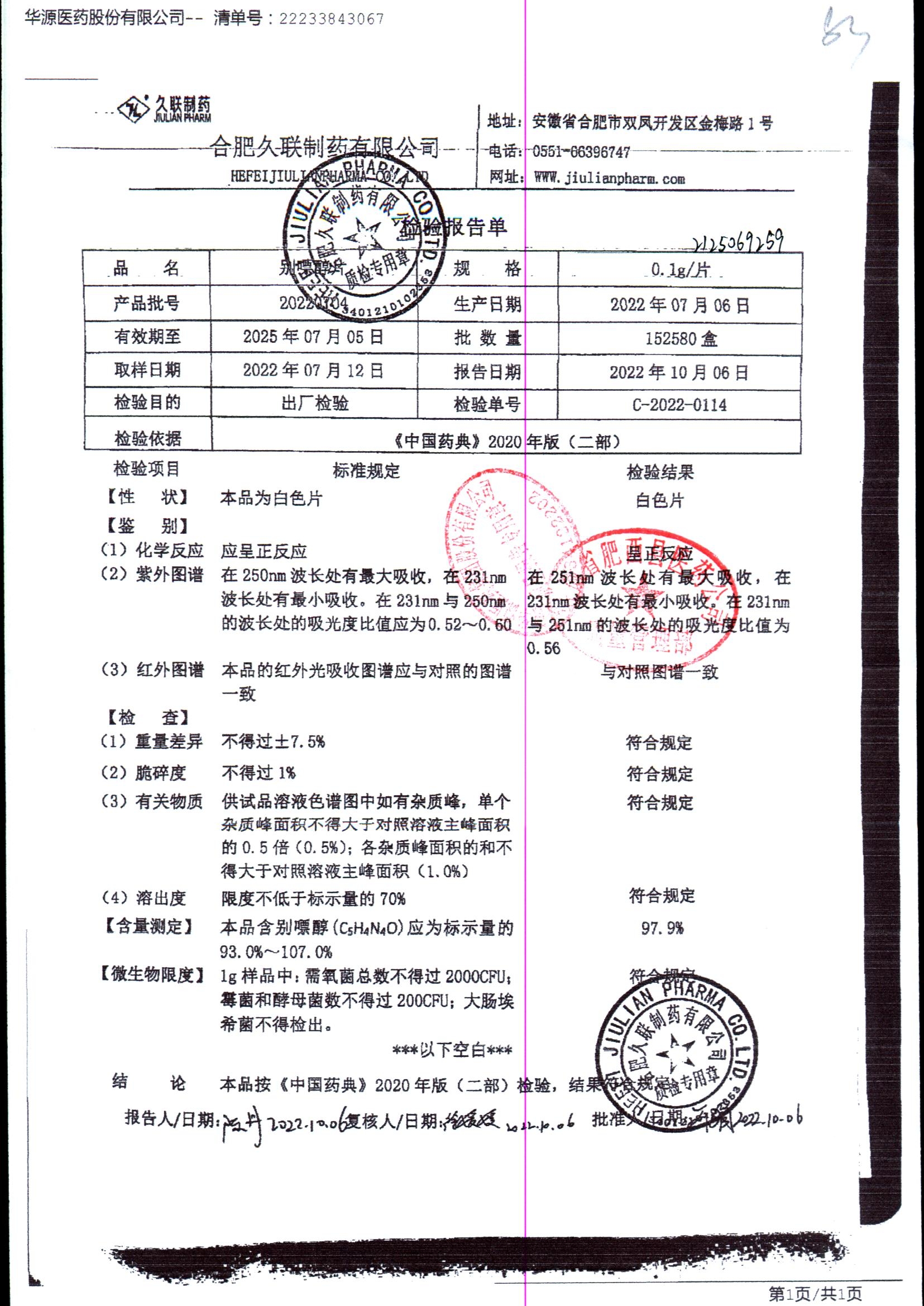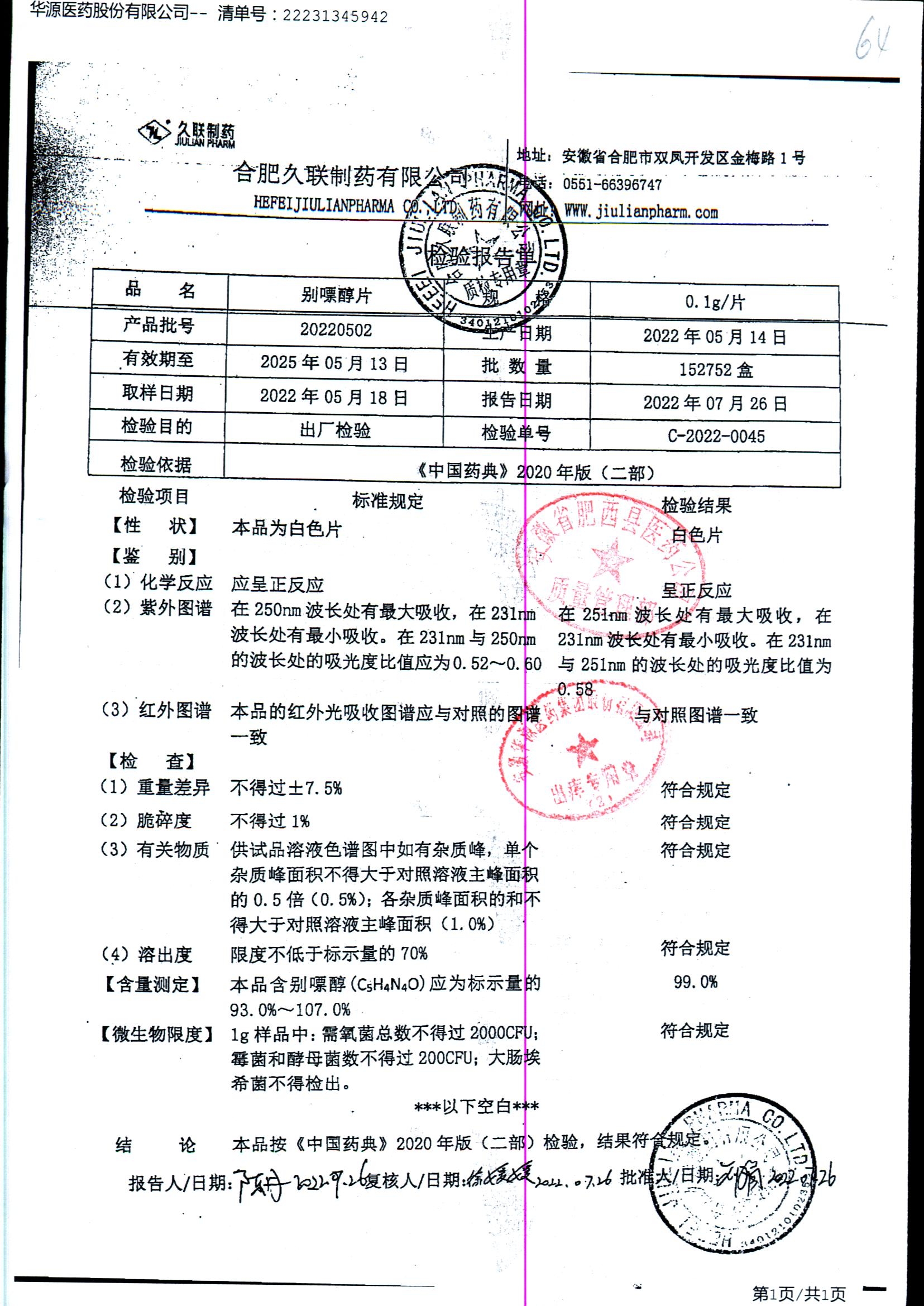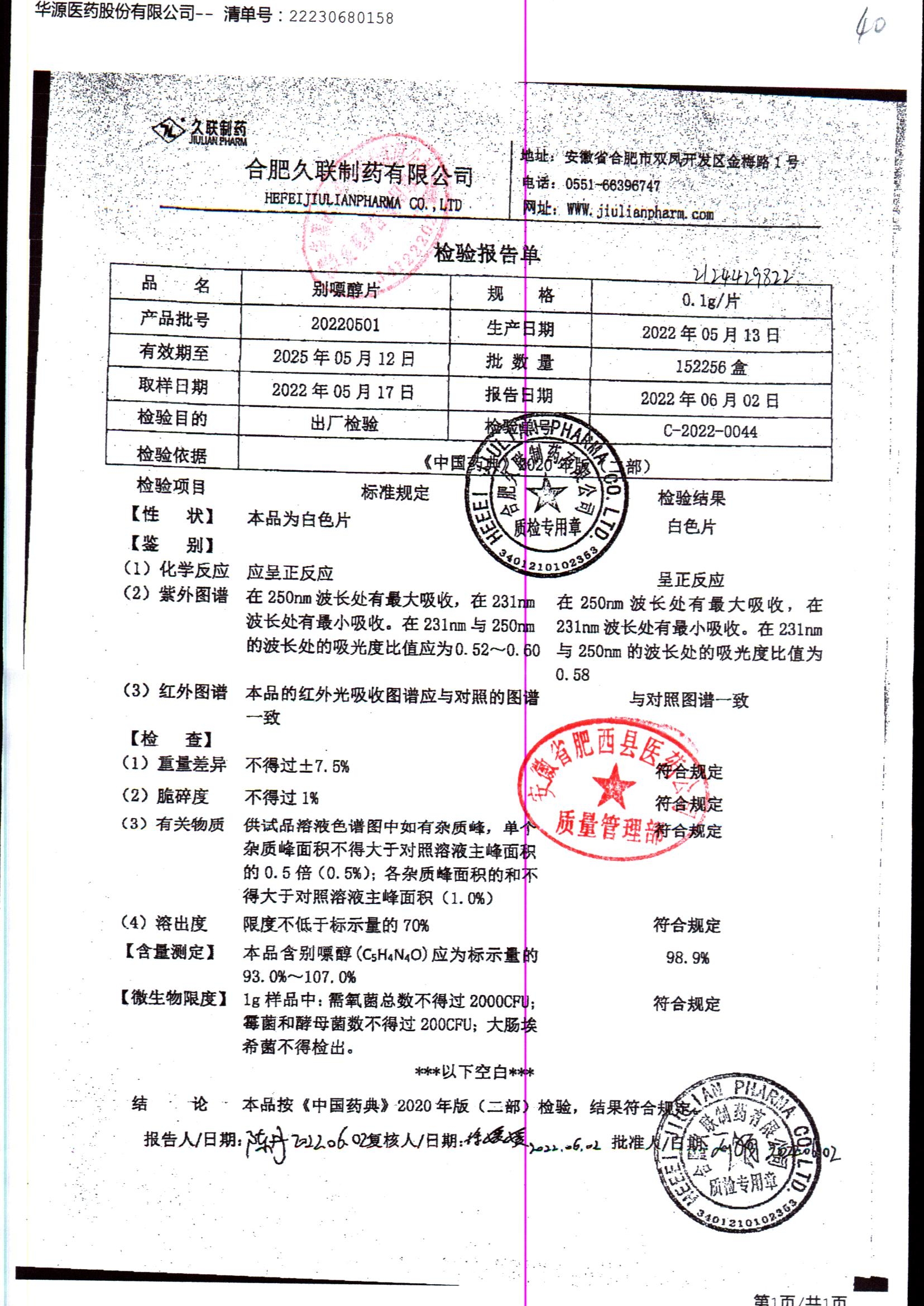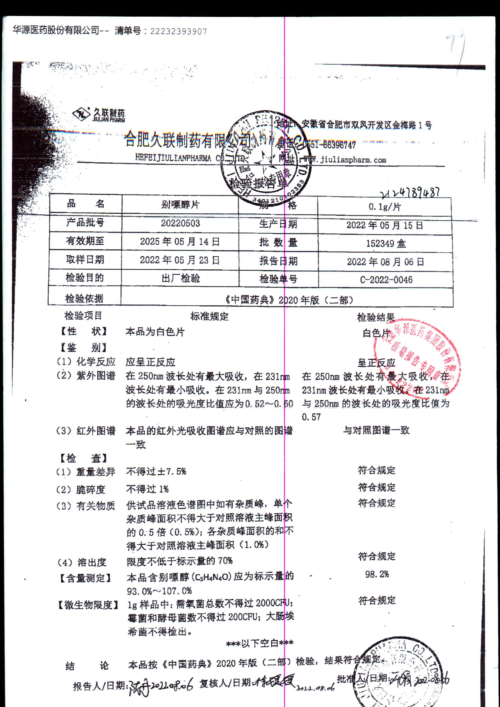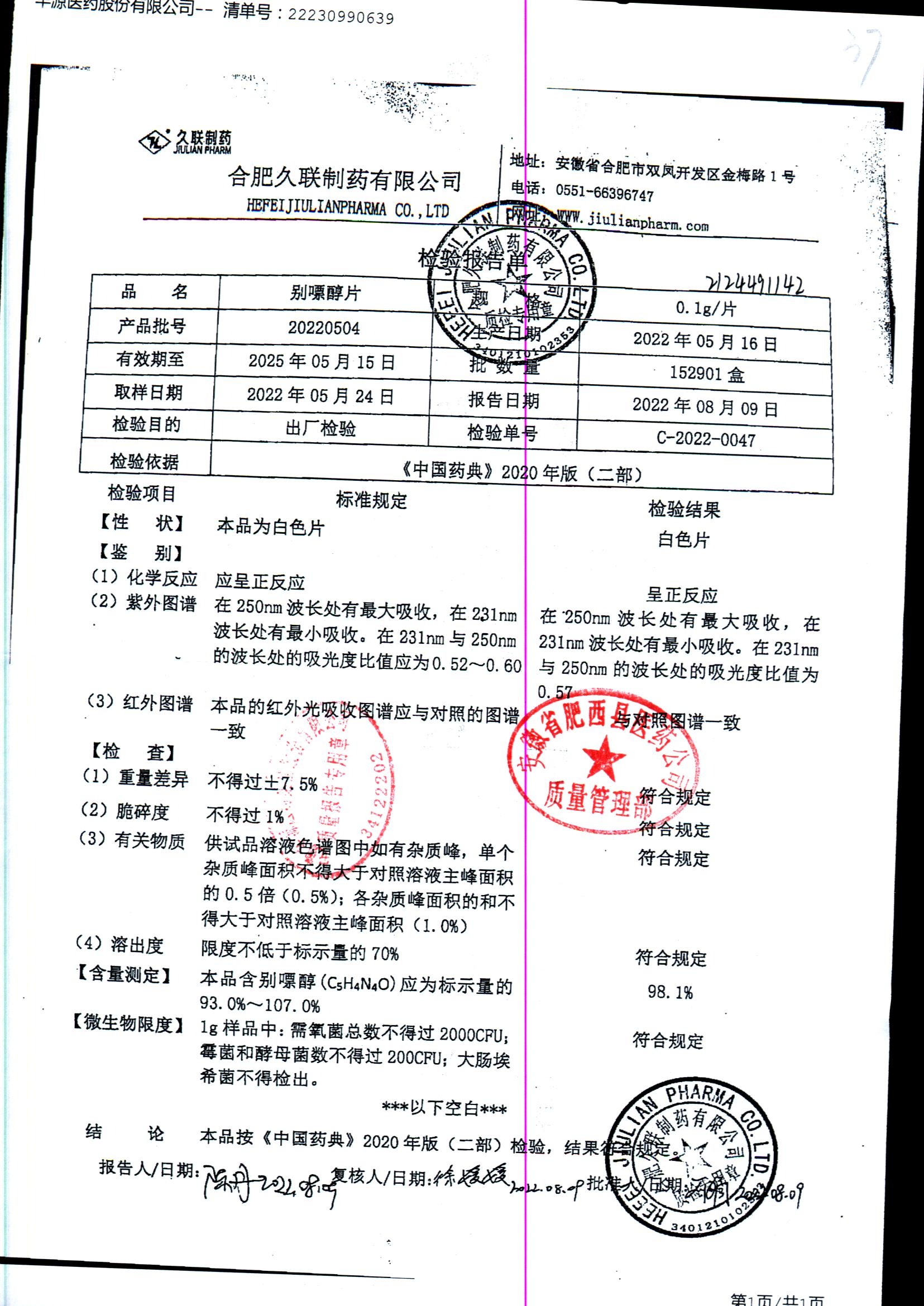 别嘌醇片 | 0.1g | 20220502 | 查看详情 |