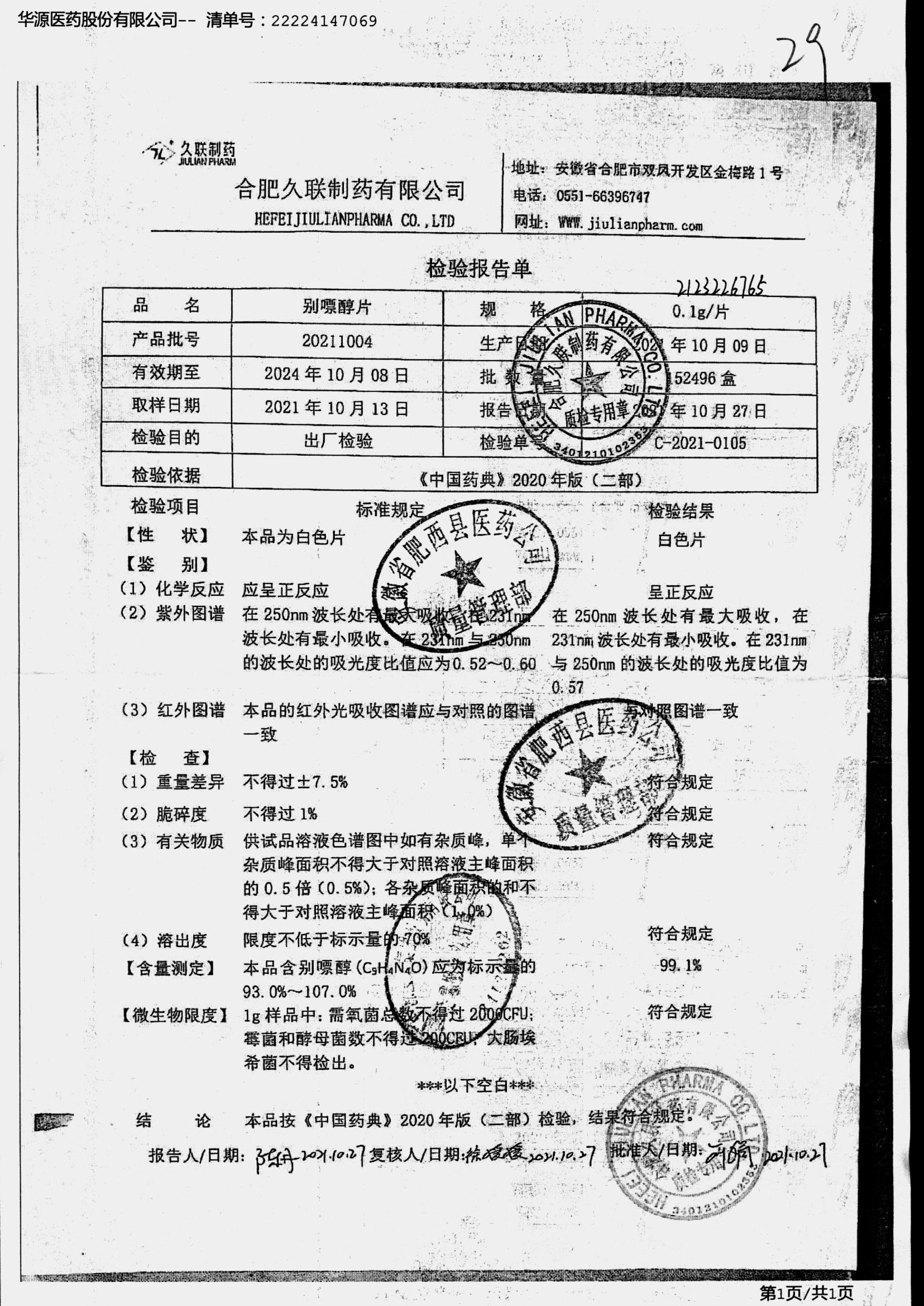 别嘌醇片 | 0.1g | 20211011 | 查看详情 |