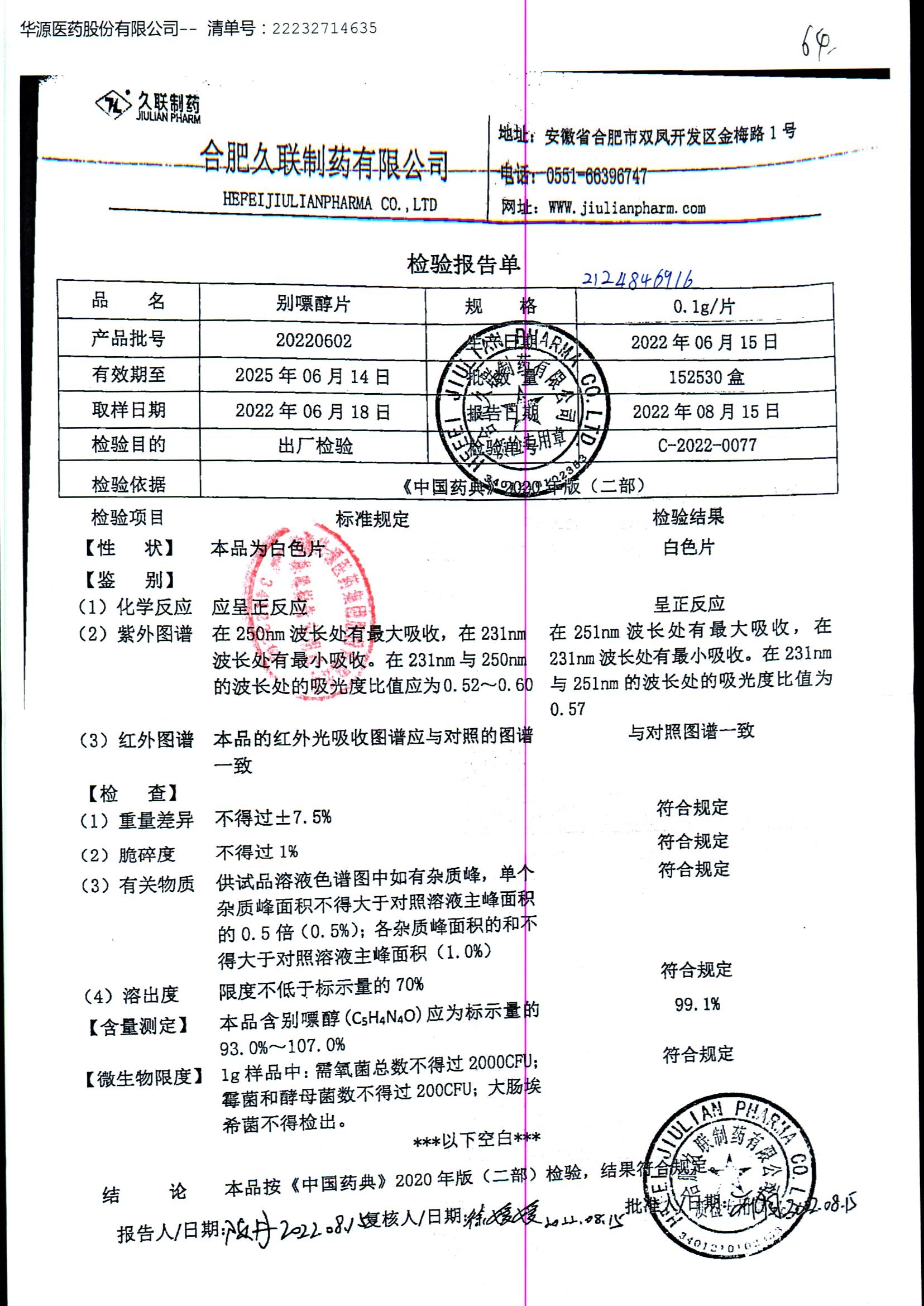 别嘌醇片 | 0.1g | 20220602 | 查看详情 |