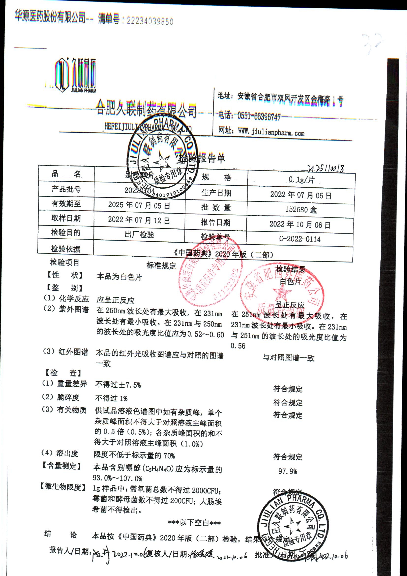 别嘌醇片 | 0.1g | 20220908 | 查看详情 |