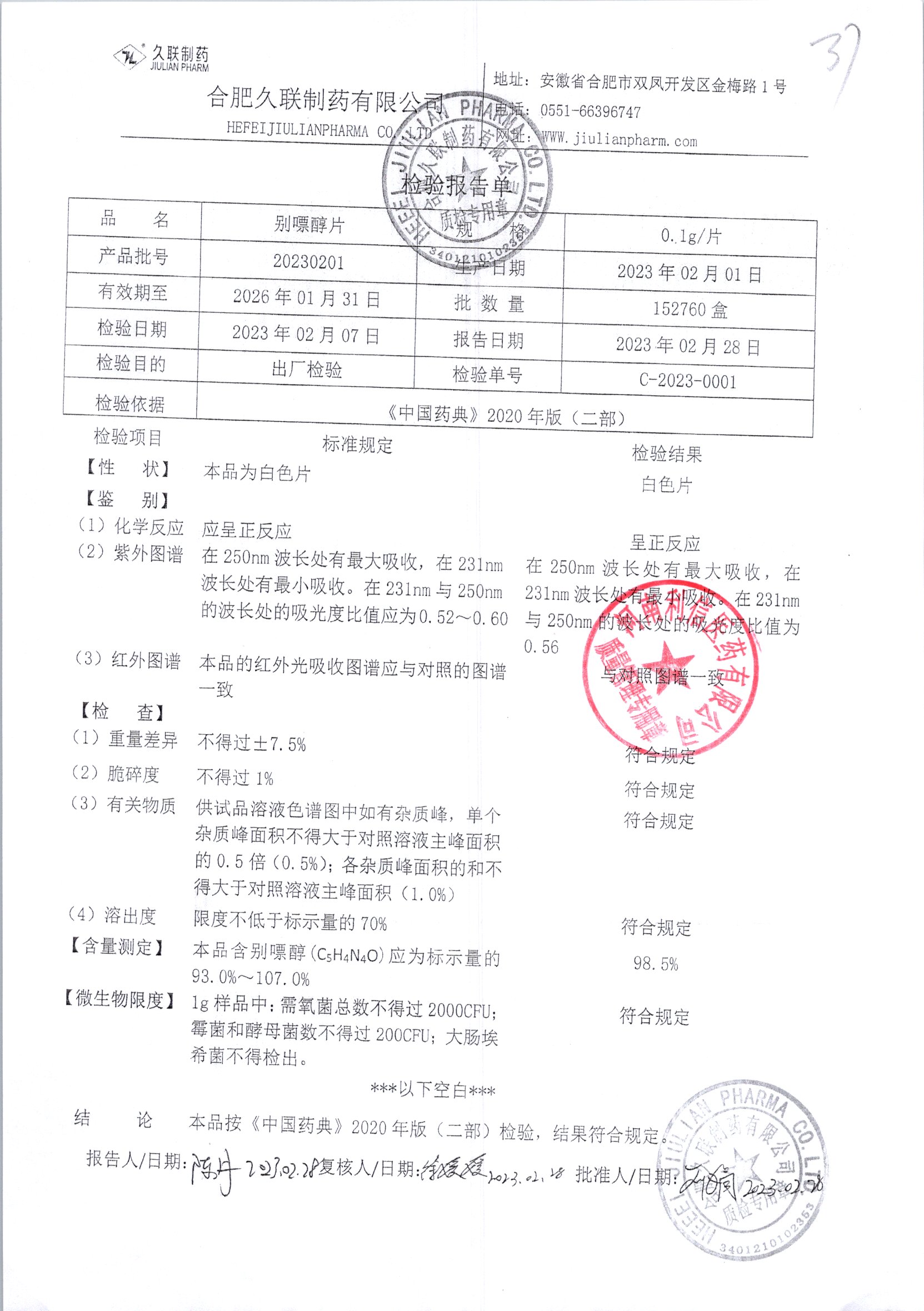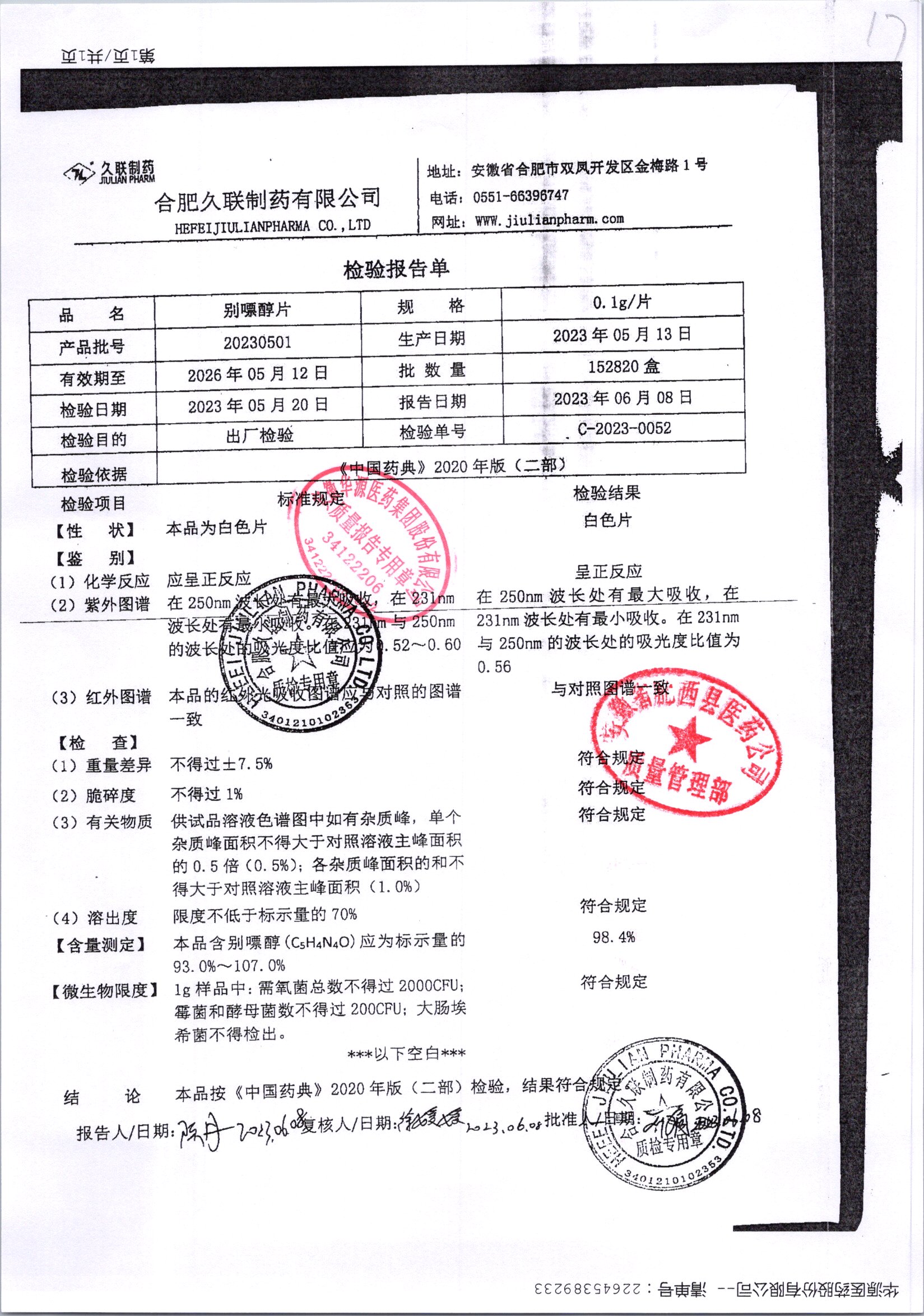 别嘌醇片 | 0.1g | 20230201 | 查看详情 |